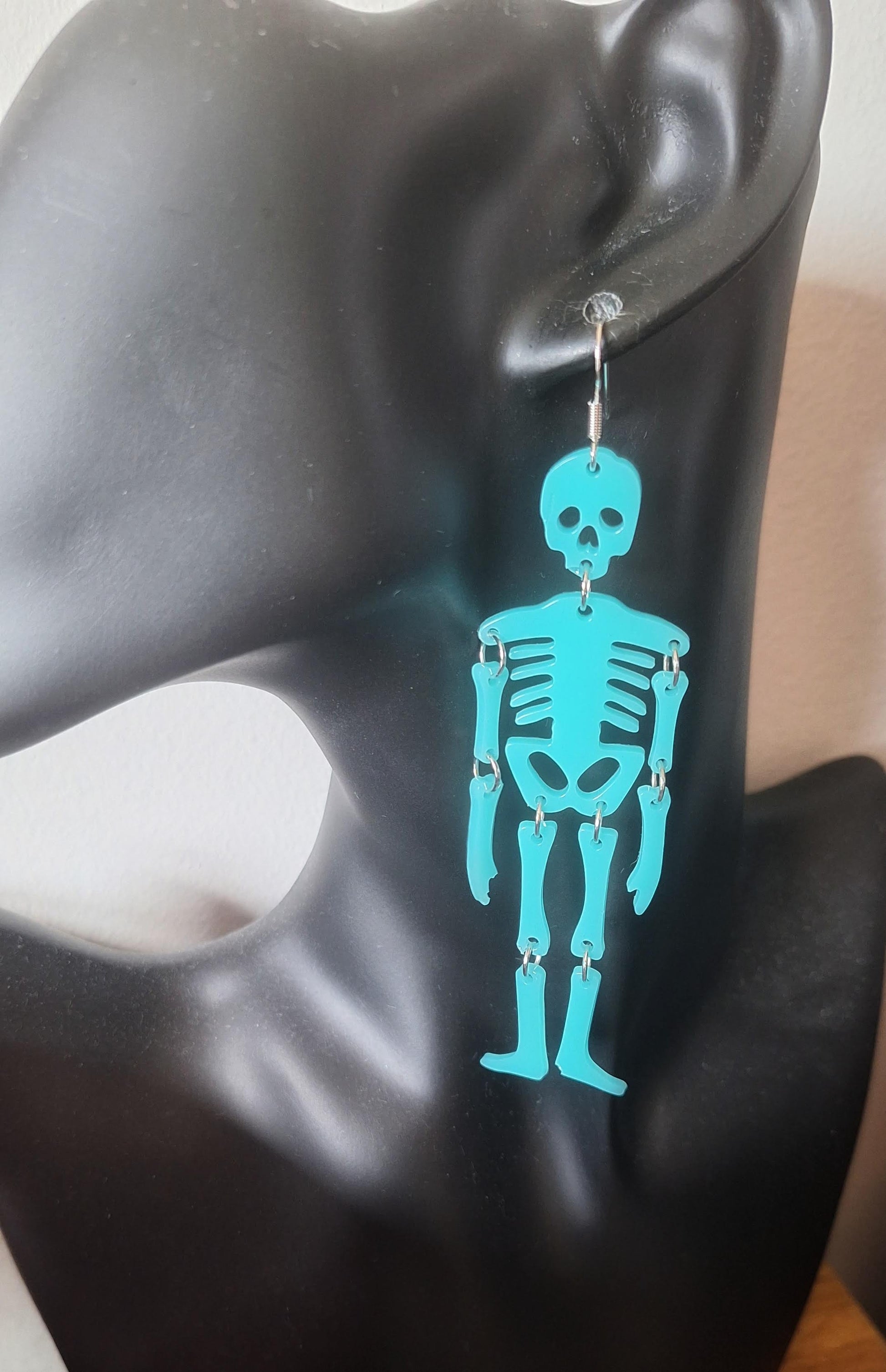 Add some sass to your style with these one-of-a-kind handmade Articulated Skeleton Earrings. Featuring a 90mm long resin skeleton, these quirky earrings are available in either holographic purple sparkle or turquoise (suspended from sterling silver ear wires) or shocking pink sparkle with gold-plated ear wires.. A playful addition to any outfit!