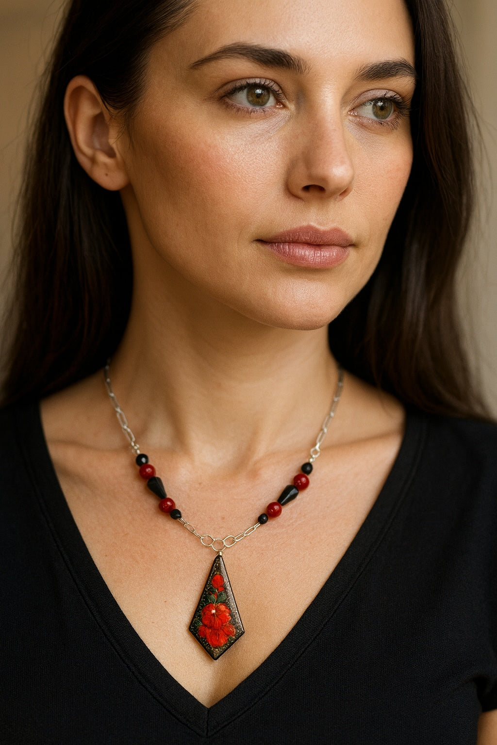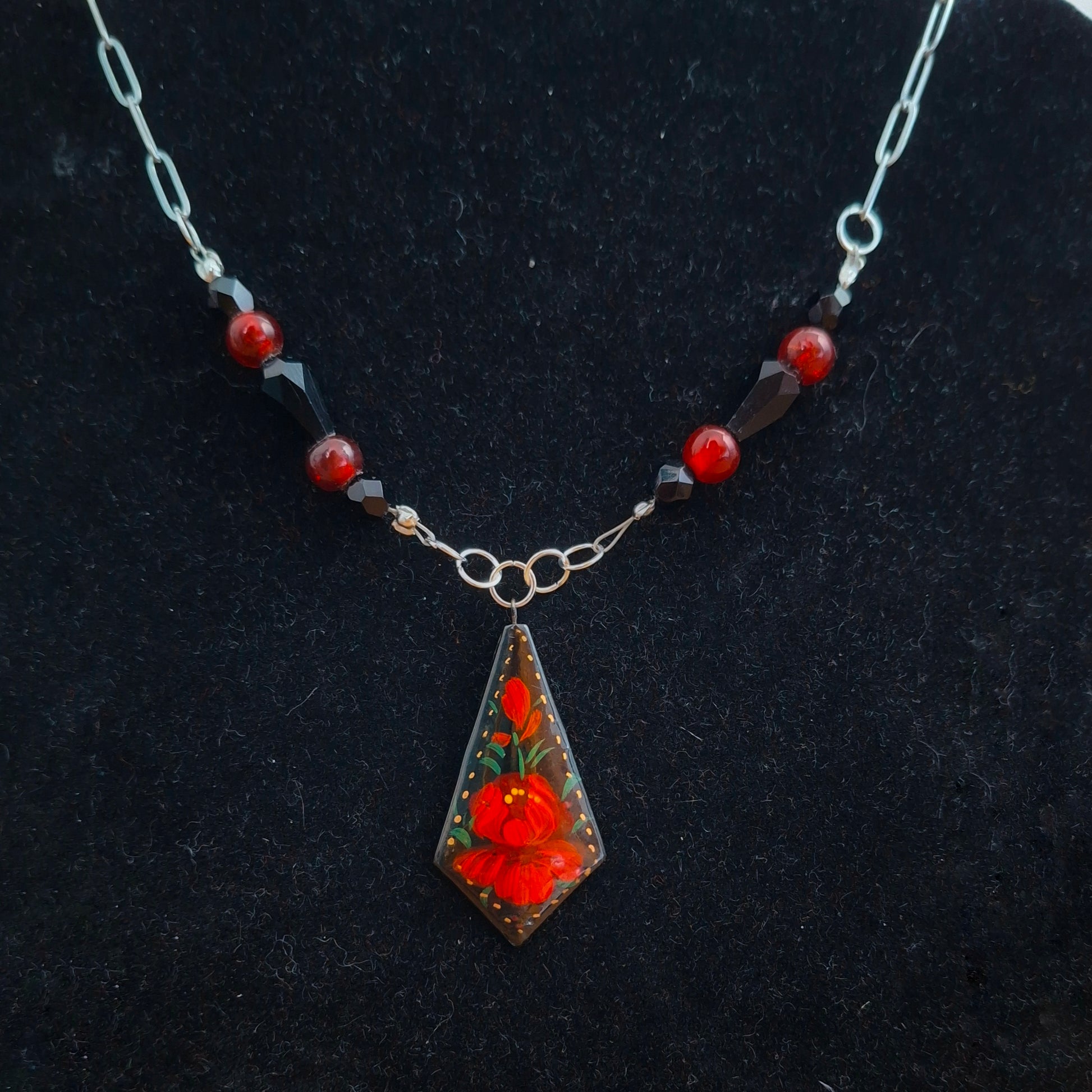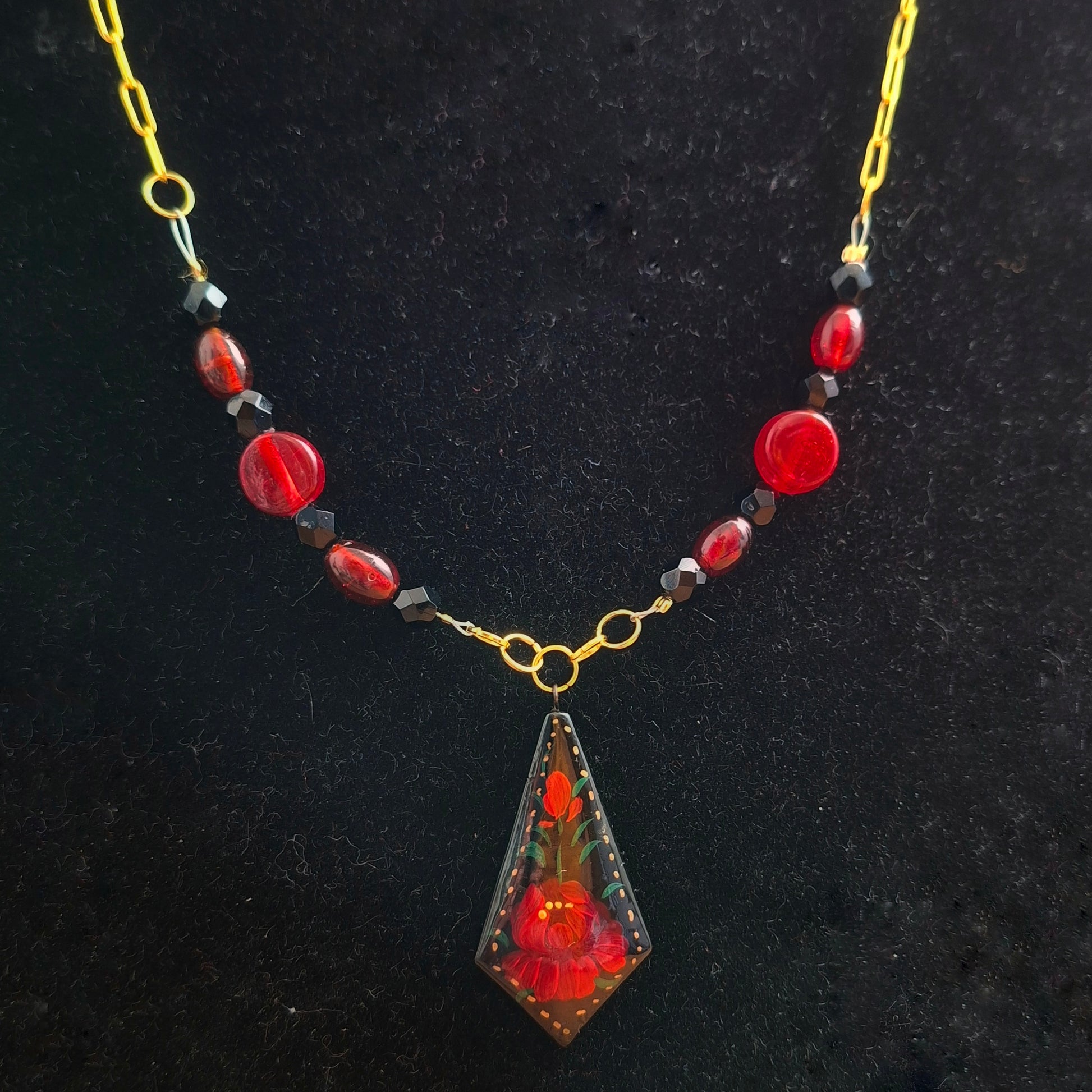 one-of-a-kind necklace, repurposed jewellery, vintage glass bead necklace, hand-painted pendant, folk art necklace, gothic floral necklace, handmade Irish jewellery, sustainable jewellery Ireland, black and red necklace, unique statement necklace, upcycled jewellery, Black Forest Bloom necklace