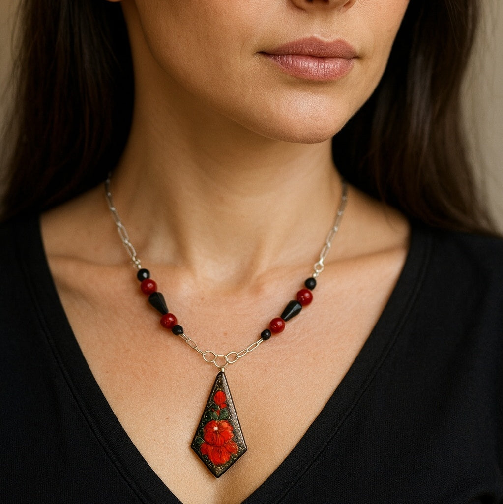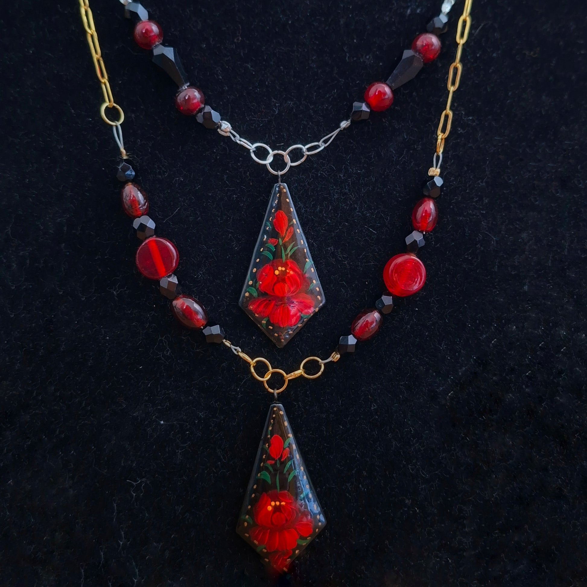 Handmade from repurposed hand-painted wooden earrings, each pendant features bold crimson florals on deep black — like something you’d find in a tiny antique shop hidden in the woods… probably run by a witch with great taste. Paired with repurposed vintage glass beads in rich reds and inky blacks, these necklaces have all the glamour of old-world folk art with a modern, moody twist.