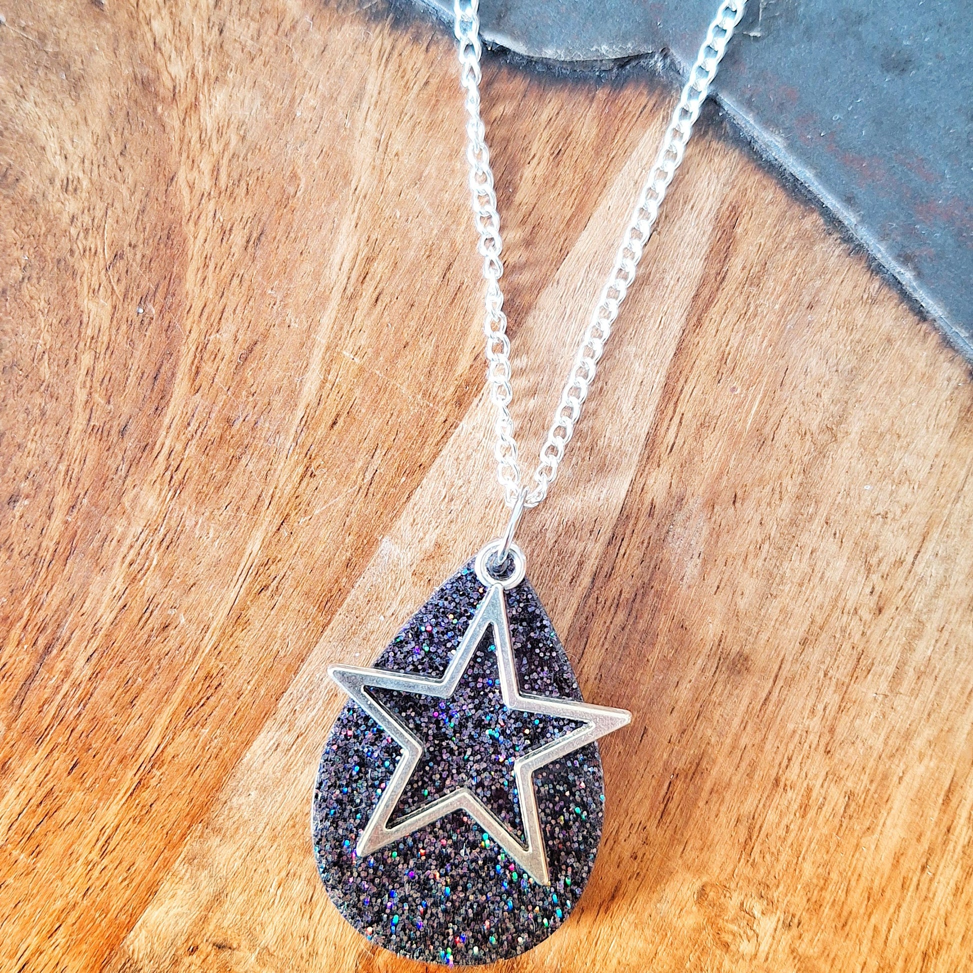 Blackstar necklace, black holographic resin necklace, silver star charm necklace, silver-plated chain necklace, statement jewellery, handmade artisan necklace, bold statement necklace, cosmic inspired necklace, music inspired jewellery, limited edition necklace