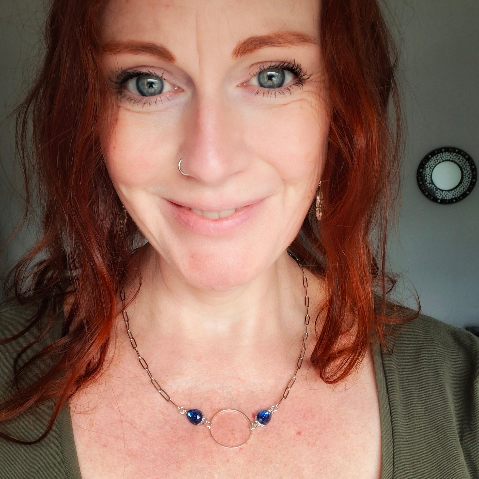 handmade necklace, repurposed jewellery, blue teardrop necklace, stainless steel chain, one of a kind necklace, Irish jewellery maker, sustainable jewellery, handmade in Ireland, statement circle necklace, elegant blue necklace