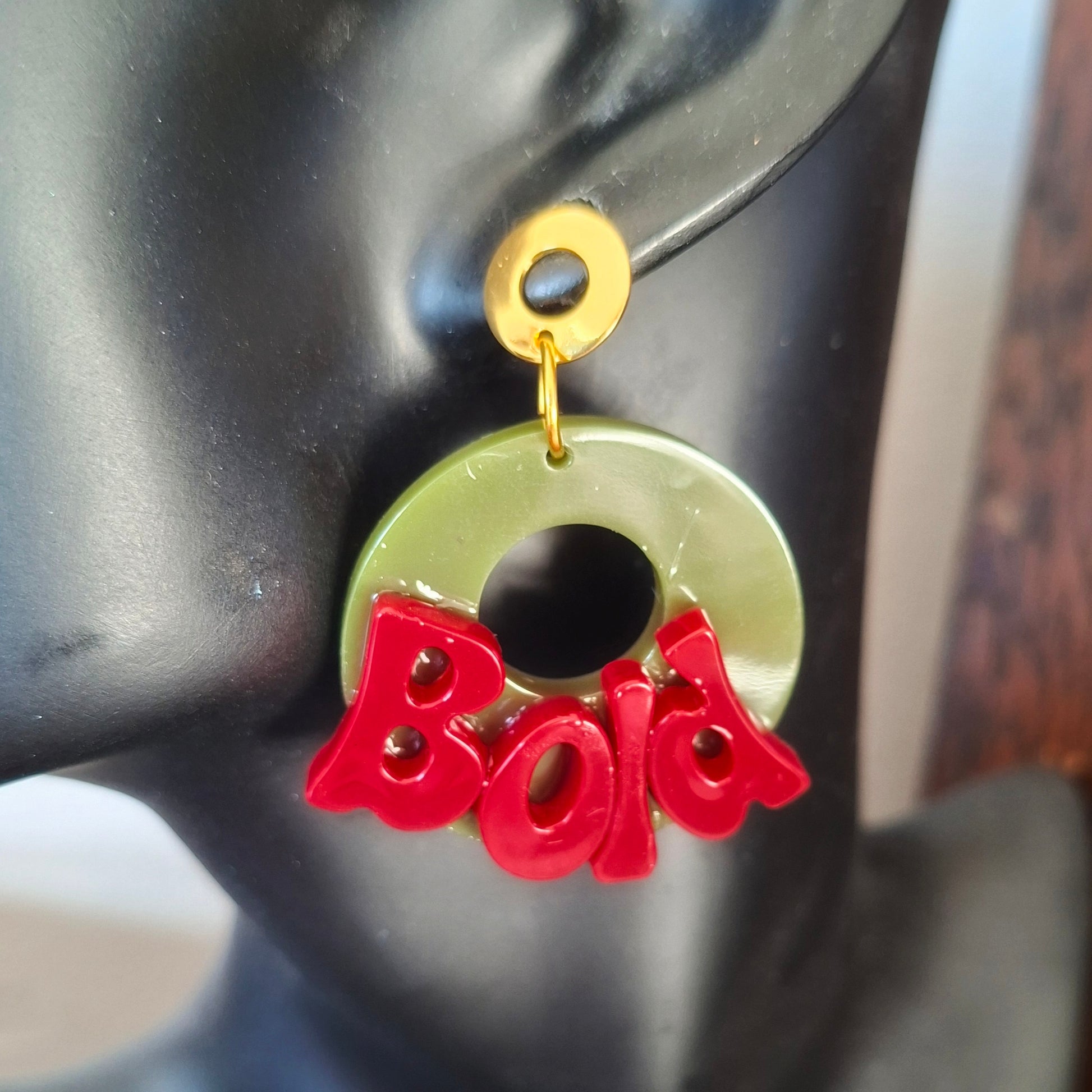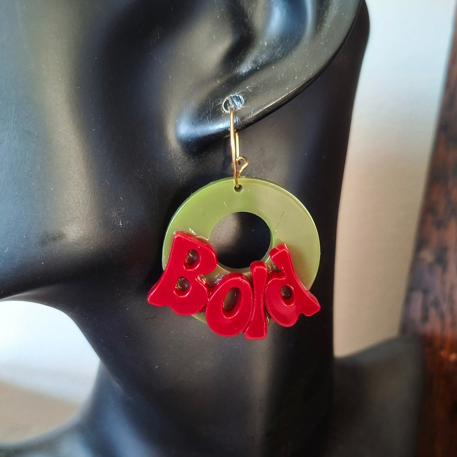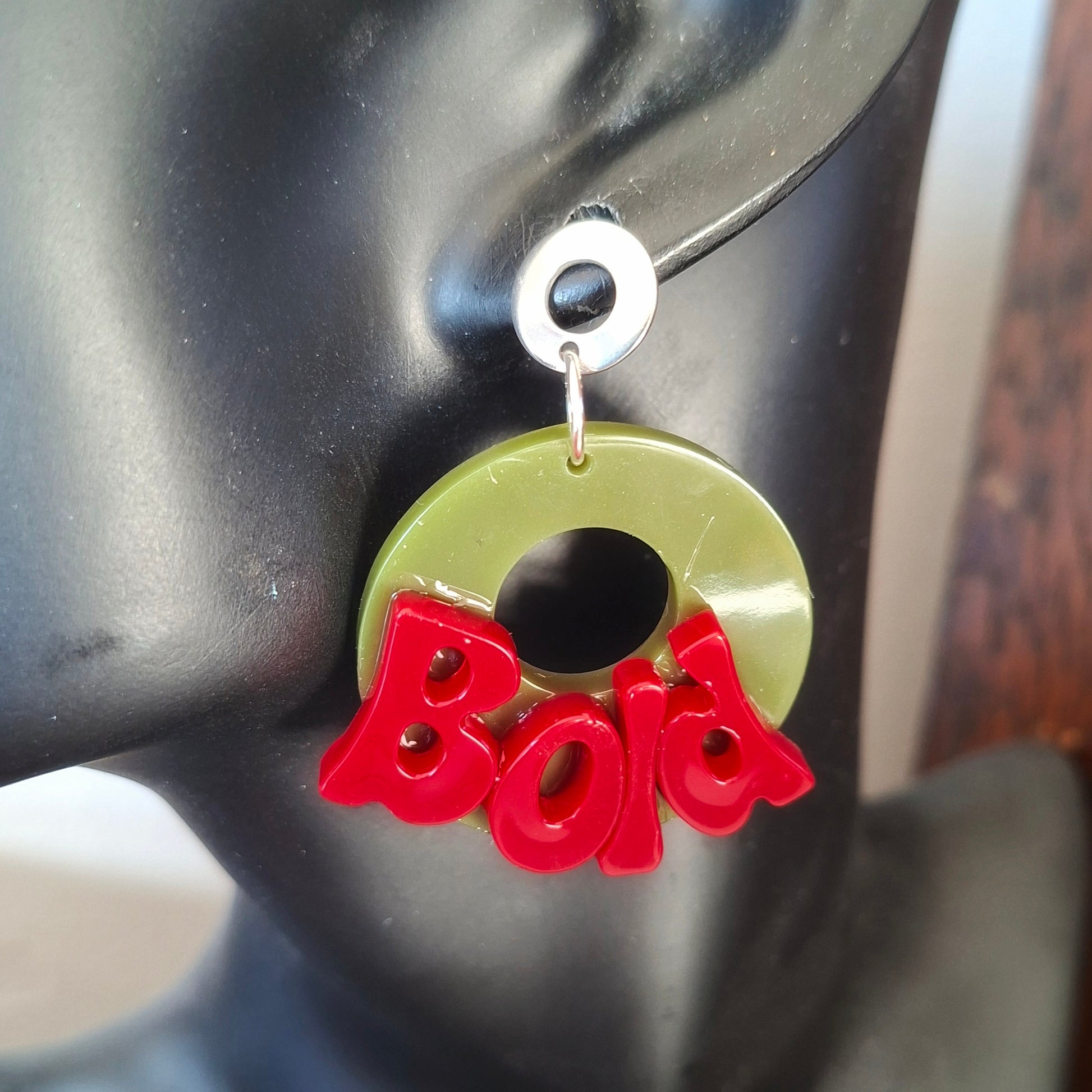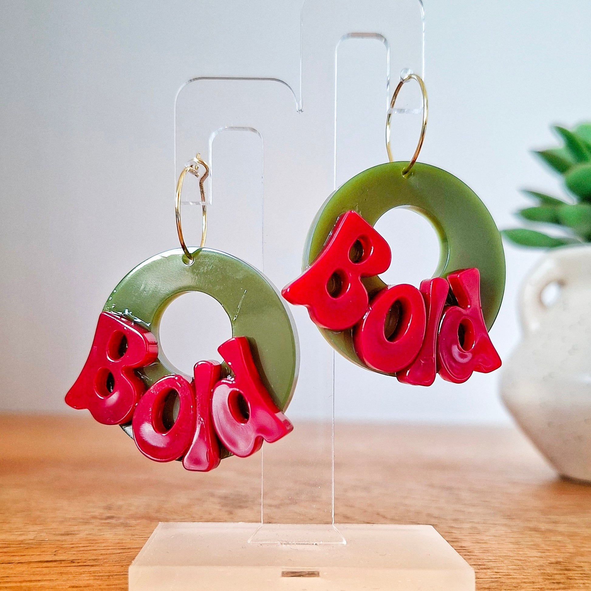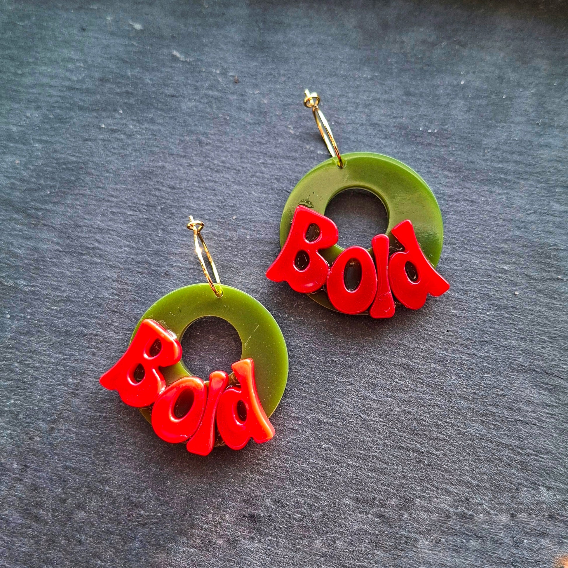 So, apparently one pair of Bold earrings wasn’t enough. Enter the Bold Again Earrings – because sometimes you just need to double down. We’re talking a glossy olive green hoop, chunky retro red lettering that literally shouts “Bold”, and your choice of gold-plated or silver-plated 15mm hoops.