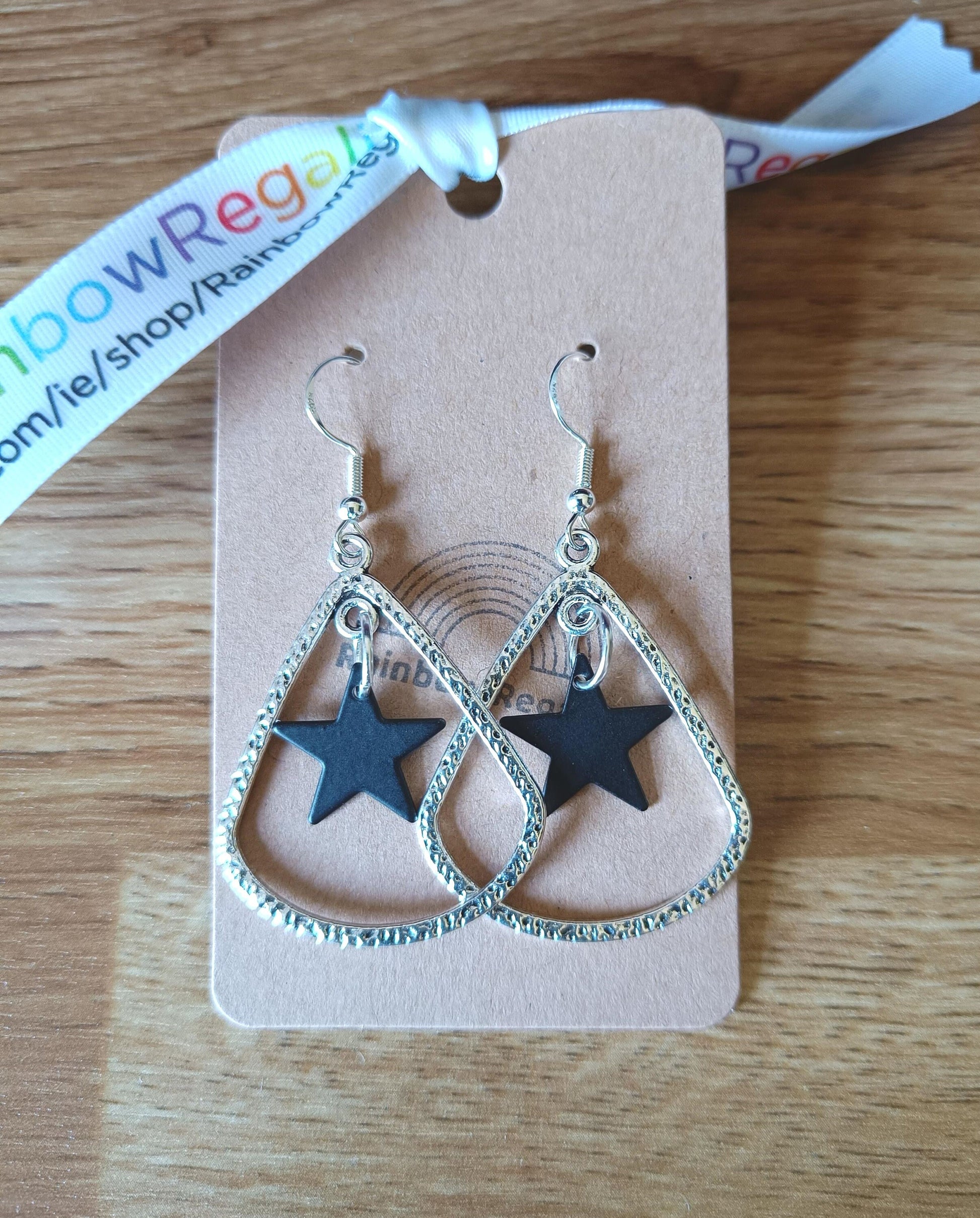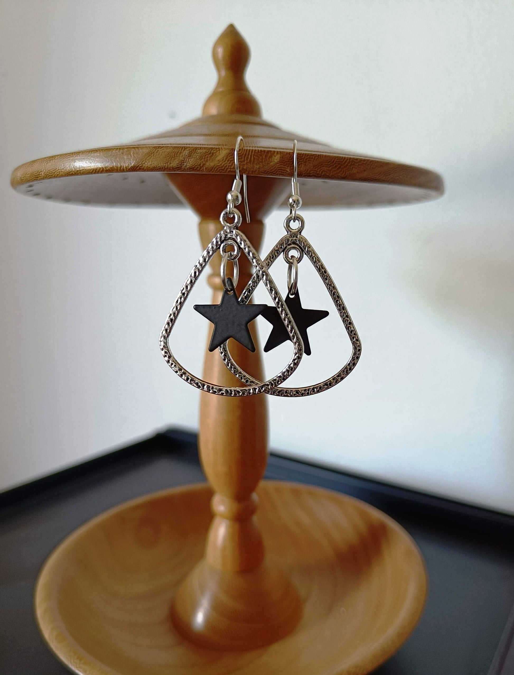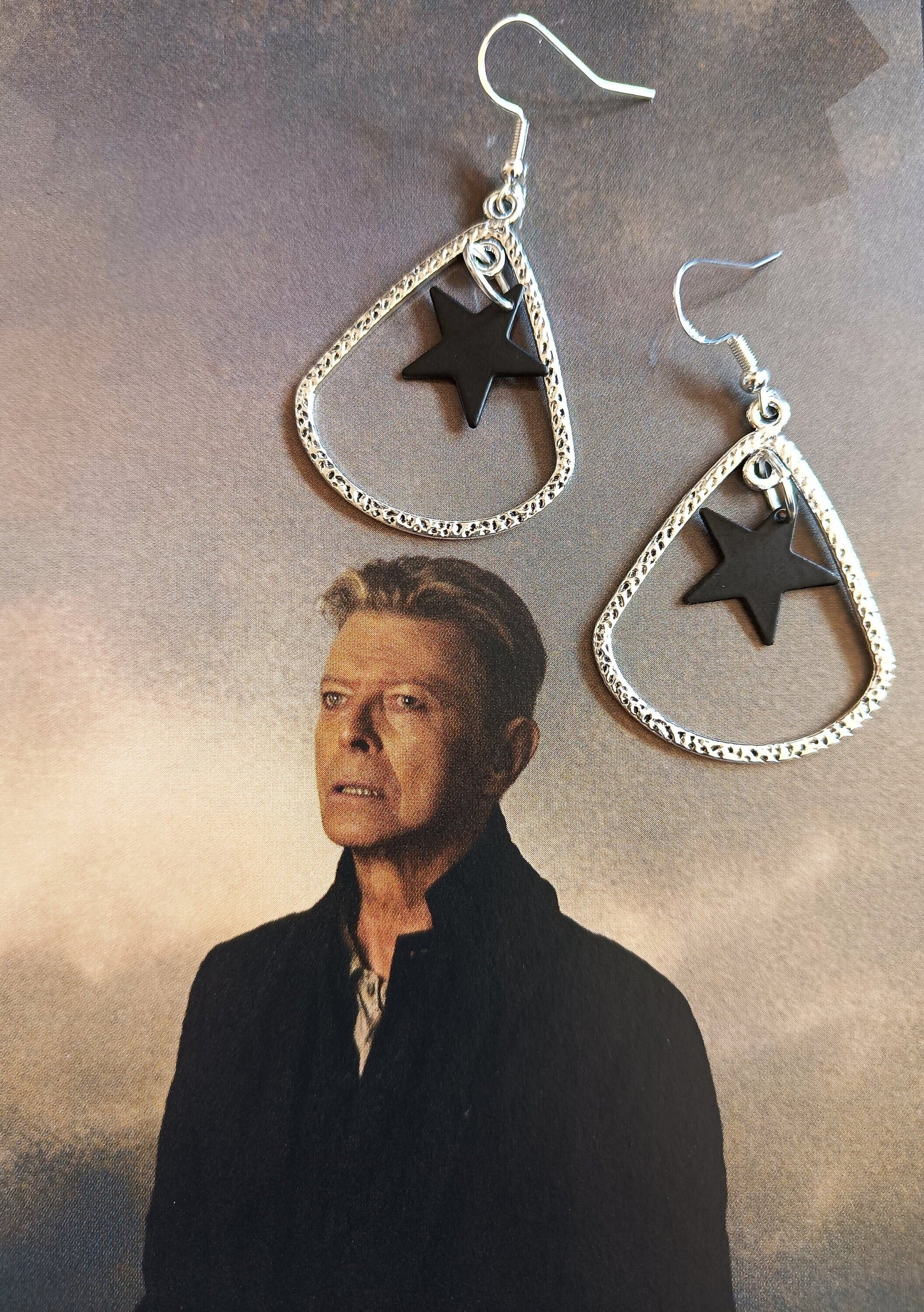 Immerse yourself in the mystique of David Bowie's "Blackstar" album with our earrings inspired by this iconic masterpiece. These unique earrings feature black plated stars gracefully nestled inside silver teardrop pendants, meticulously crafted from antique silver plate—a lead-free and nickel-free metal zinc alloy. Suspended from sterling silver ear wires, they are an exquisite tribute to Bowie's artistic legacy.