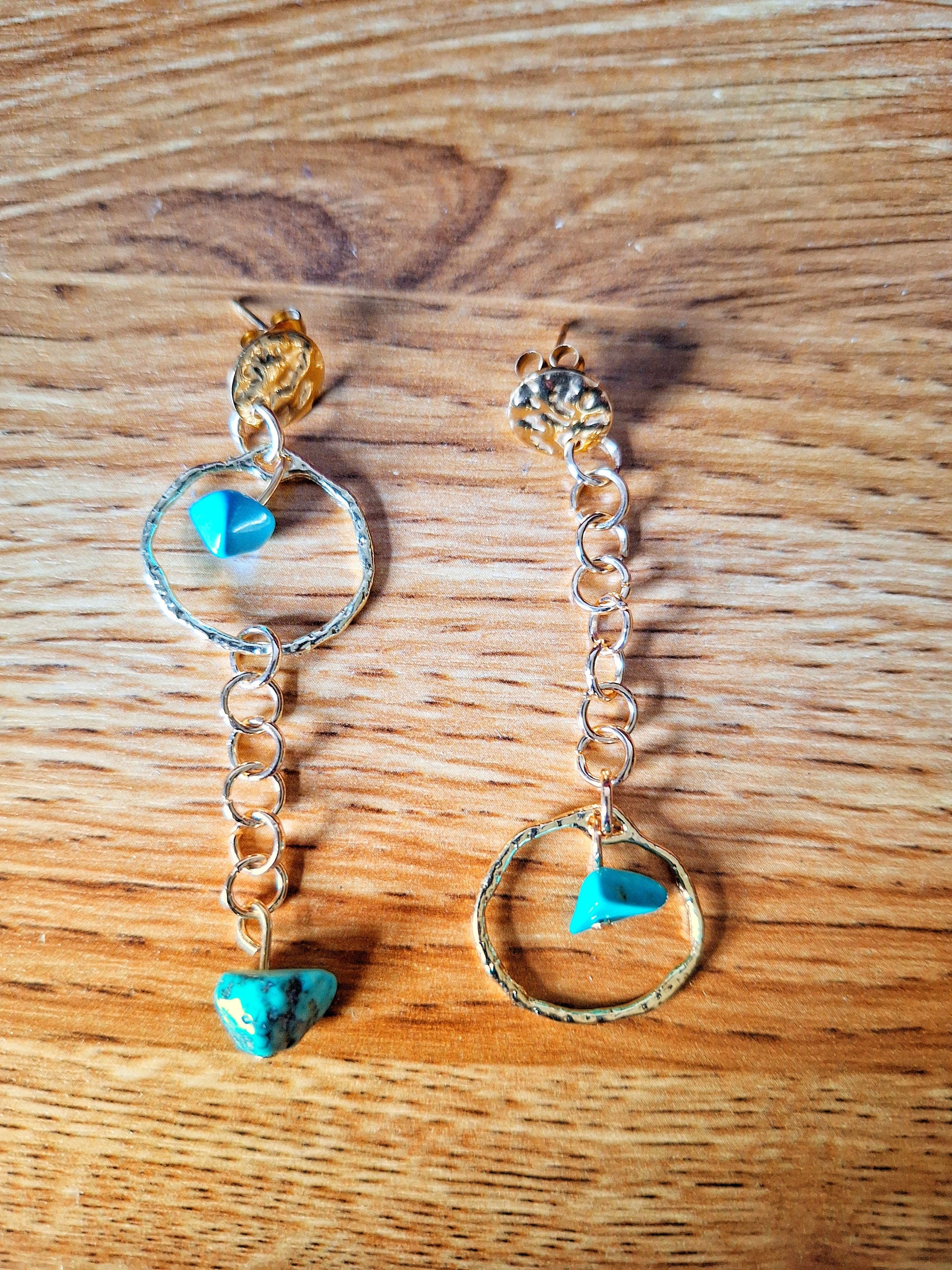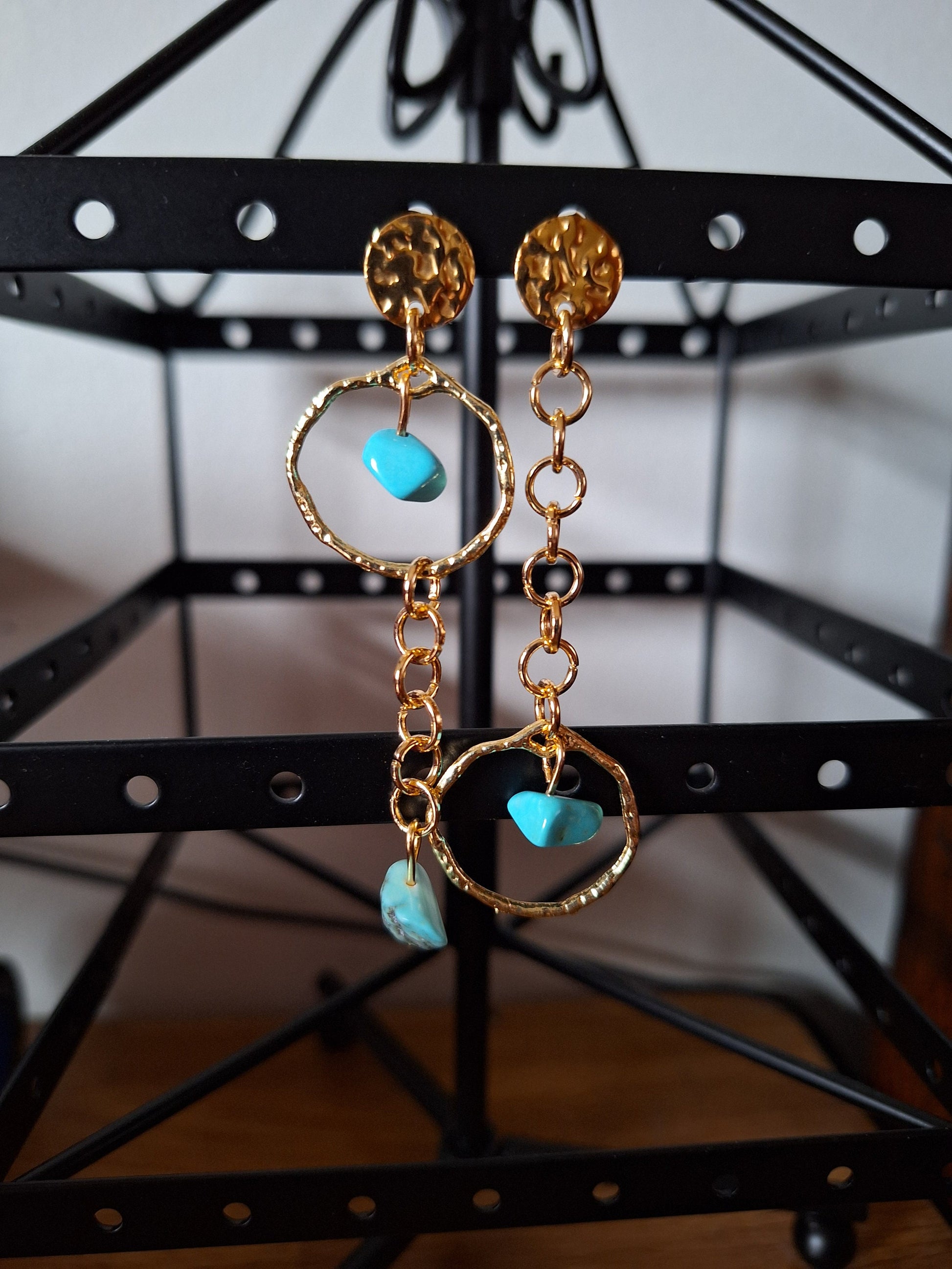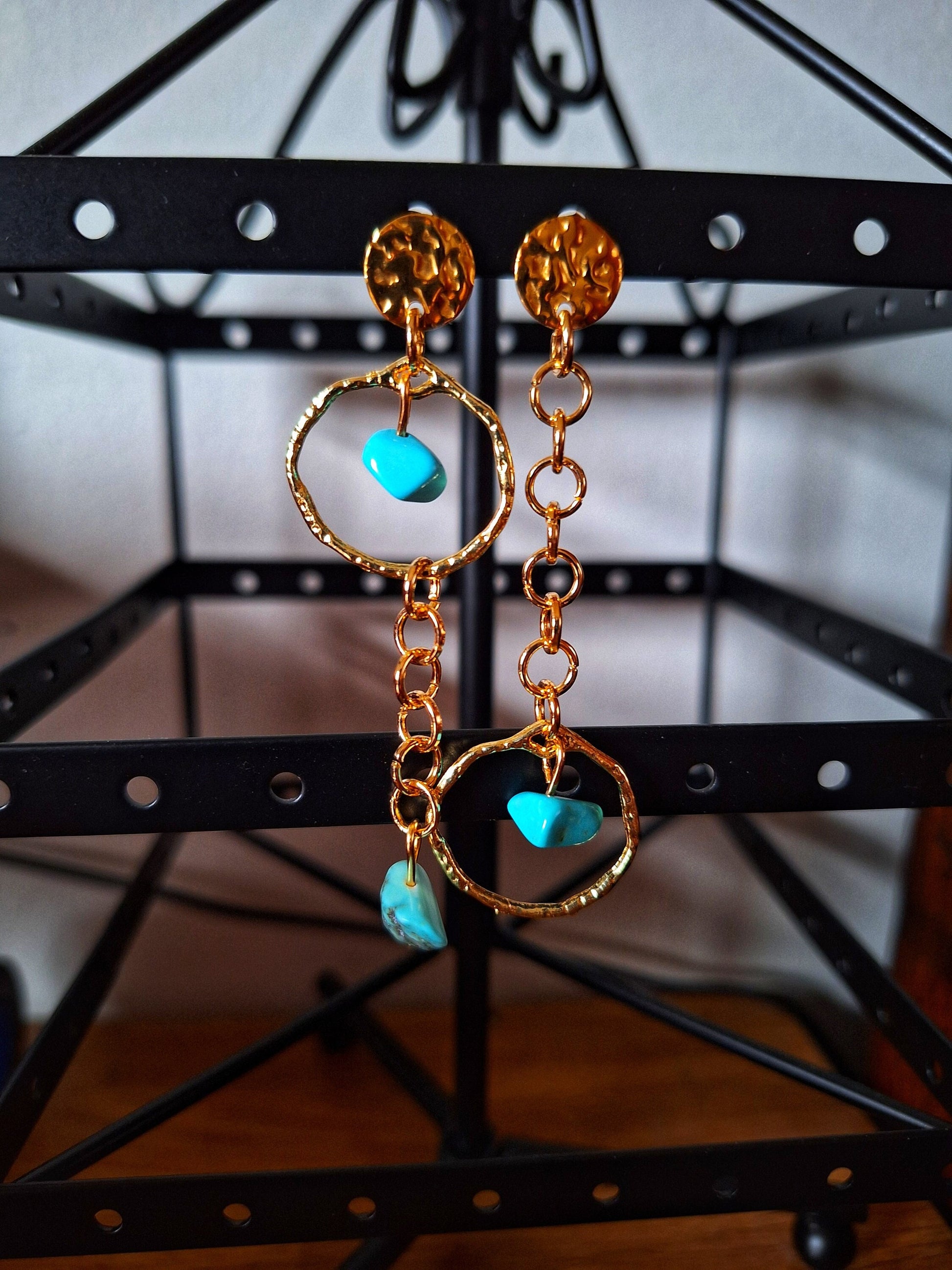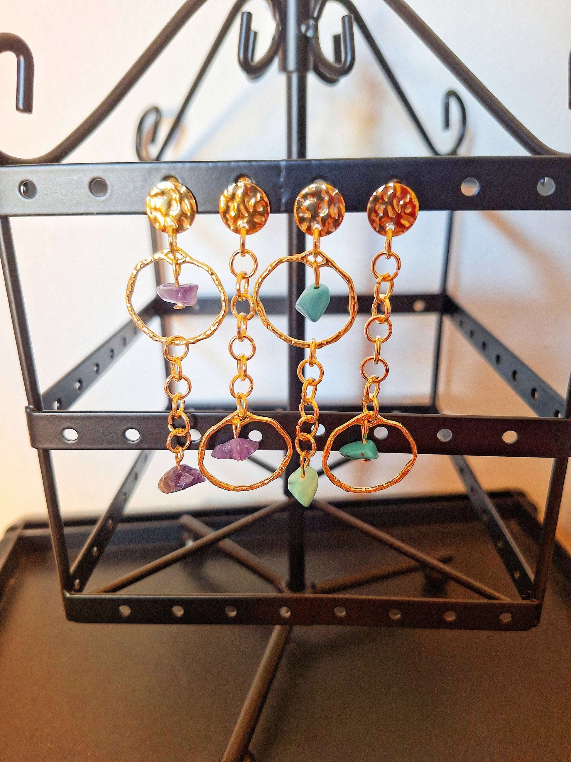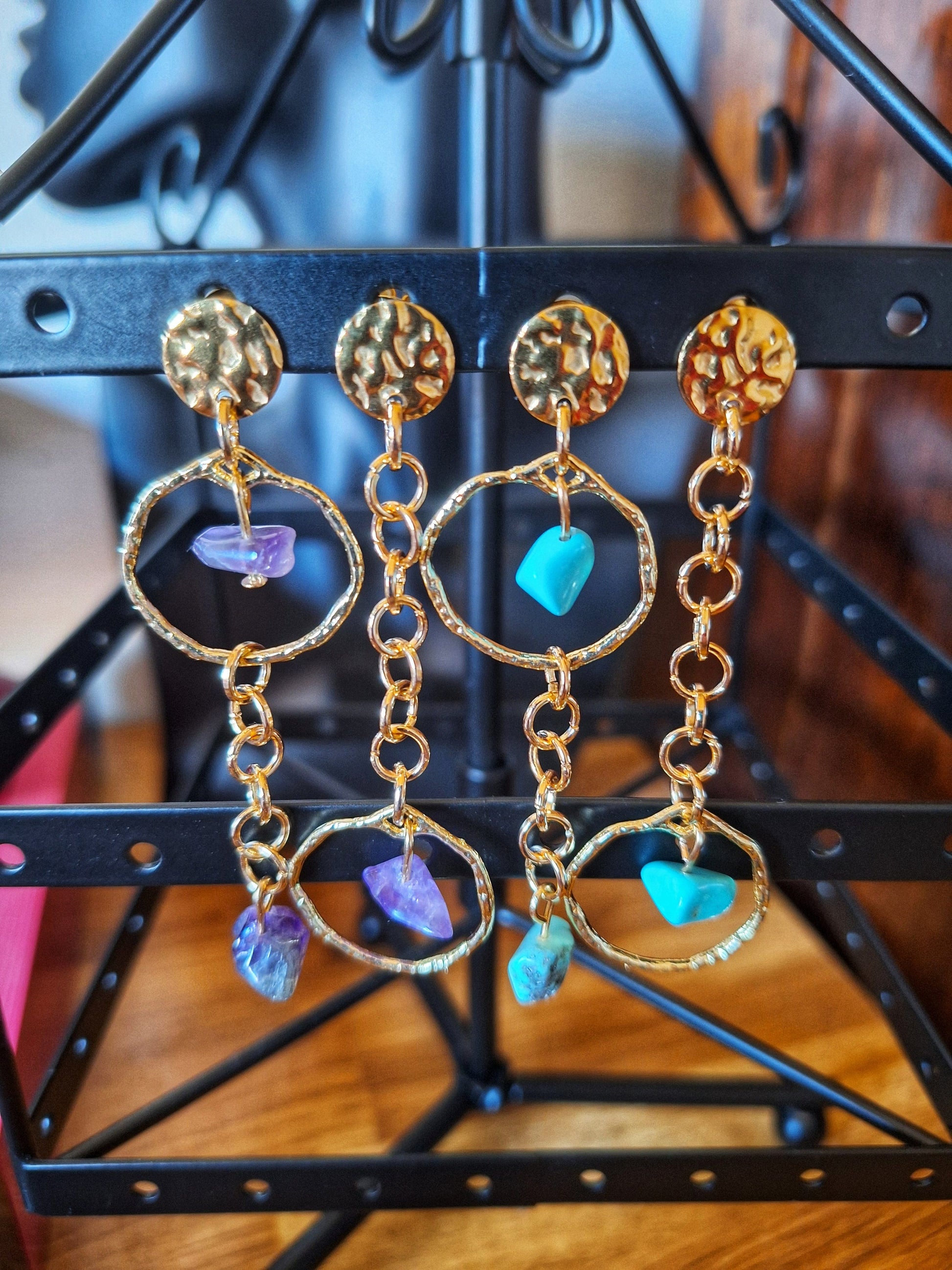 Discover the allure of the one-of-a-kind 70mm Celestine Earrings, a stunning embodiment of elegance and natural beauty. These earrings are meticulously crafted, featuring repurposed genuine gemstone chips that add a touch of authenticity and uniqueness. The gold-plated findings and stud enhance the overall charm, creating a harmonious blend of style and nature. Choose between the captivating turquoise or the enchanting amethyst to complement your personal style.