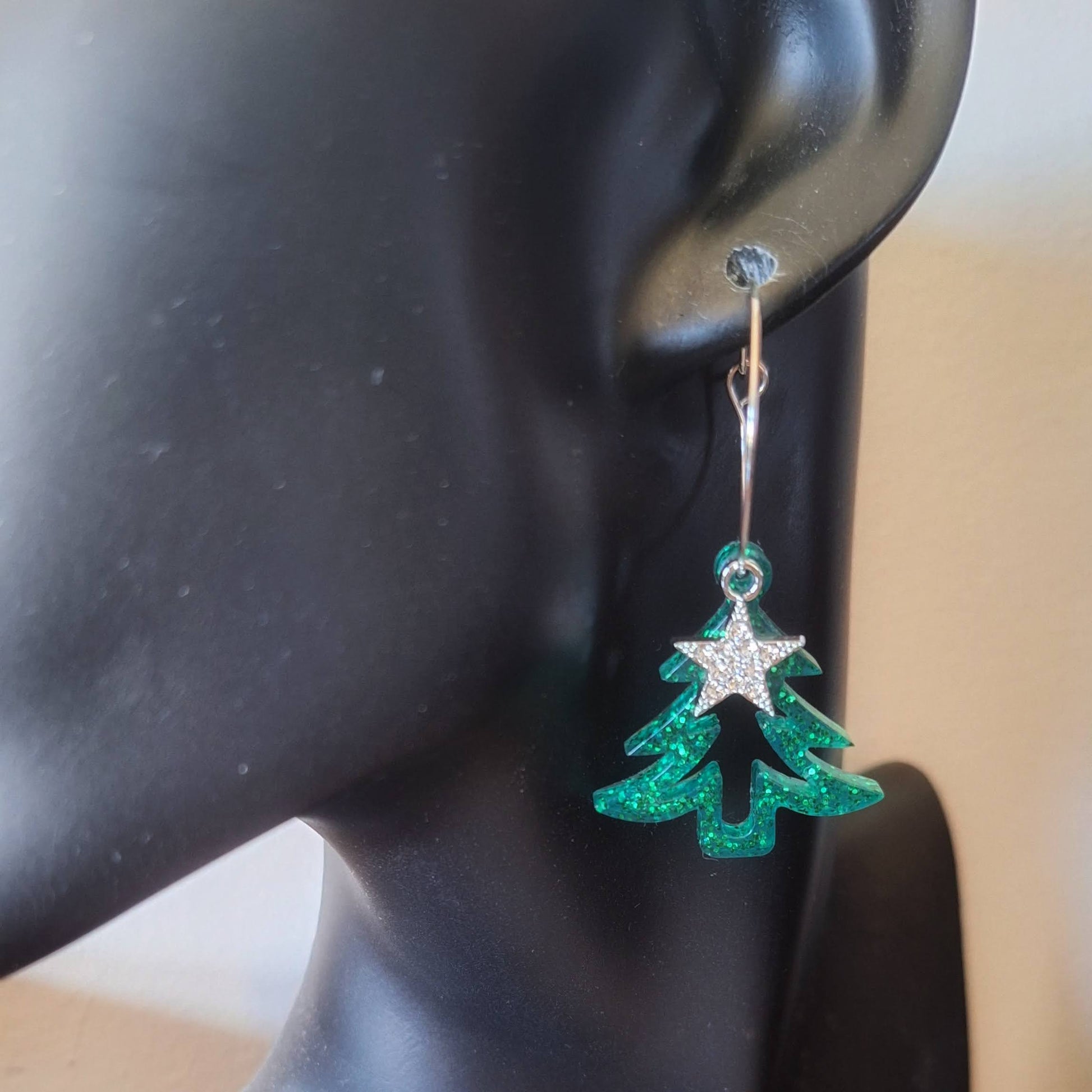 Get into the festive spirit with these Clara Christmas Tree Earrings! These limited edition earrings feature a green glitter resin Christmas tree and a sparkling rhinestone star charm, all suspended from 25mm silver-plated hoops. Perfect for adding a touch of holiday cheer to any outfit.