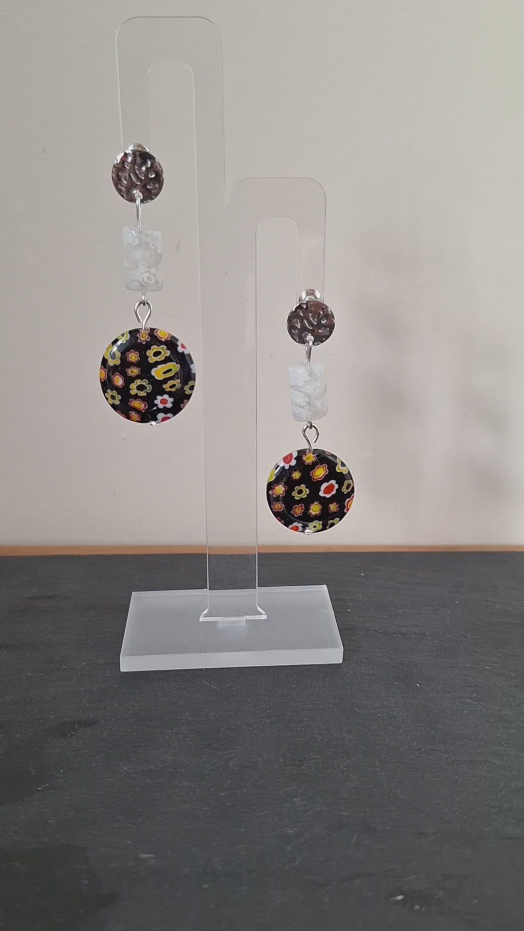 Spice up your accessory game with our Dahlia Black and White Earrings. Handcrafted from repurposed glass millefiori beads, these one-of-a-kind earrings are suspended from hammered stainless steel studs for a unique touch. Stand out with a 50mm length and eco-friendly style.
