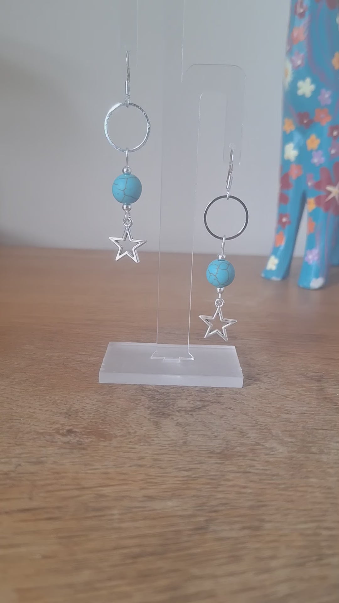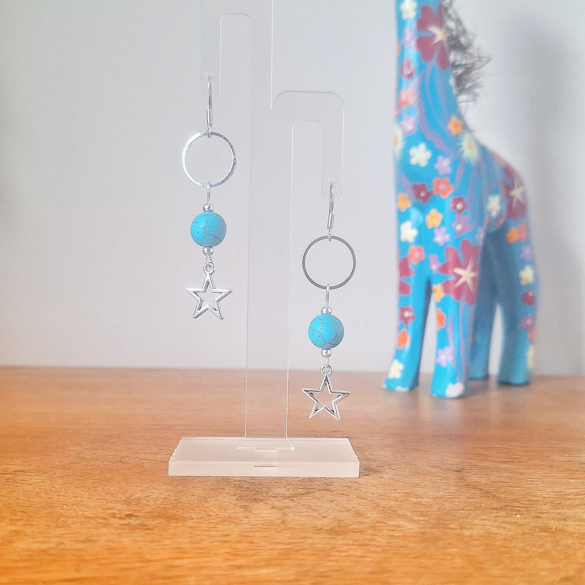 Get your star on with these quirky and playful Delilah Turquoise Star Earrings. These unique earrings are made using repurposed turquoise stone beads, silver-plated stars, and suspended from sterling silver ear wires for a 60mm drop. Stand out from the crowd and add some fun to your outfit with unique earrings.