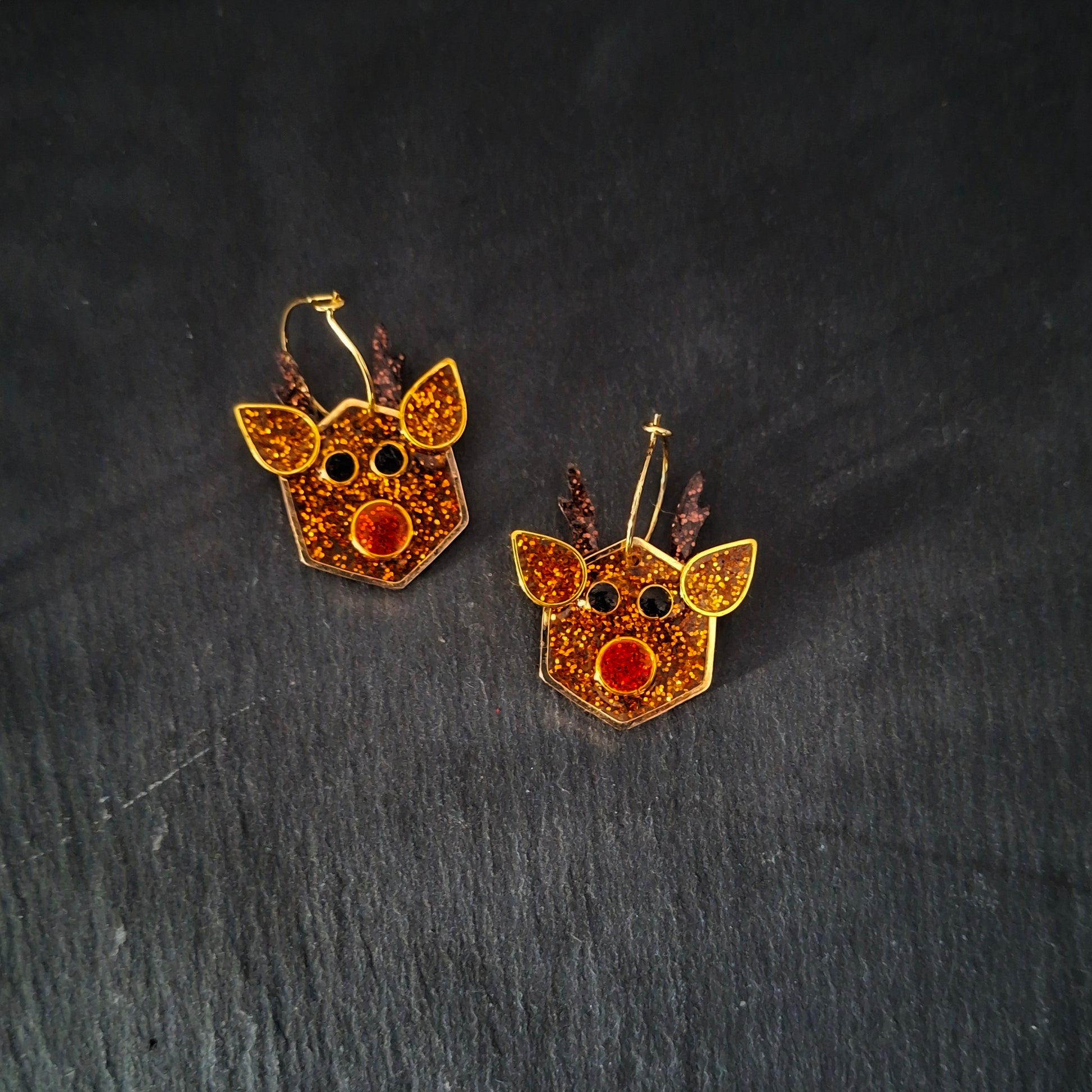 Christmas earrings, Rudolph earrings, reindeer earrings, festive jewellery, handmade Christmas earrings, glitter resin earrings, gold-plated earrings, holiday earrings, quirky Christmas gift, small batch jewellery, Rudolph the Red-Nosed Reindeer.