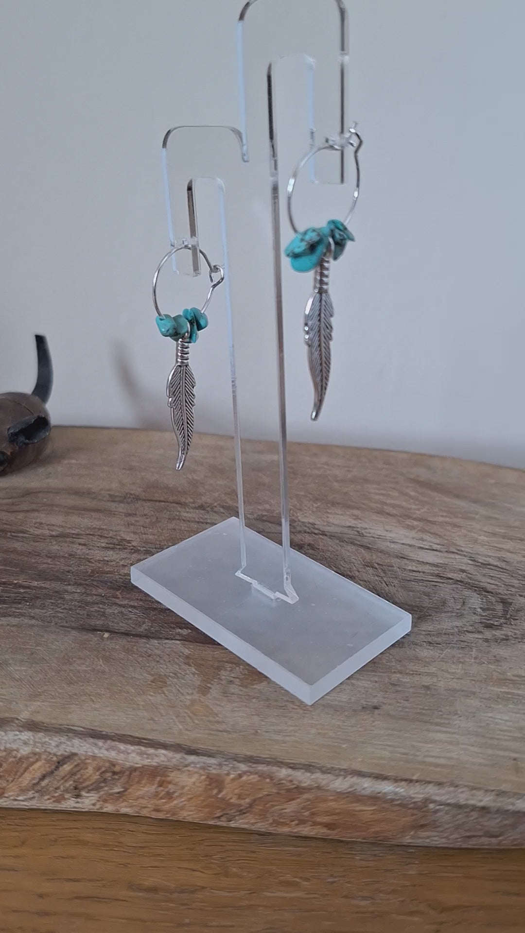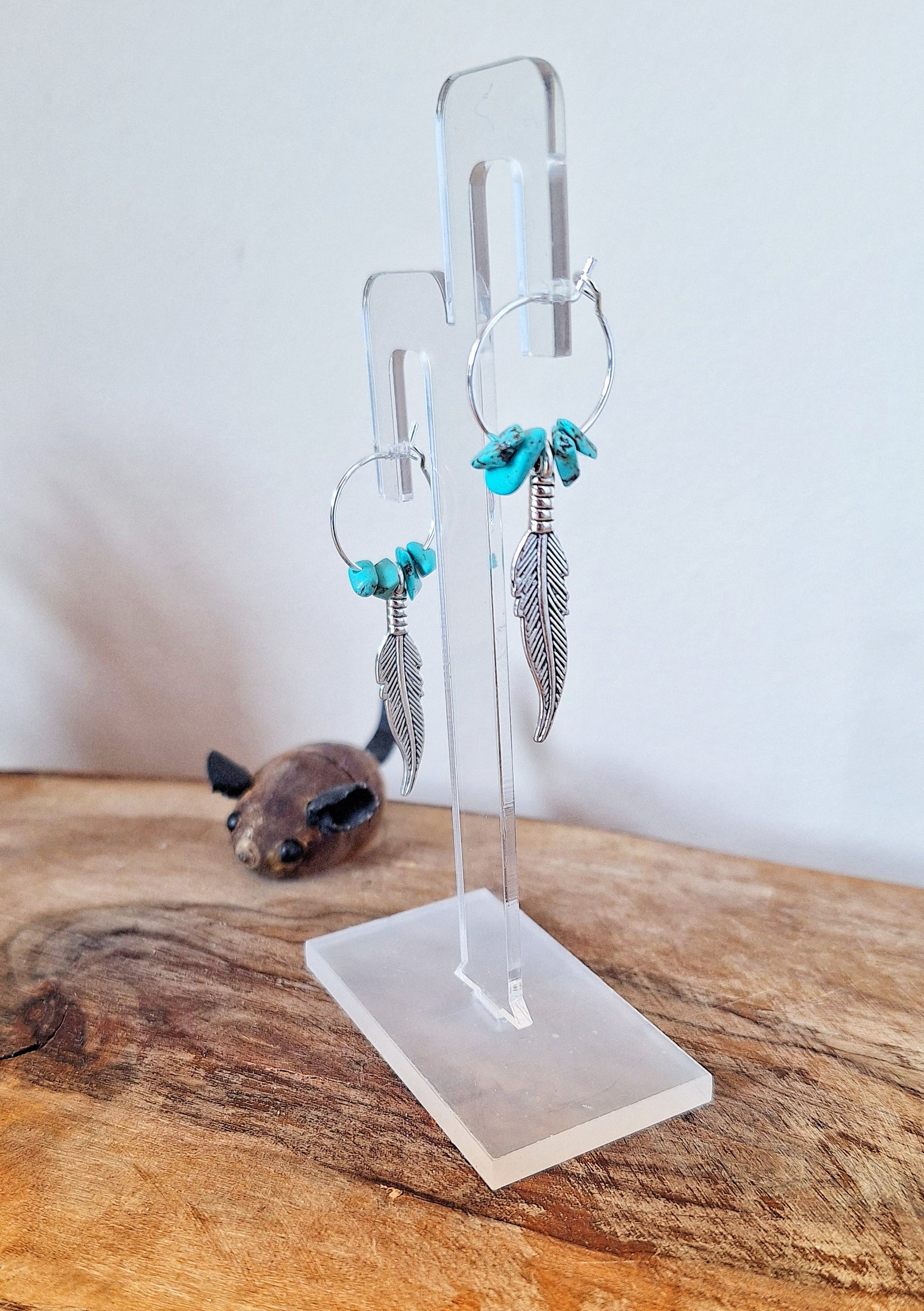 Fly in style with Elena Turquoise Feather Hoops. These 15mm silver-plated hoops feature repurposed turquoise chips and feather charms, adding a unique touch to your look. Express your playful side and embrace your inner free spirit with these quirky and stylish earrings.