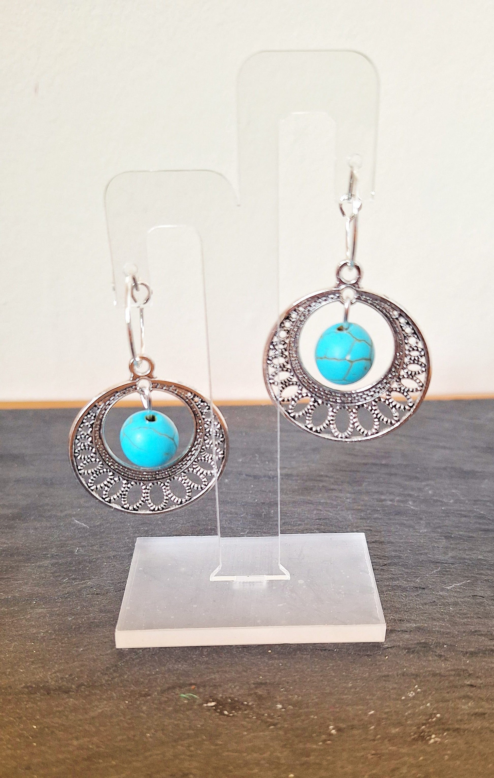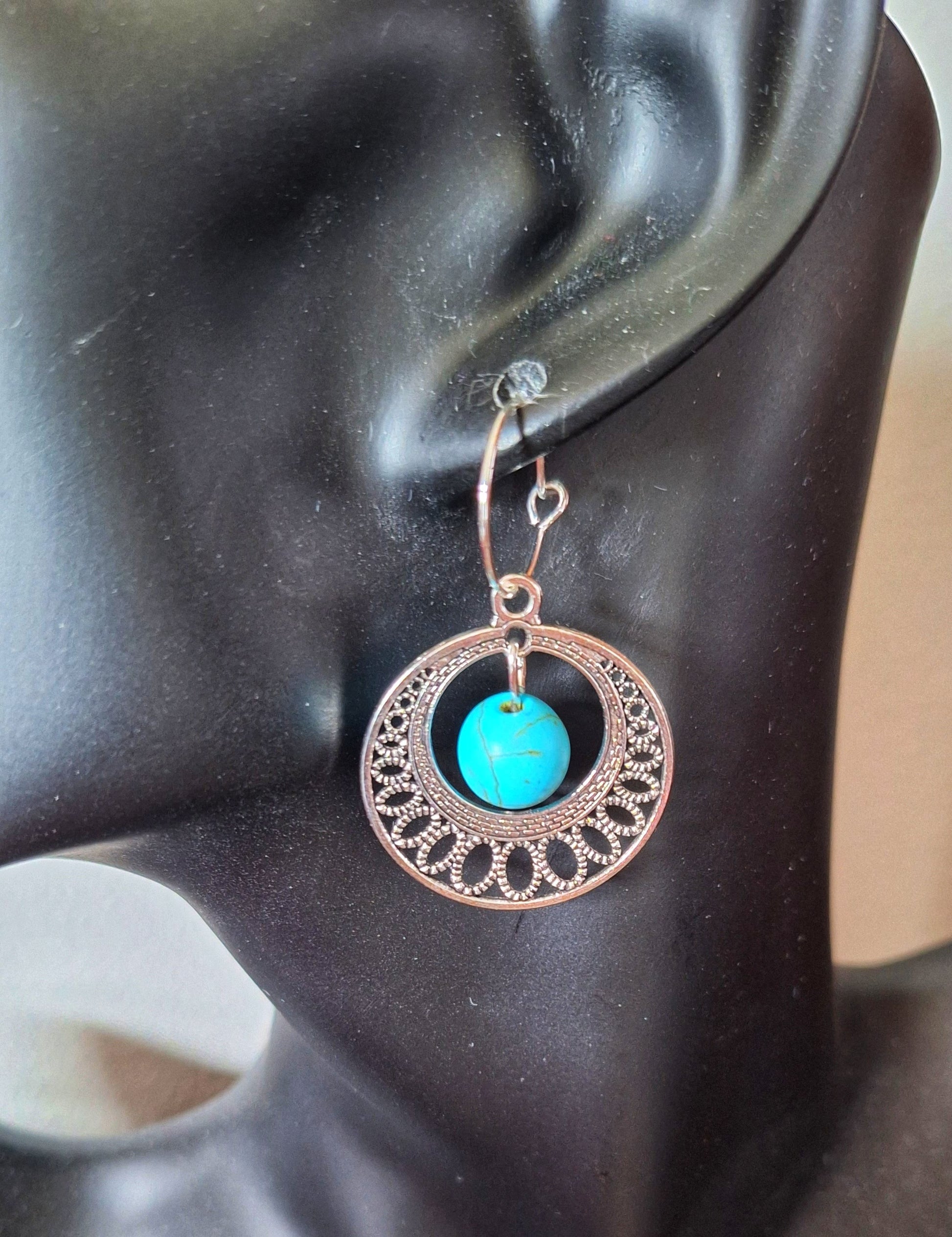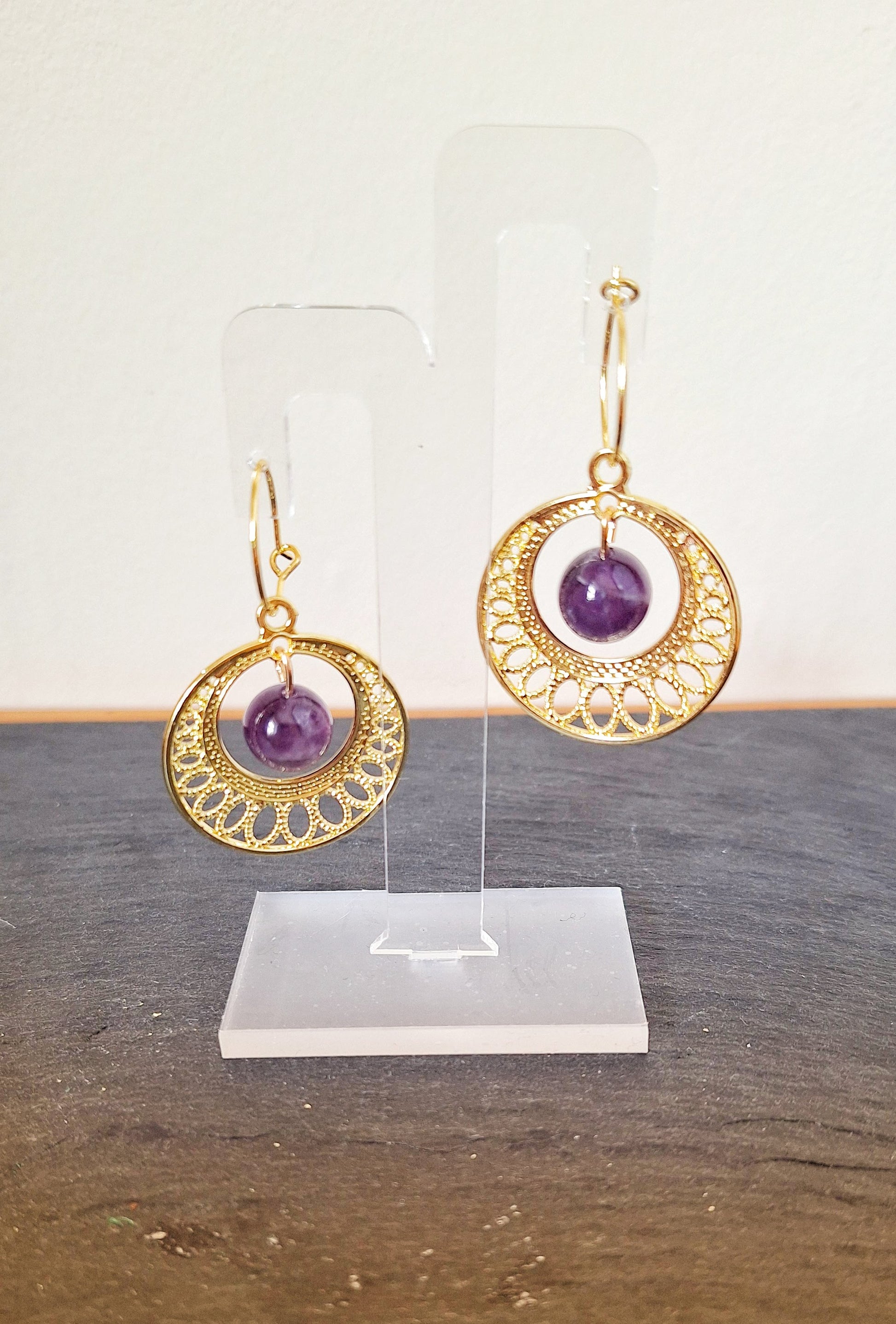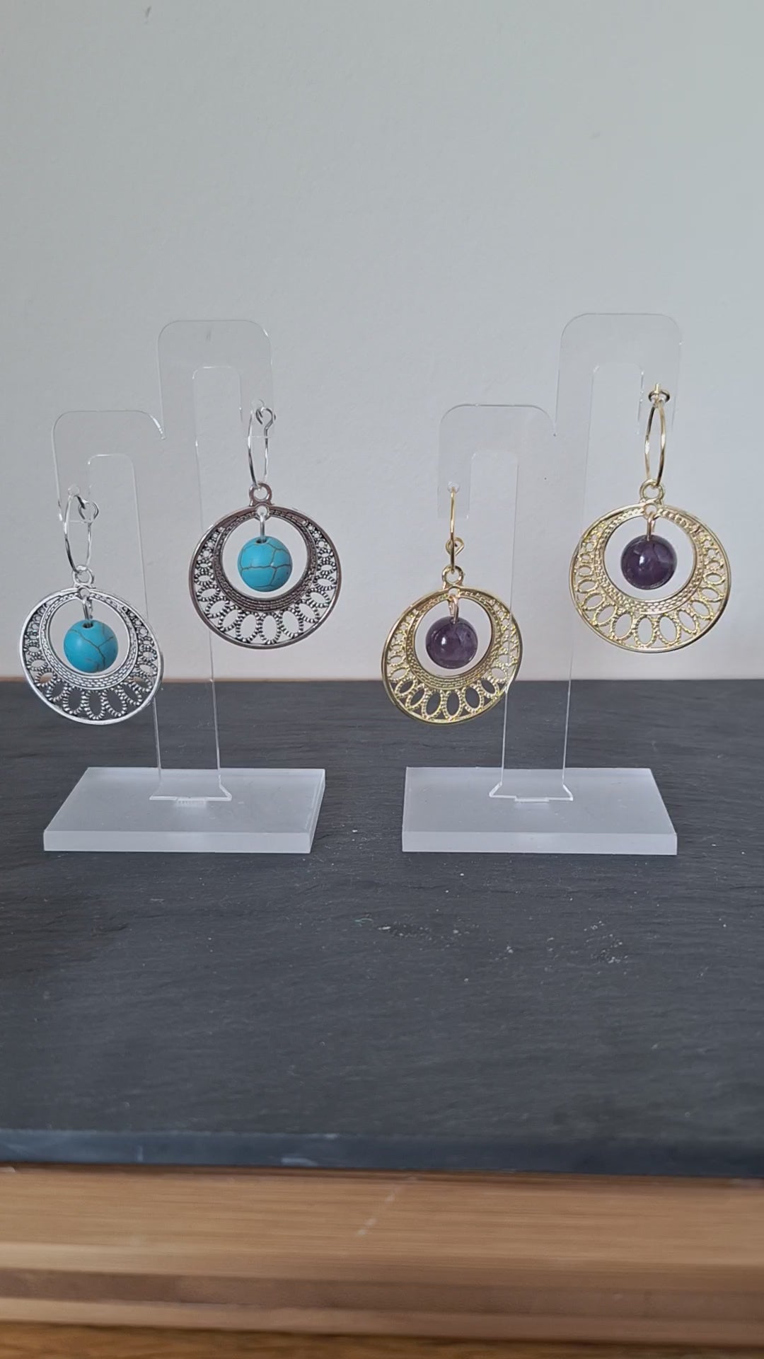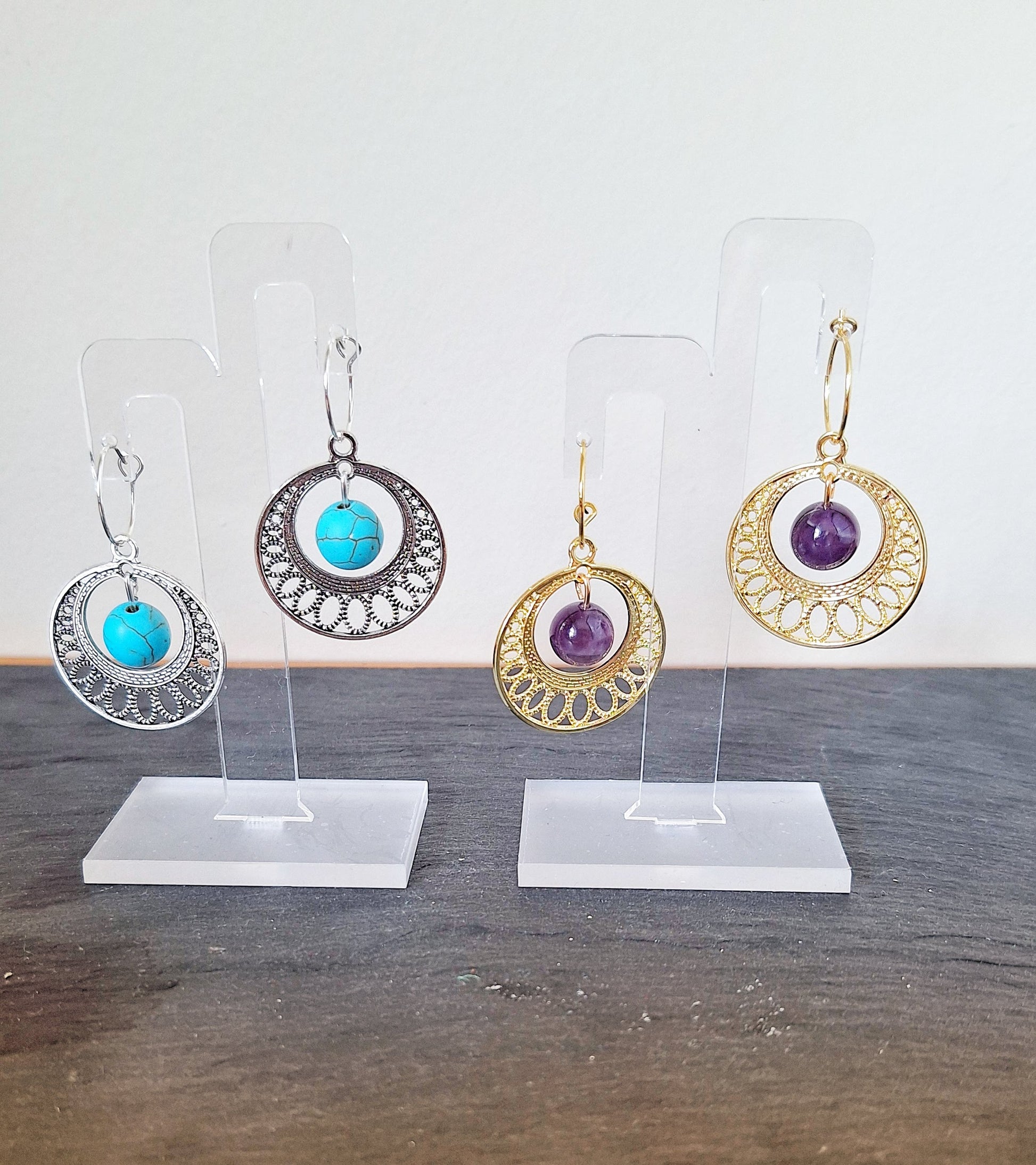Add a playful touch to any outfit with our Faith Chandelier Hoops! Crafted with repurposed gemstone beads and suspended from 15mm hoops, these earrings come in a choice of turquoise with silver-plated hoops or amethyst with gold-plated hoops. Perfect for those who live life with a little more bling!