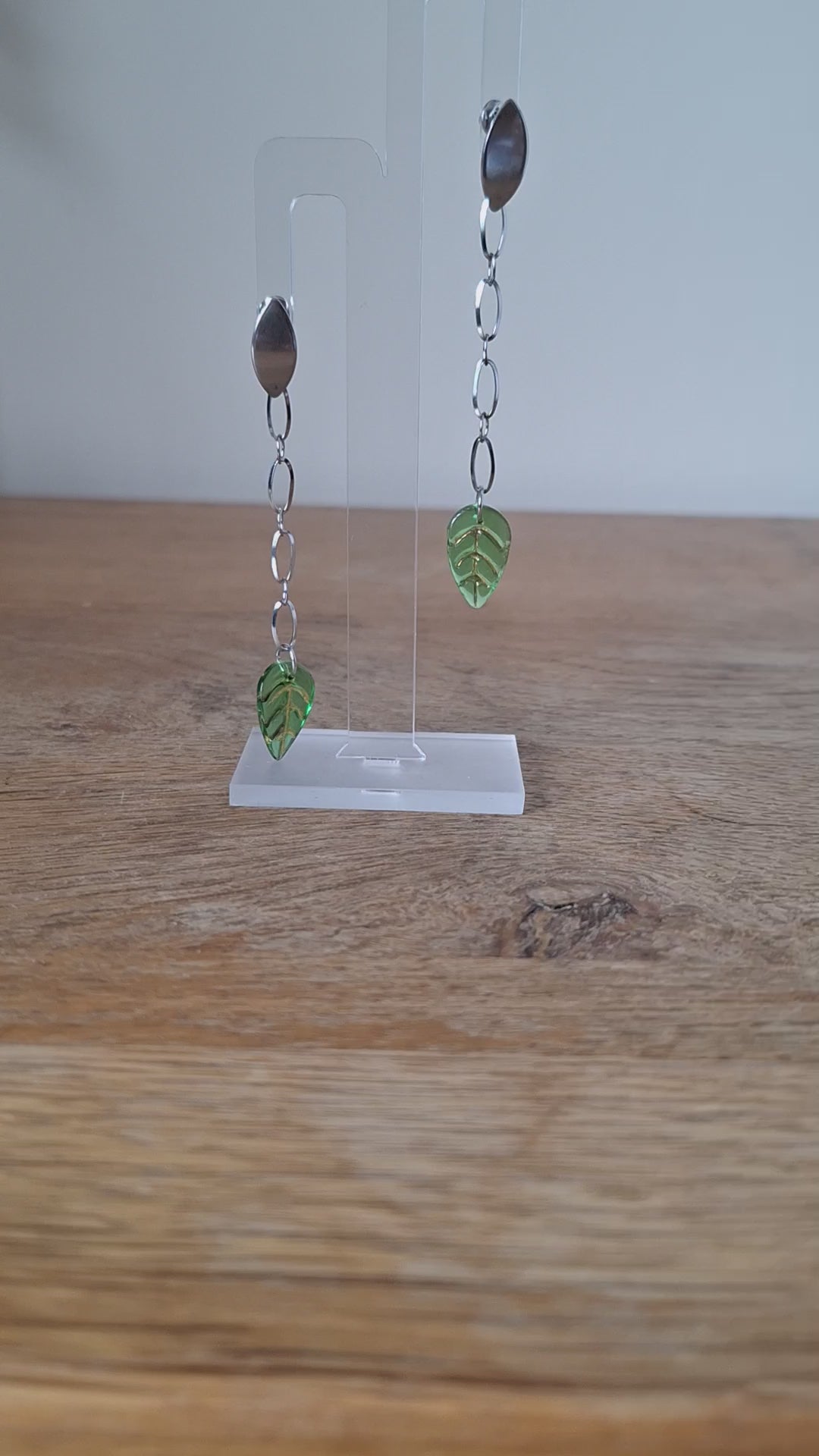 Enhance your style with Gaia Green Leaf Earrings. Crafted with repurposed lightweight stainless steel chain and glass leaf beads, these 80mm earrings are suspended from stainless steel studs for a unique and eco-friendly touch. Elevate your look with these stylish and sustainable accessories.
