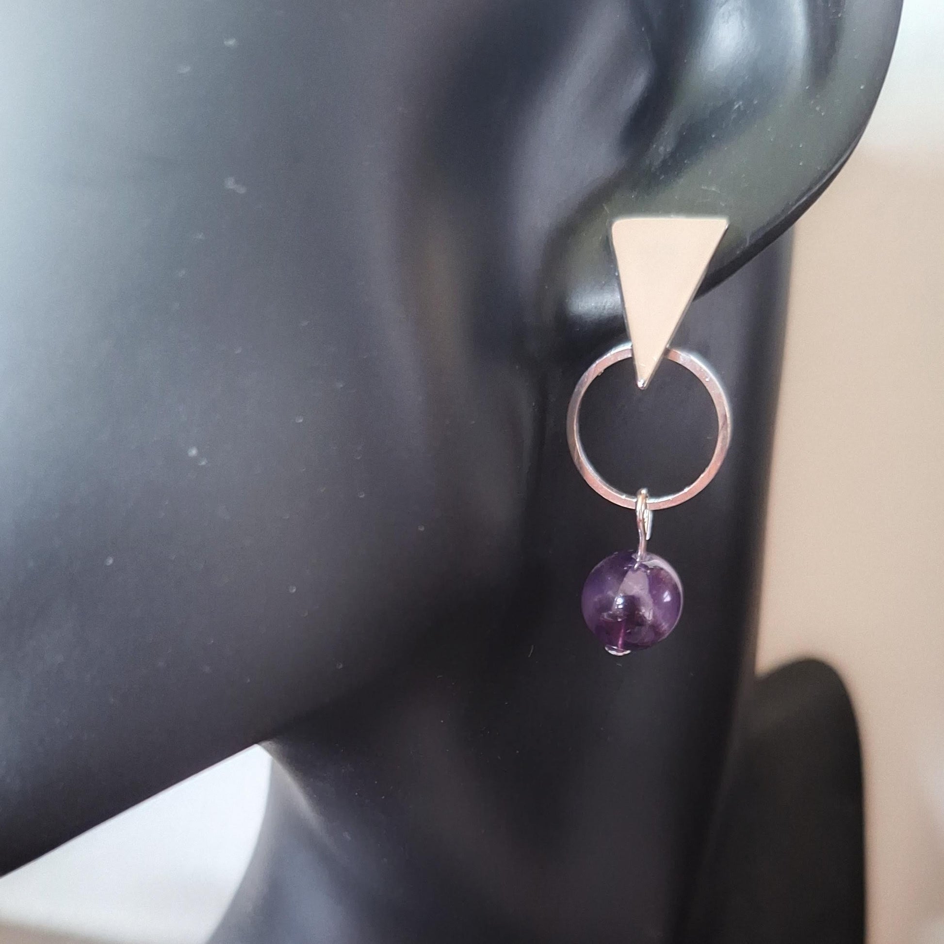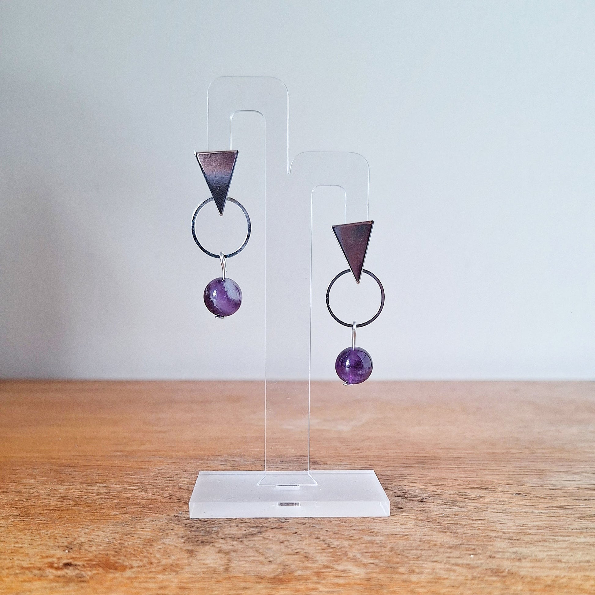 Crafted from repurposed amethyst beads or freshwater pearls, the Georgia Geometric Earrings offer an elegant and sustainable choice for accessorising. Suspended from rhodium-plated triangular studs, these earrings feature a striking 40mm drop. Make a statement with these exclusive and sophisticated earrings.