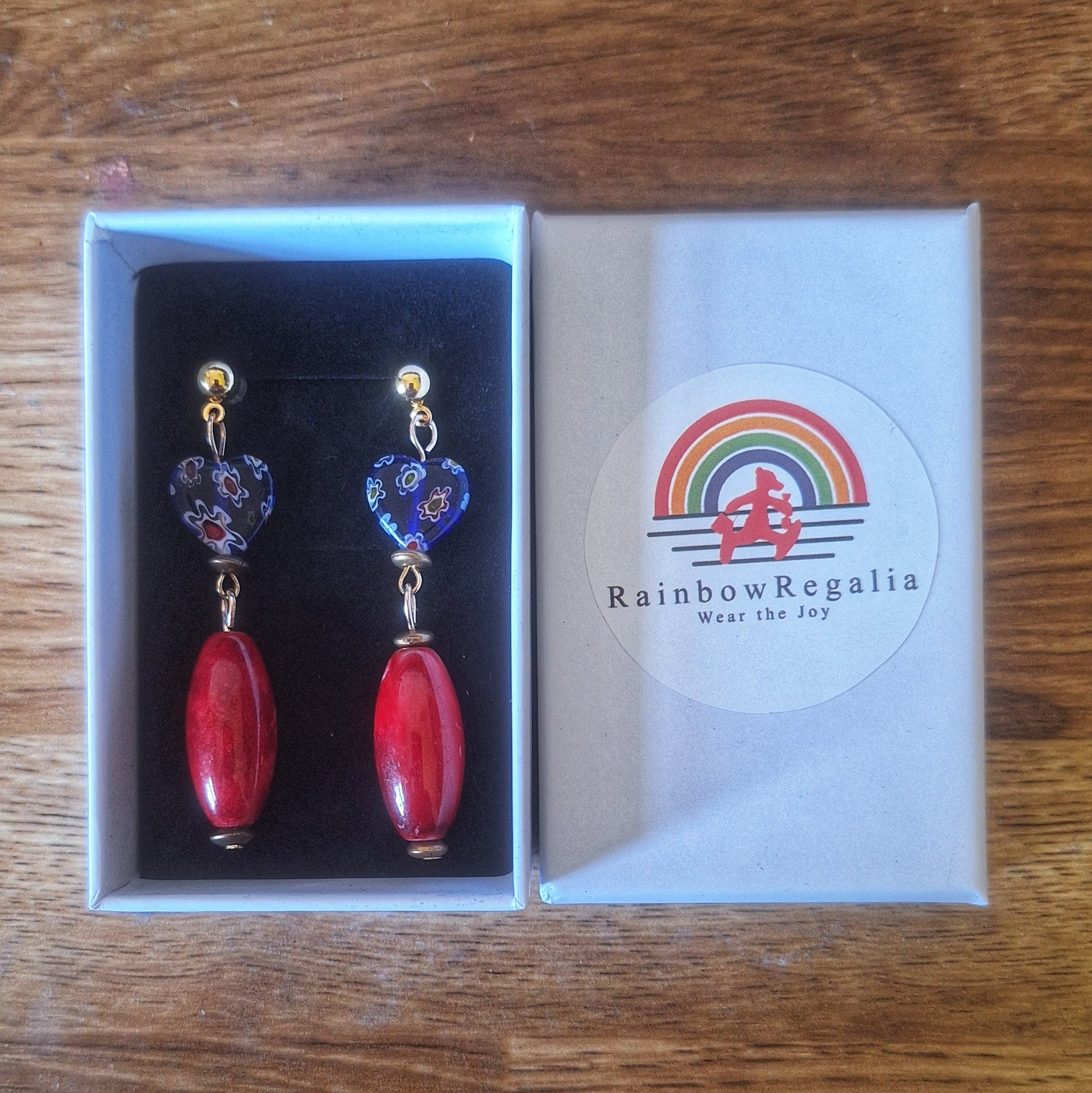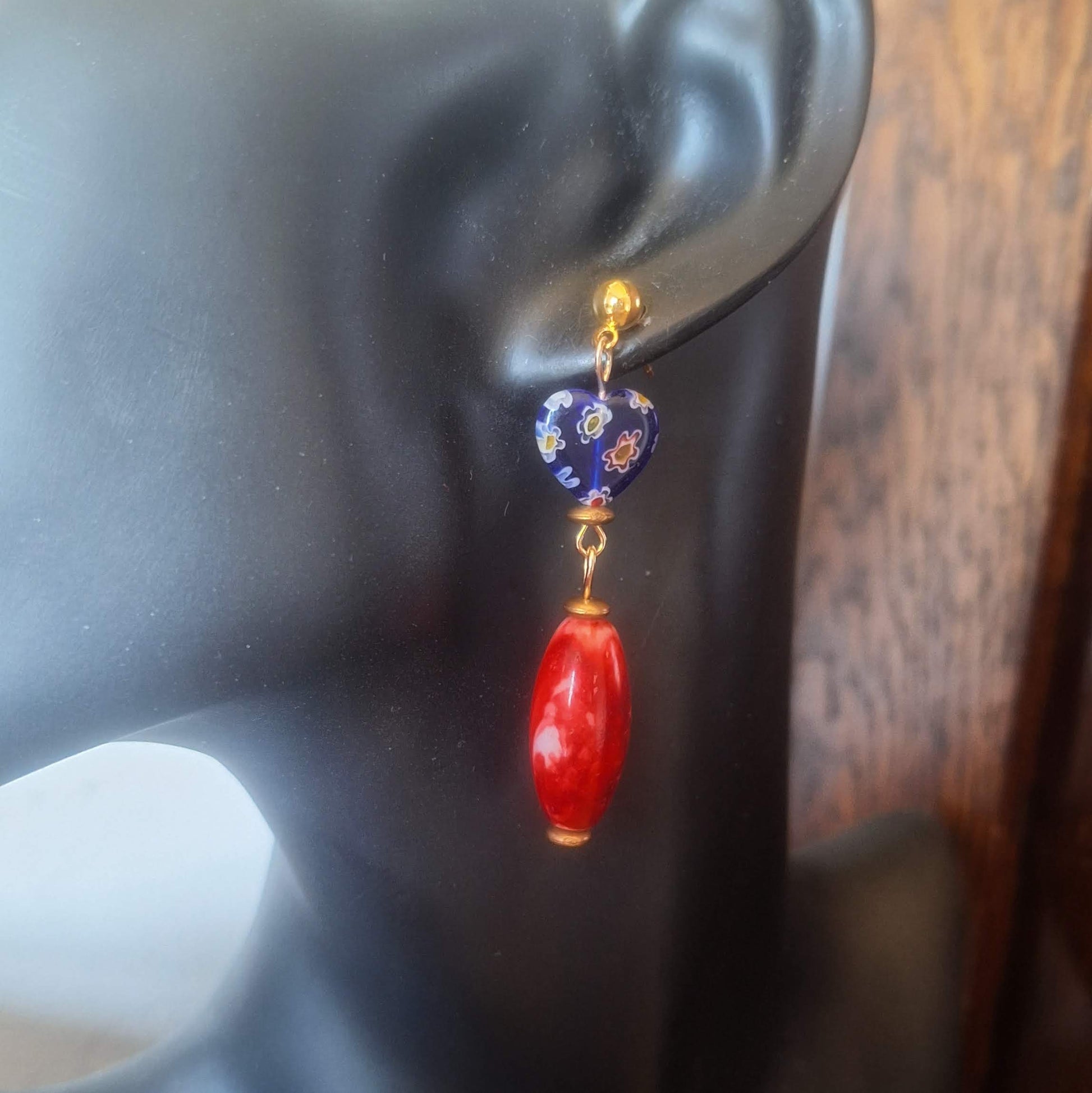 Heart of Glass Earrings, millefiori glass earrings, retro statement earrings, vintage inspired jewellery, handmade glass bead earrings, colourful drop earrings, gold plated earrings handmade, unique gift earrings, repurposed glass jewellery, playful statement earrings
