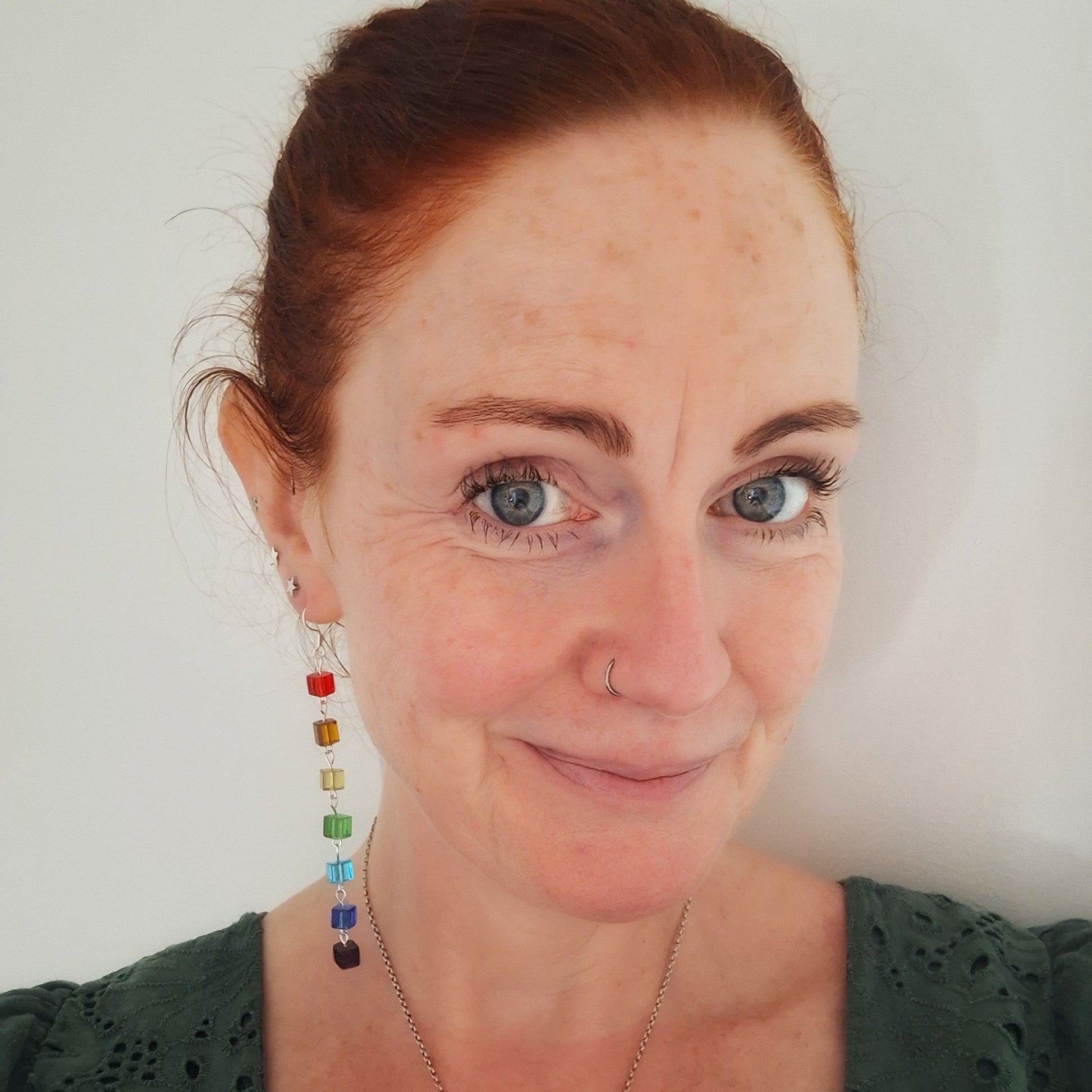 Made with repurposed square glass beads in a full rainbow of shades and suspended from sterling silver ear wires, they’re like little disco ladders for your ears. They move like magic and catch the light like they’ve just heard a juicy bit of gossip. Light enough for all-day wear, but bold enough to turn a Tesco run into a catwalk moment.