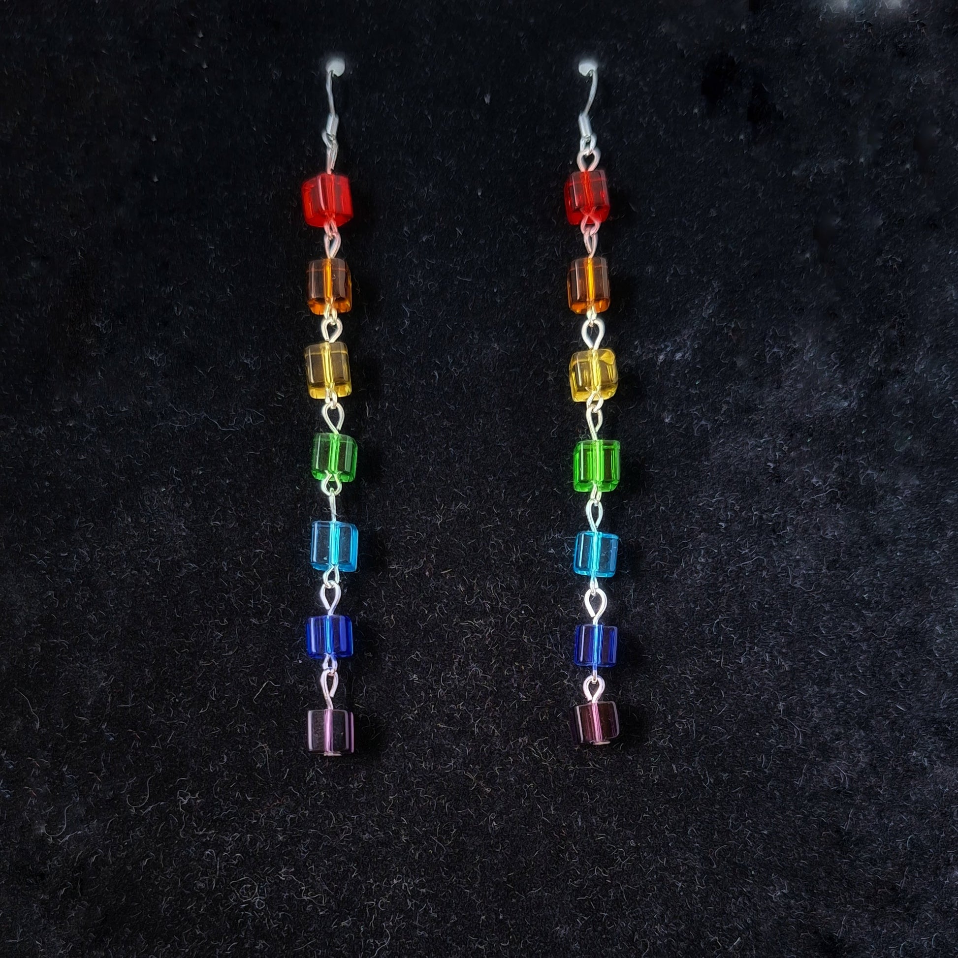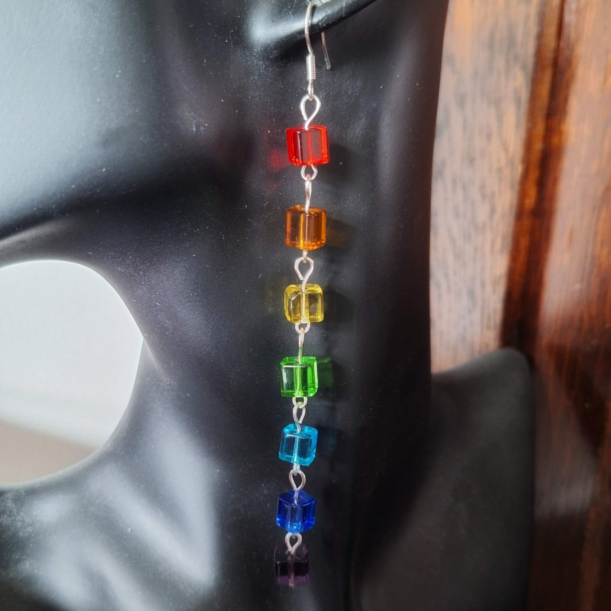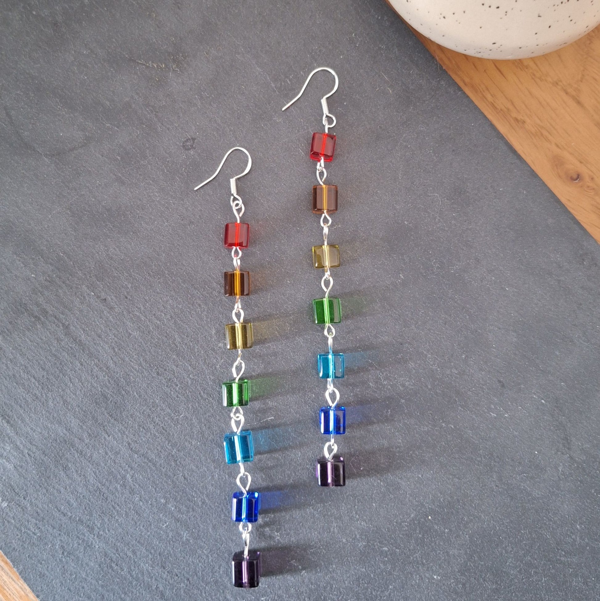 rainbow earrings, repurposed glass bead earrings, sterling silver earrings, long statement earrings, colourful dangle earrings, handmade artisan earrings, bold statement earrings, disco inspired earrings, unique earrings, one-of-a-kind earrings
