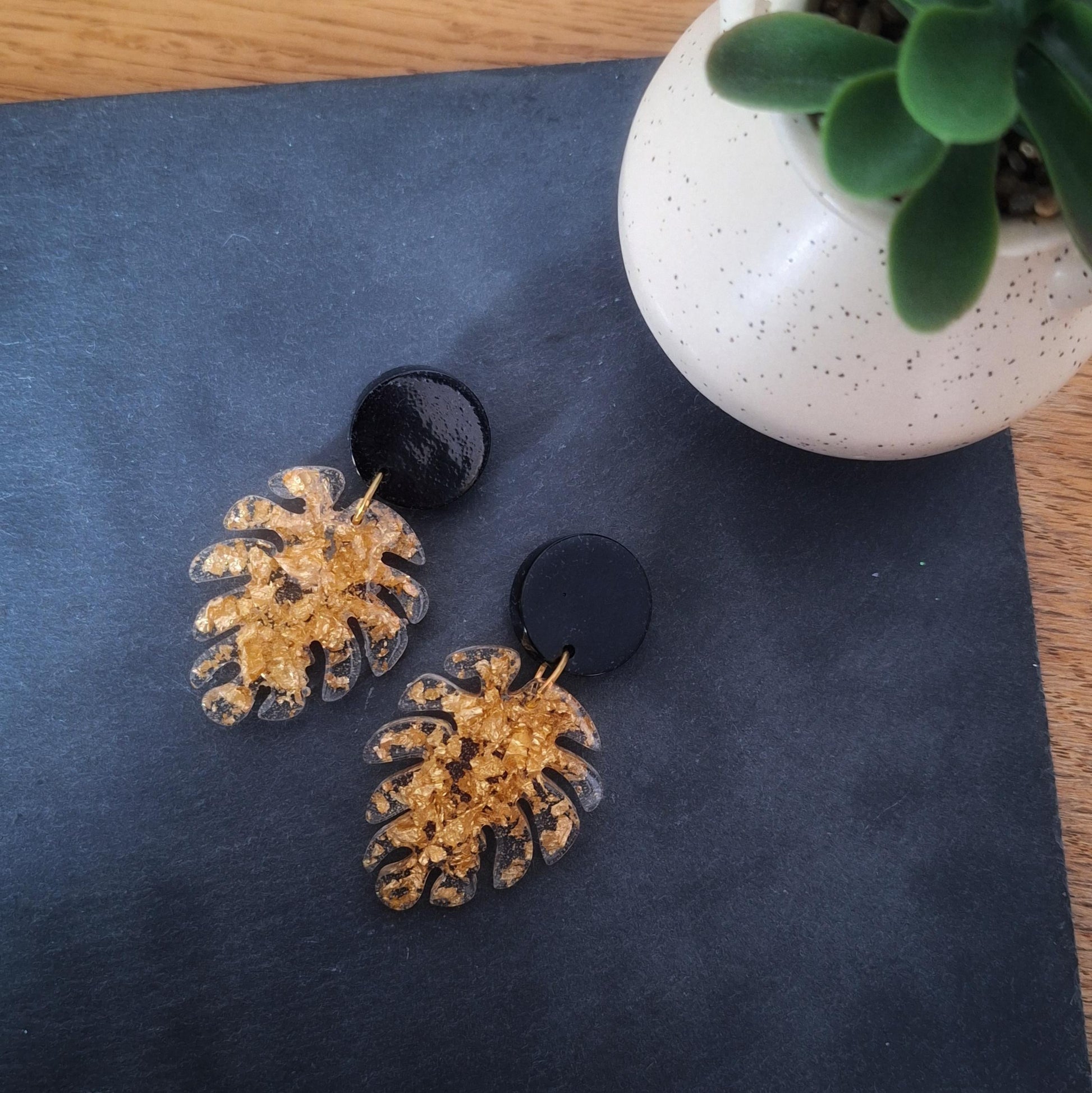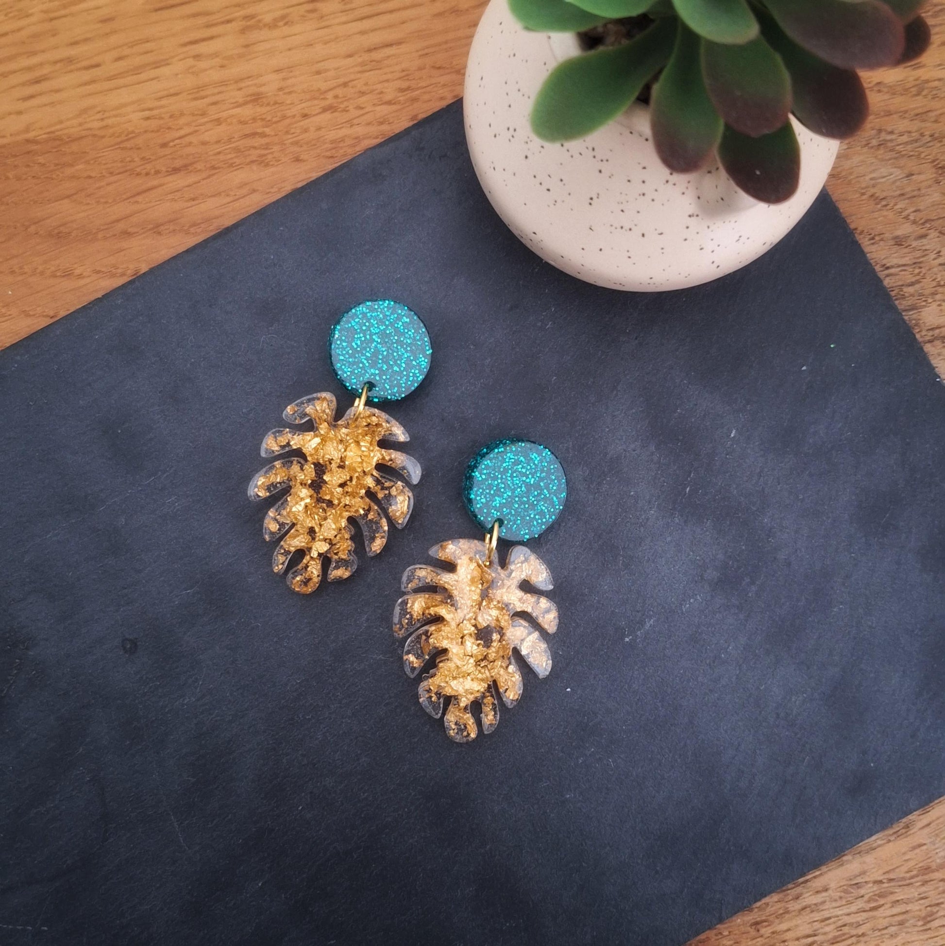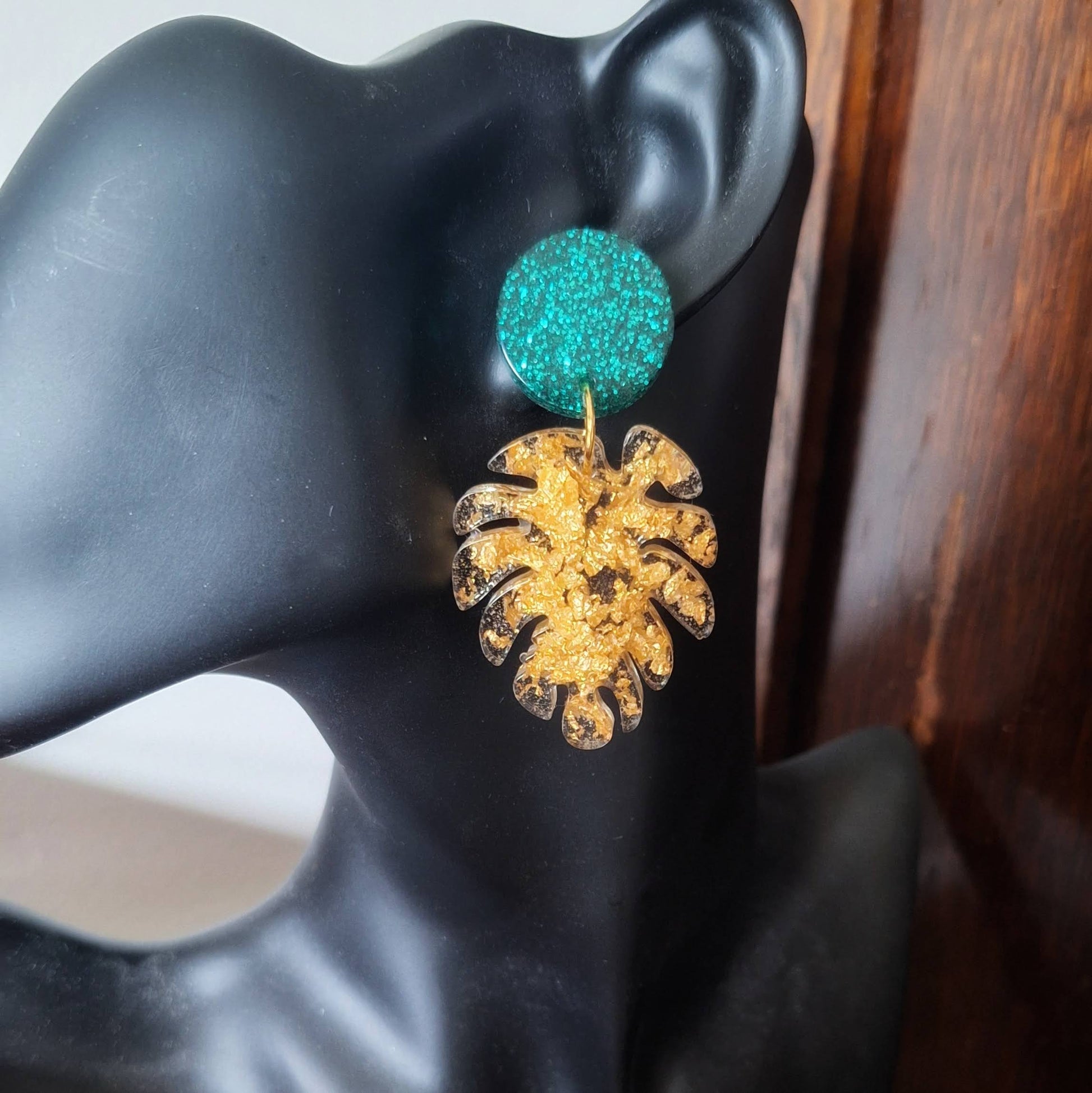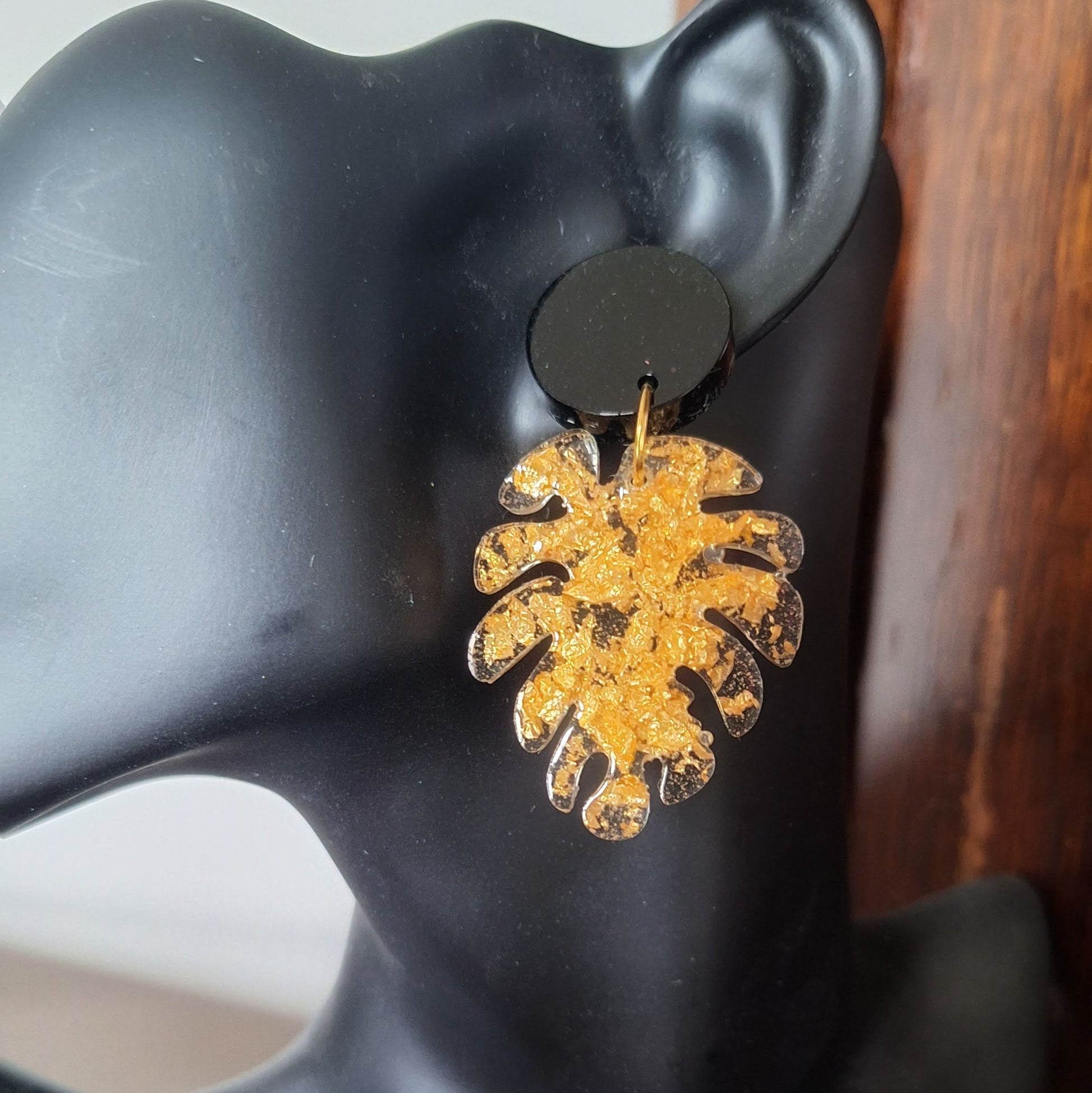 gold leaf earrings, resin statement earrings, 60mm dangle earrings, gold-plated stud earrings, handmade glitter earrings, bold statement earrings, unique artisan earrings, one-of-a-kind earrings, fashionable earrings, glamorous earrings