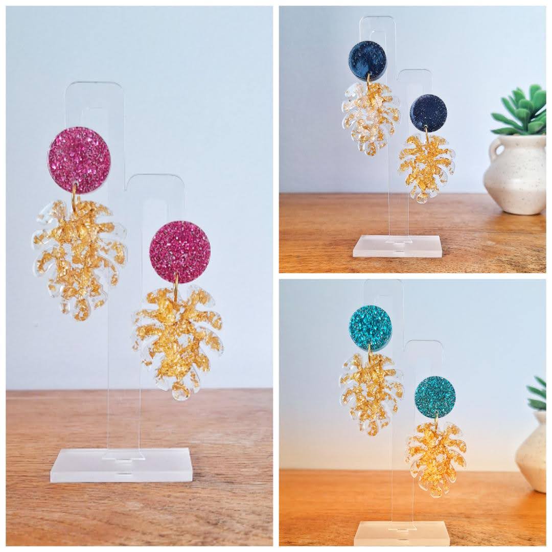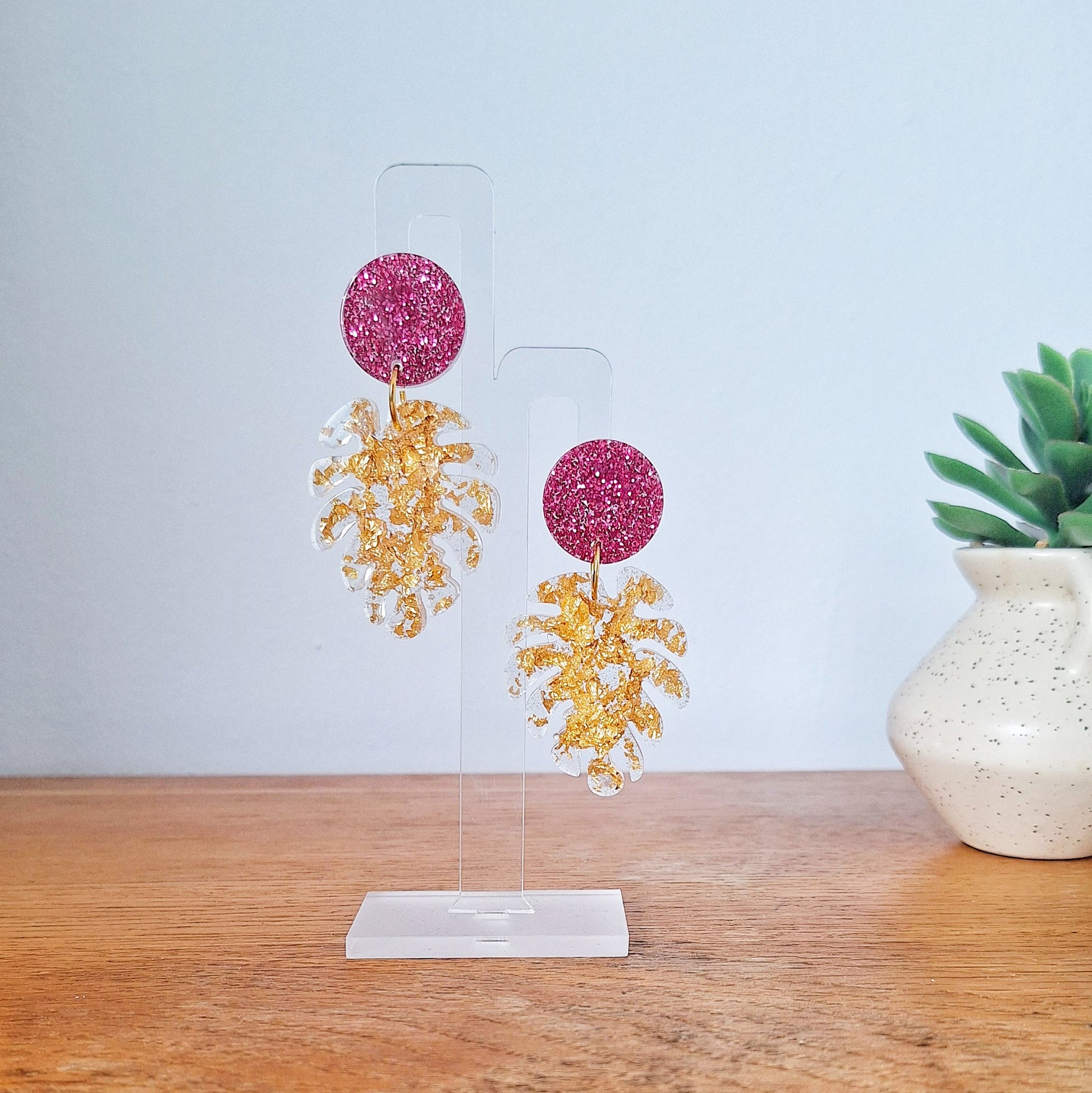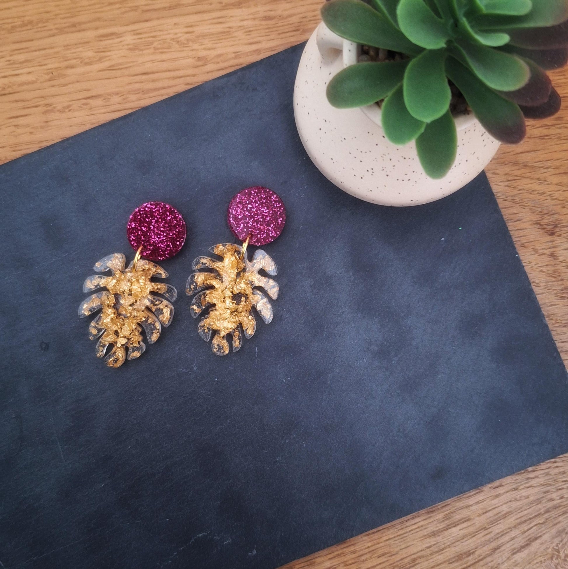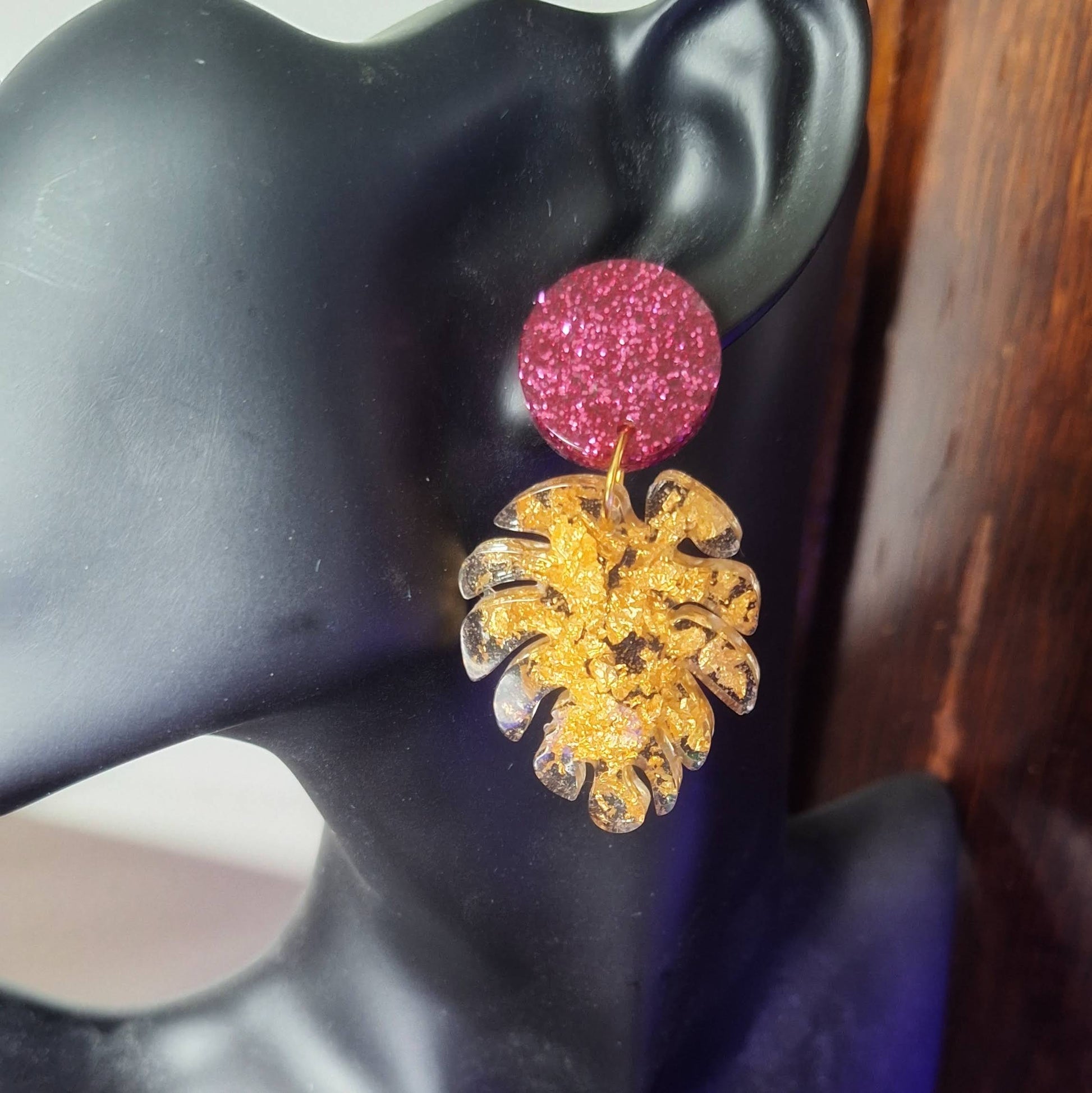 gold leaf earrings, resin statement earrings, 60mm dangle earrings, gold-plated stud earrings, handmade glitter earrings, bold statement earrings, unique artisan earrings, one-of-a-kind earrings, fashionable earrings, glamorous earrings