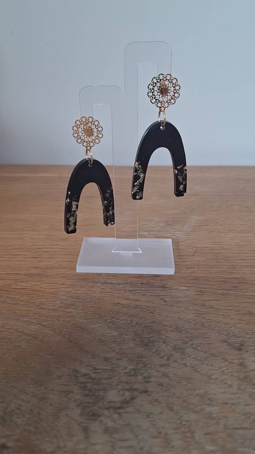 Elevate your style with the Layla Rainbow Earrings. These stunning, handmade earrings feature elegant black resin and delicate gold-leaf accents. Suspended from gold-plated rosette studs, they add a touch of sophistication and luxury to any outfit. With a 50mm drop, these earrings are sure to make a statement.