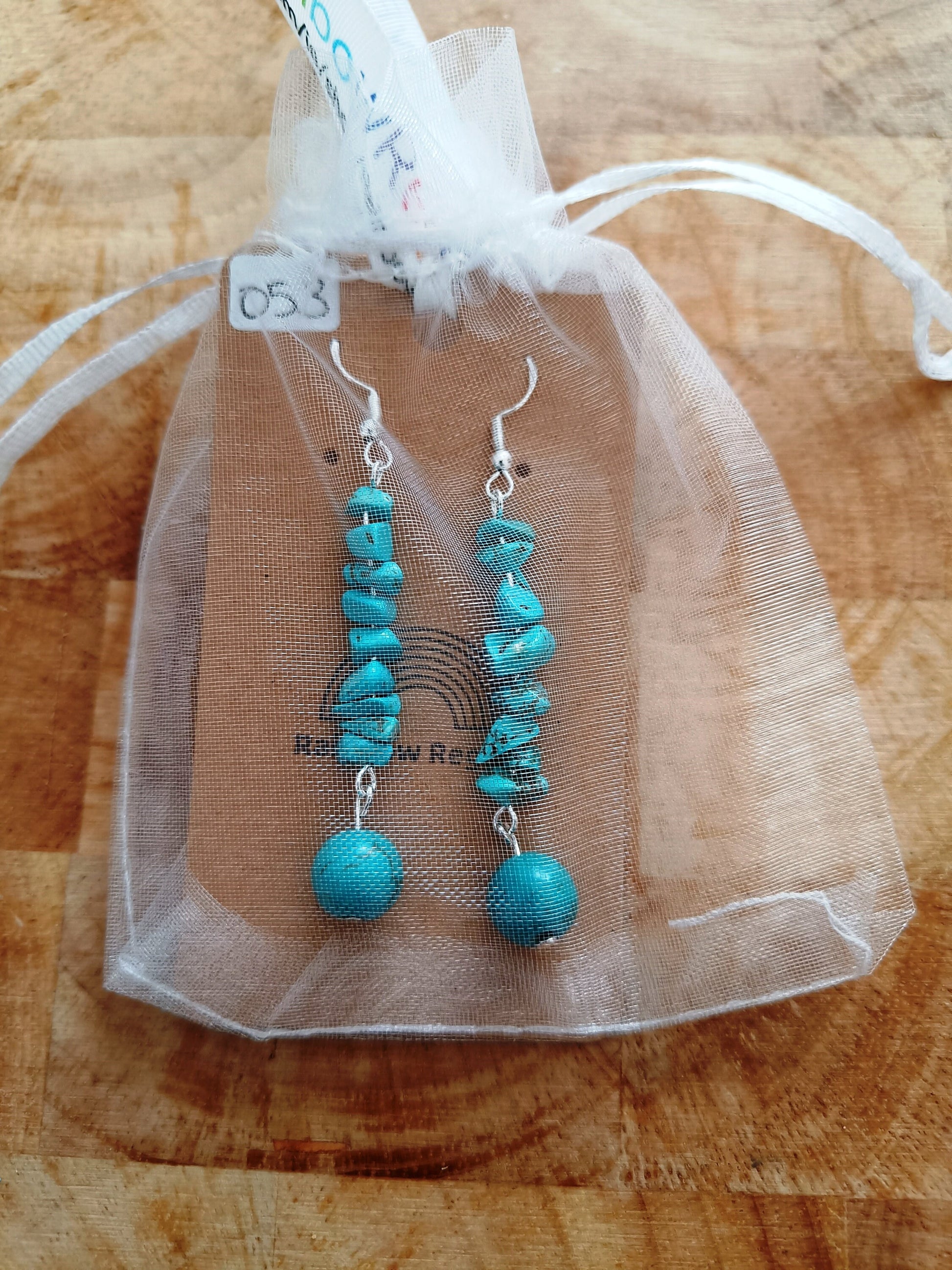 Elevate your look with our Long Turquoise Earrings. Each pair is handcrafted using repurposed genuine turquoise, making them truly one-of-a-kind. The beautiful chips and beads are delicately hung from sterling silver ear hooks, creating a stunning statement piece. With soft rubber backings for added security, these earrings are the epitome of luxury. Total length is approximately 65mm.