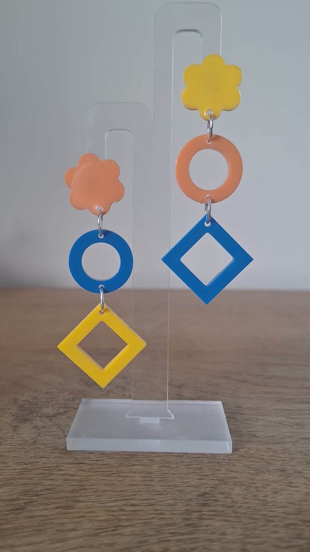 Brighten up any outfit with these quirky and fun Matilda Mismatched Earrings. Made from vibrant orange, blue, and yellow resin, these earrings are suspended from stainless steel studs and have a drop of 70mm. Make a statement and show off your playful style with these unique earrings!
