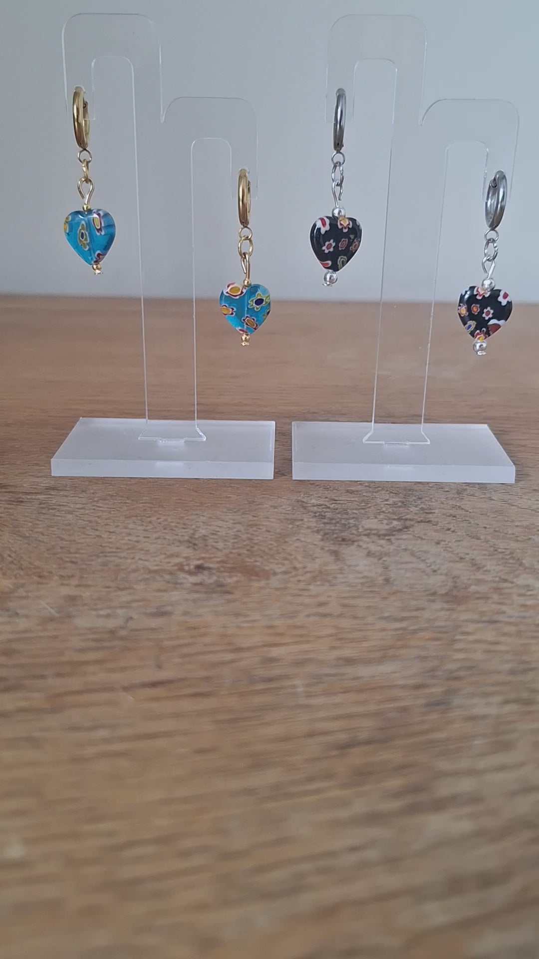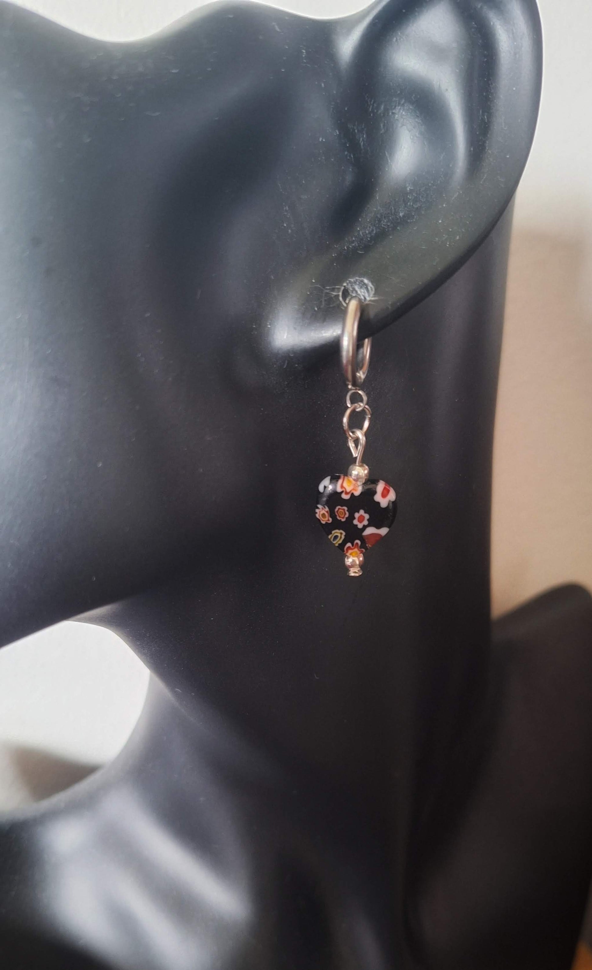 Eco-friendly and adorable, our Millefiori Heart Huggies adorn your ears with repurposed glass beads. Suspended from 10mm stainless steel or gold-plated huggies, these unique earrings are perfect for any occasion. (Ears never looked so cute!)