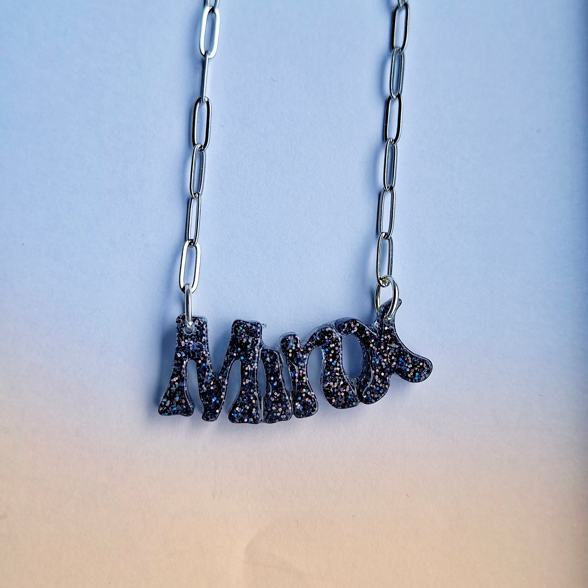 black holographic resin necklace, Minx necklace, stainless steel chain necklace, gold-plated chain necklace, statement resin necklace, handmade glitter necklace, cheeky jewellery, unique artisan necklace, sassy statement necklace, one-of-a-kind necklace