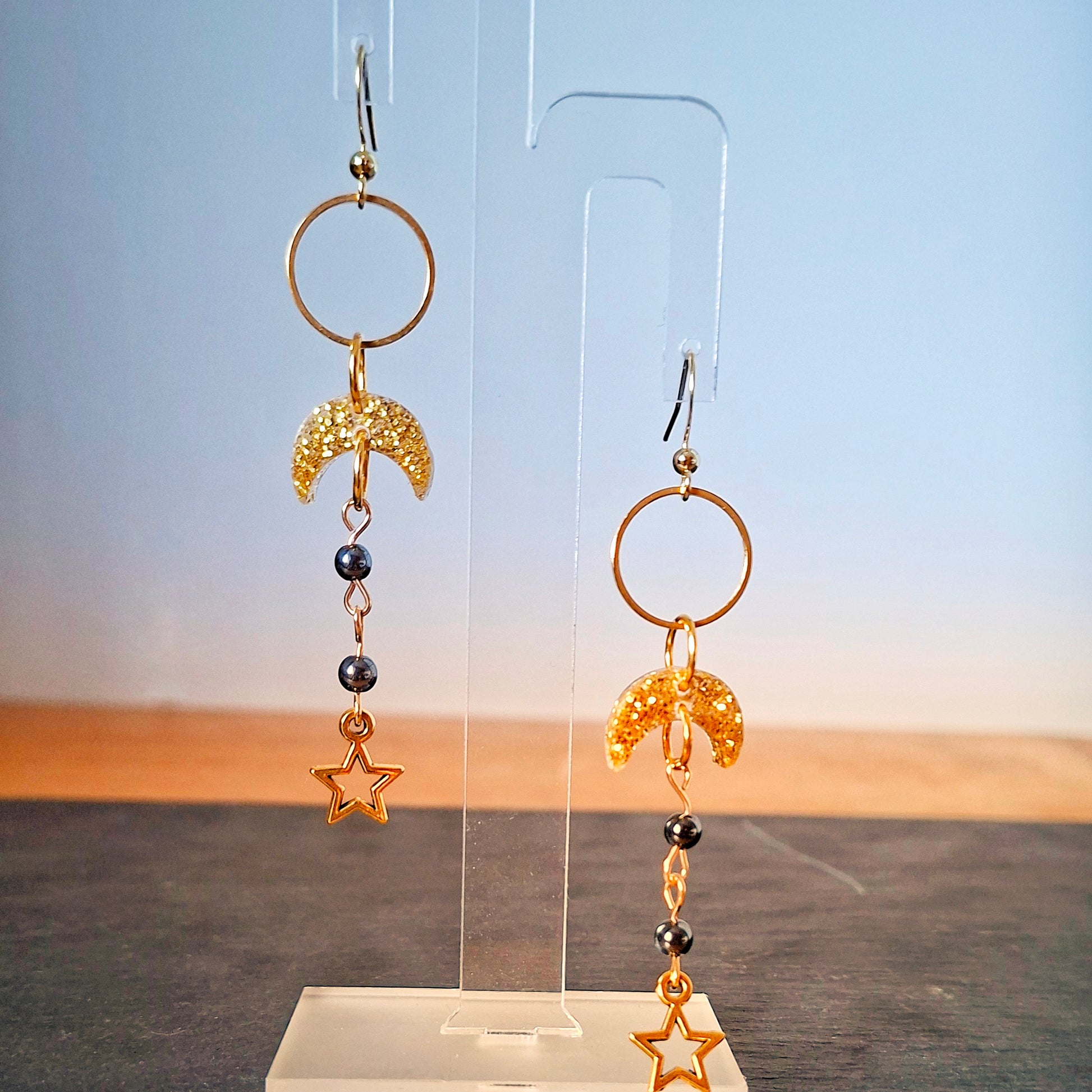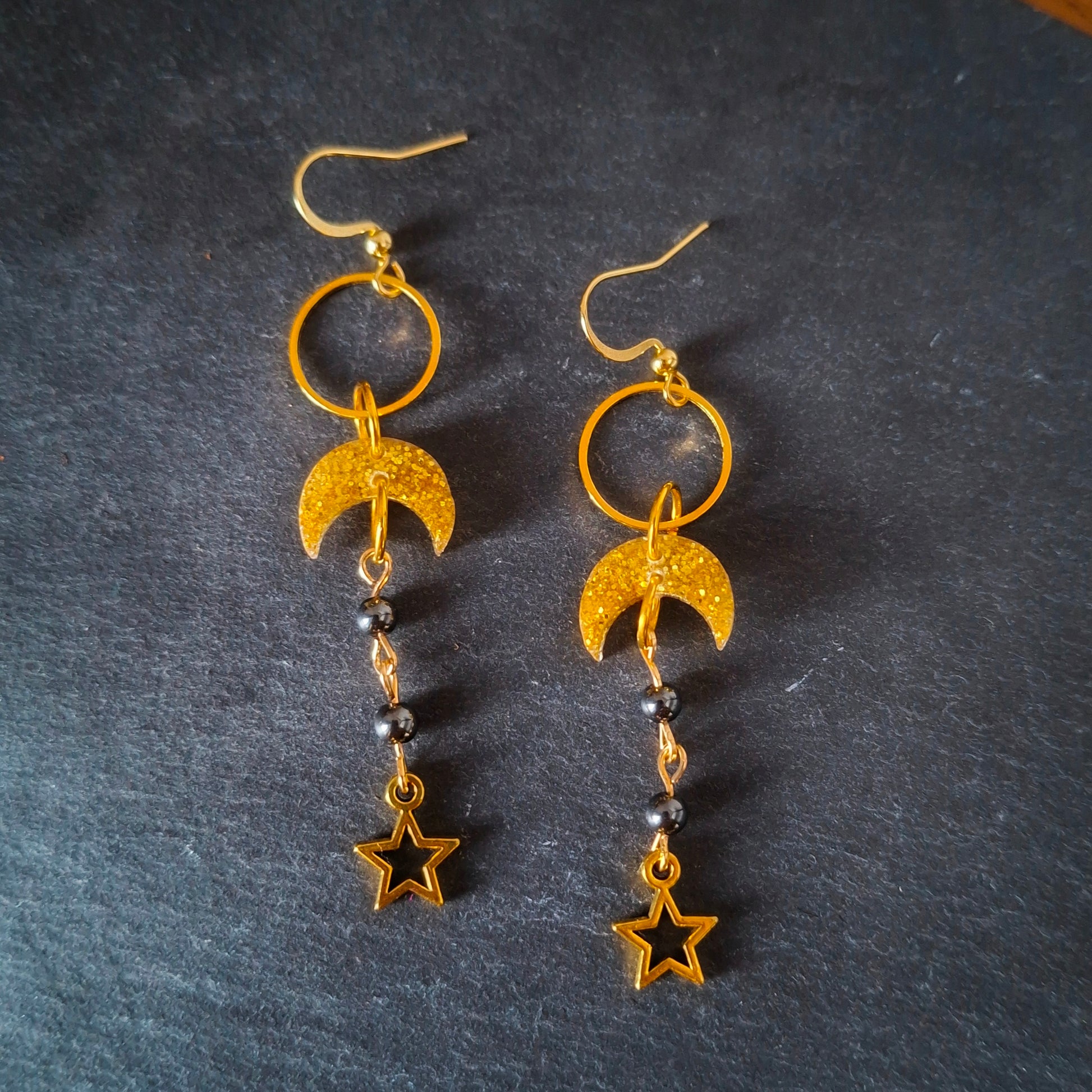 handmade witchy jewellery, celestial earrings, moon and star dangles, Wiccan inspired accessories, gold statement earrings, hematite jewellery, handmade jewellery Ireland, mystical earrings, moon priestess earrings.
