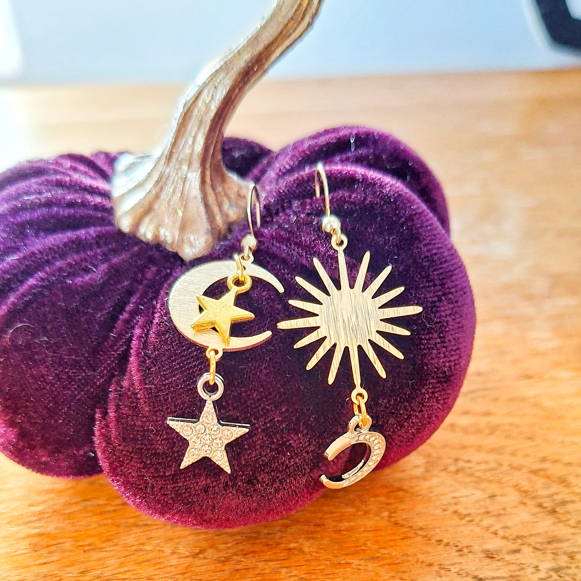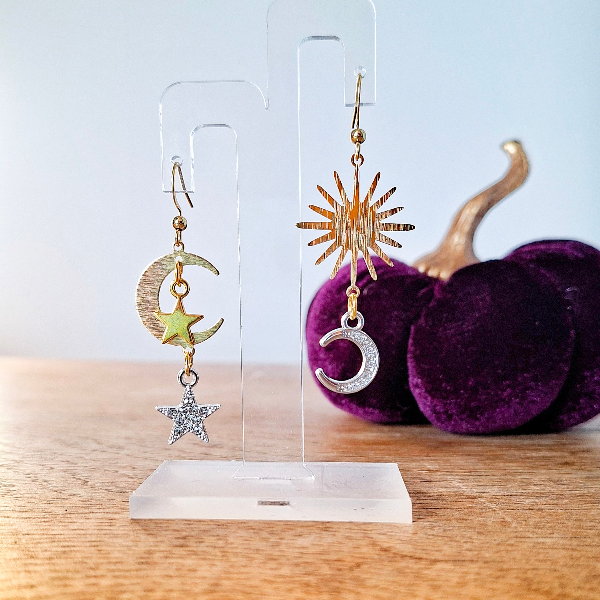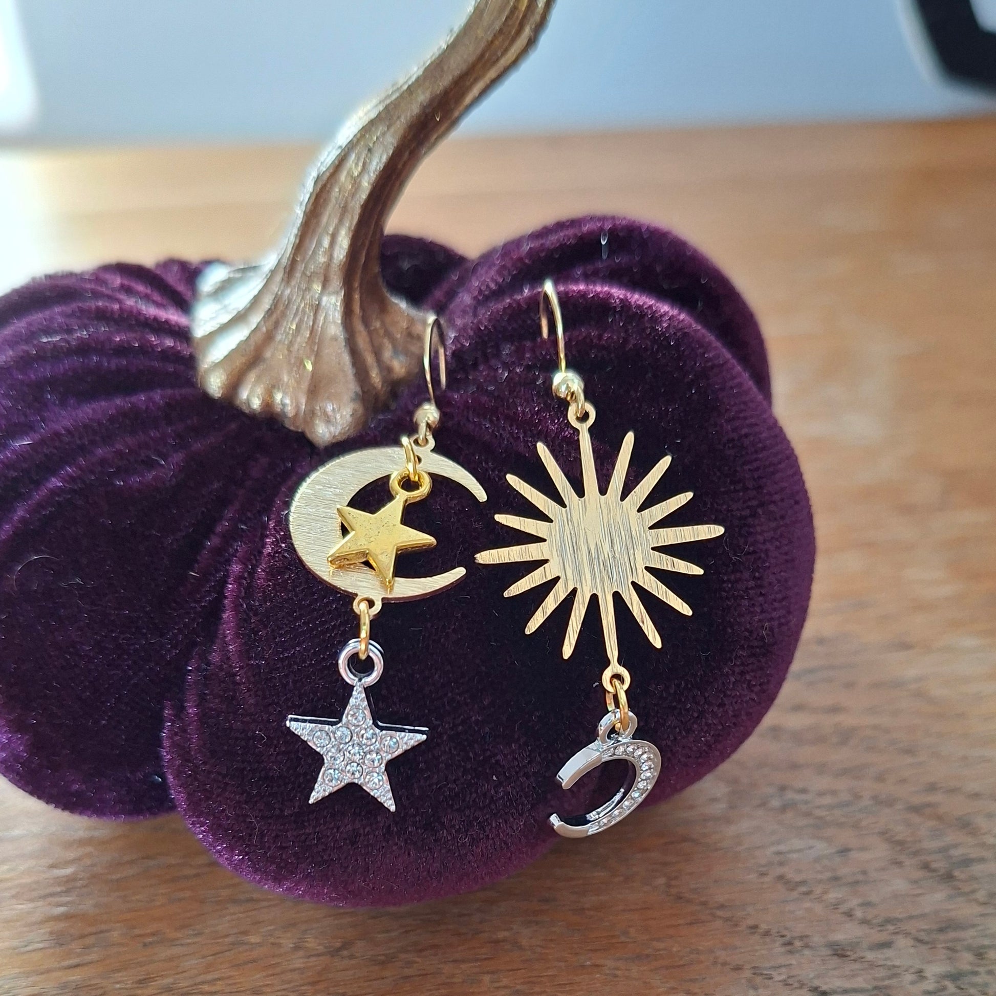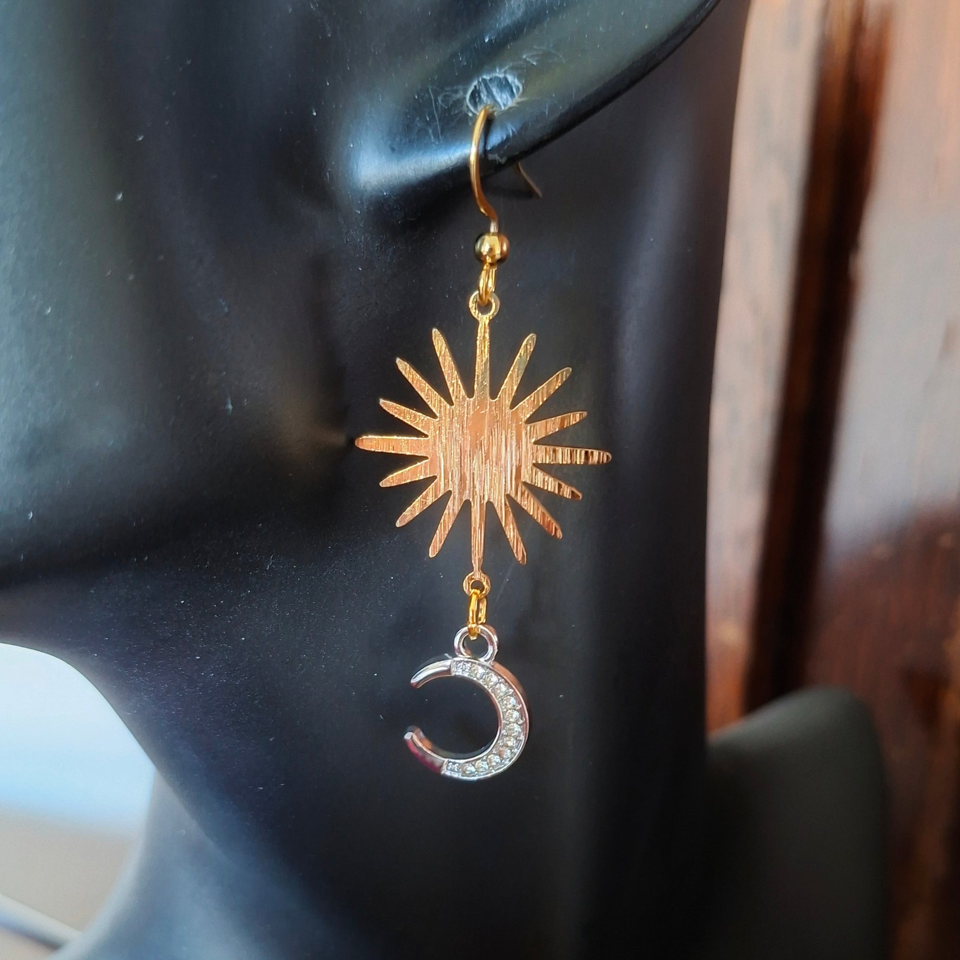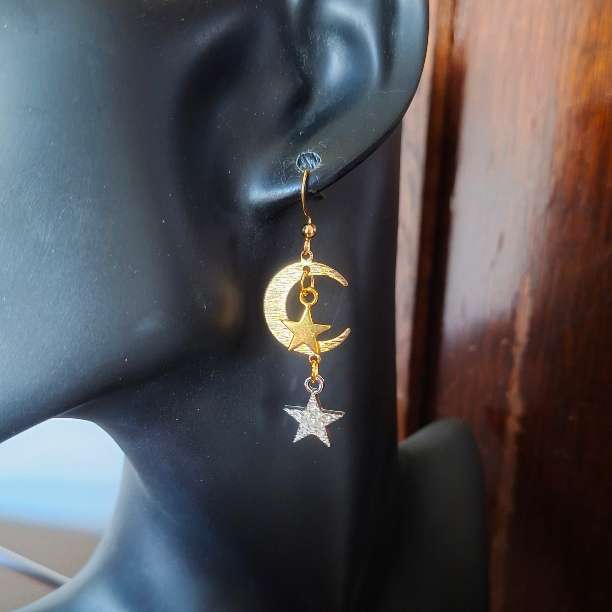 handmade celestial earrings, moon and star dangle earrings, mixed metal jewellery, gold plated earrings, unique handmade jewellery Ireland, one-of-a-kind earrings, moonrise earrings, mismatched earrings.