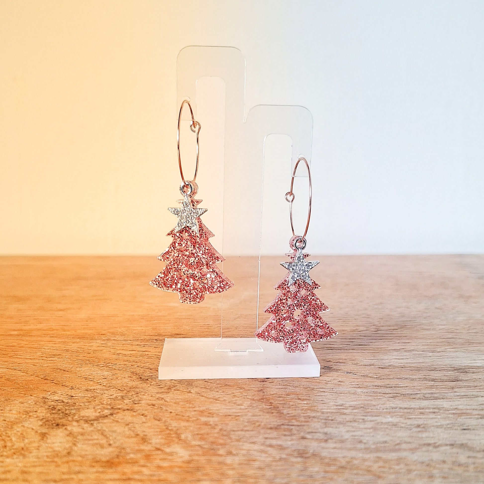 Add some sparkle to your festive look with our limited edition Norah Christmas Tree earrings. Made with rose-gold glitter and resin, and diamanté stars, these unique earrings are suspended from 25mm rose-gold plated hoops. The perfect accessory for the holiday season!