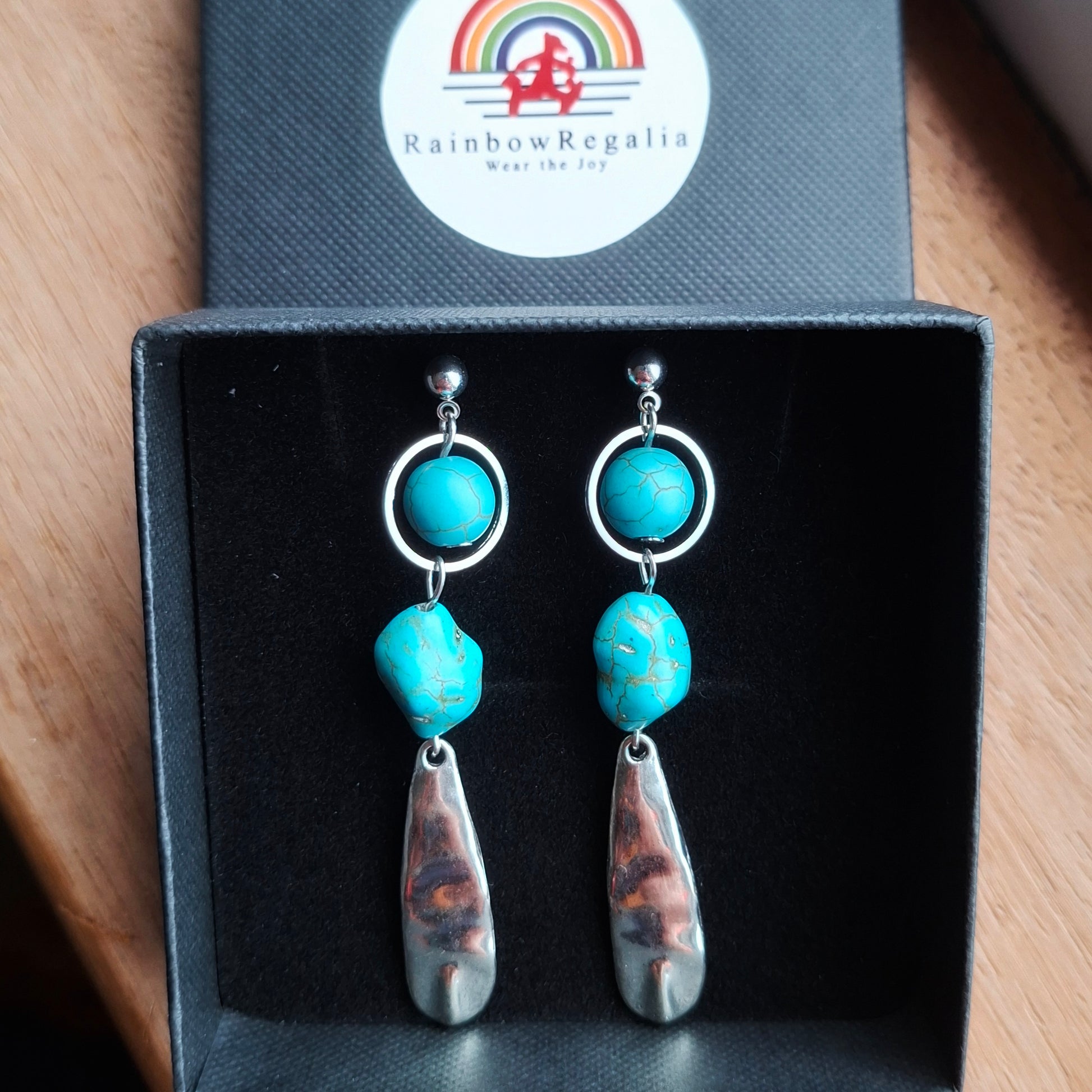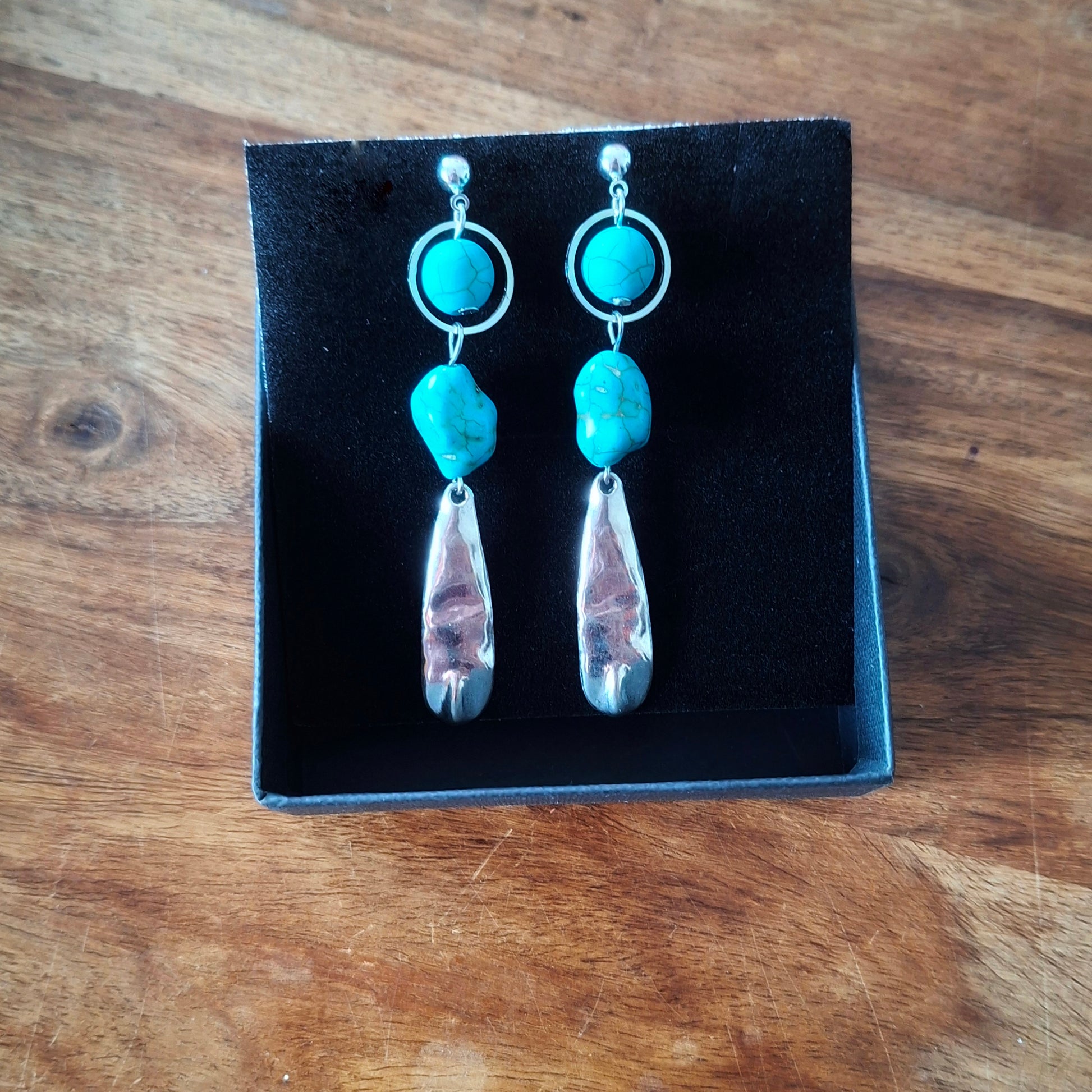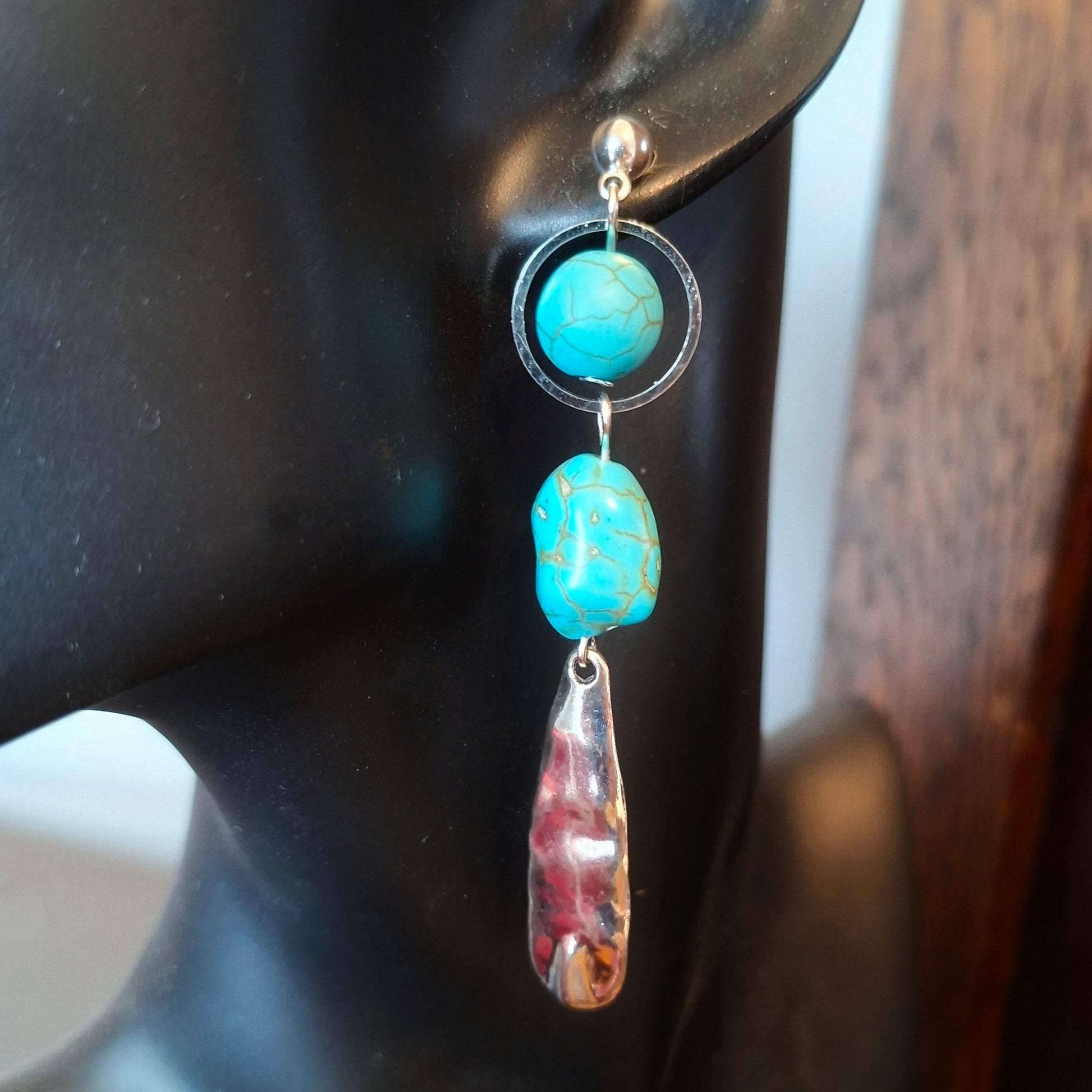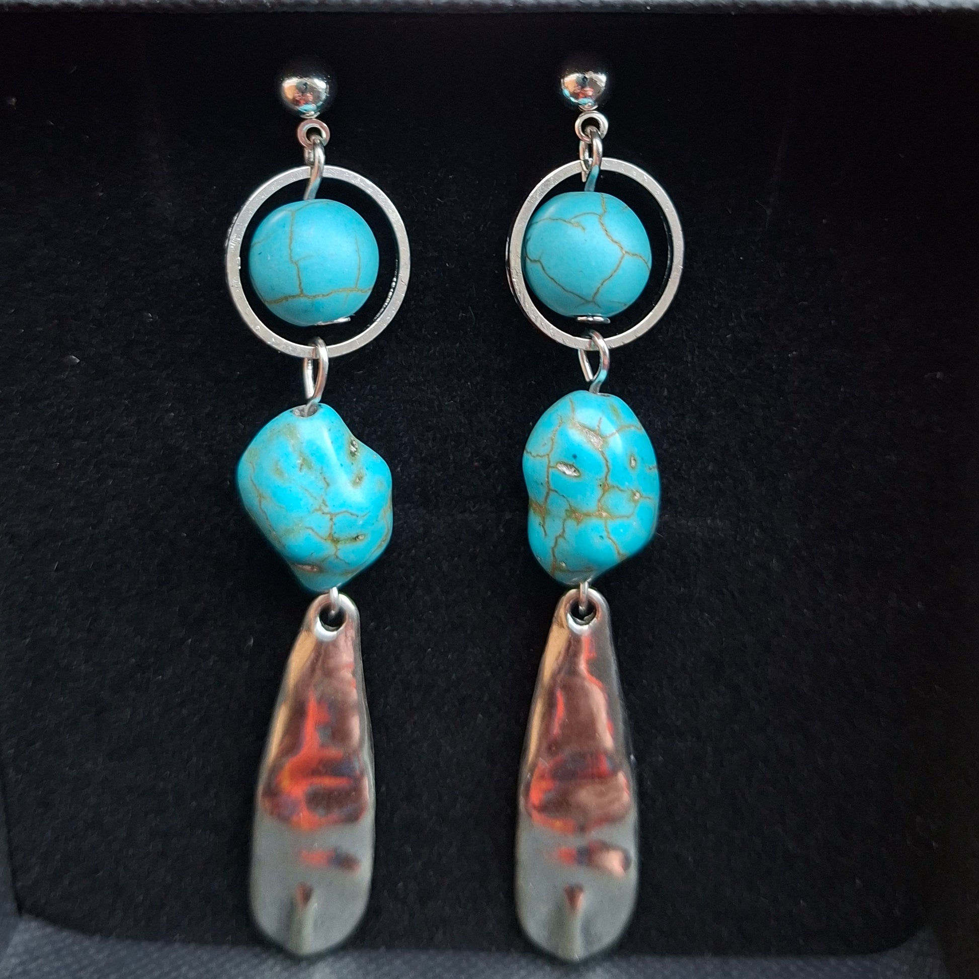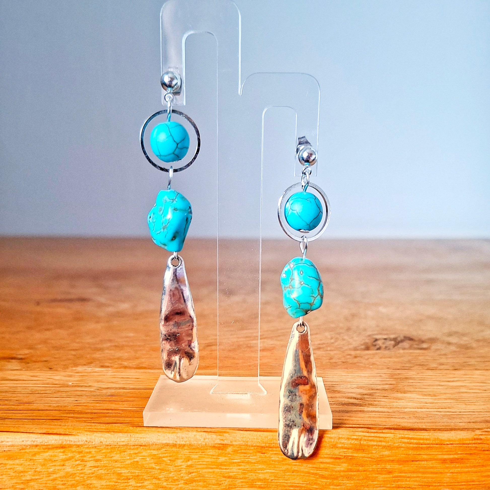turquoise nugget earrings, long dangle earrings, silver-plated earrings, handmade statement earrings, repurposed bead earrings, beach-inspired jewellery, unique artisan earrings, boho chic earrings, ocean-inspired earrings, one-of-a-kind earrings