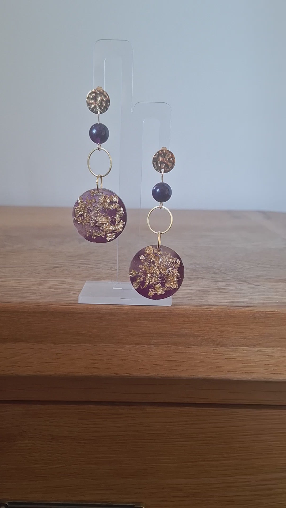 Indulge in luxury with these exclusive Octavia Amethyst Earrings. Made with repurposed amethyst beads, resin, and gold leaf discs, these statement earrings are truly one-of-a-kind. Suspended from gold-plated hammered studs, they offer a sophisticated and elegant look with a 75mm drop. Elevate your style with these unique creations.