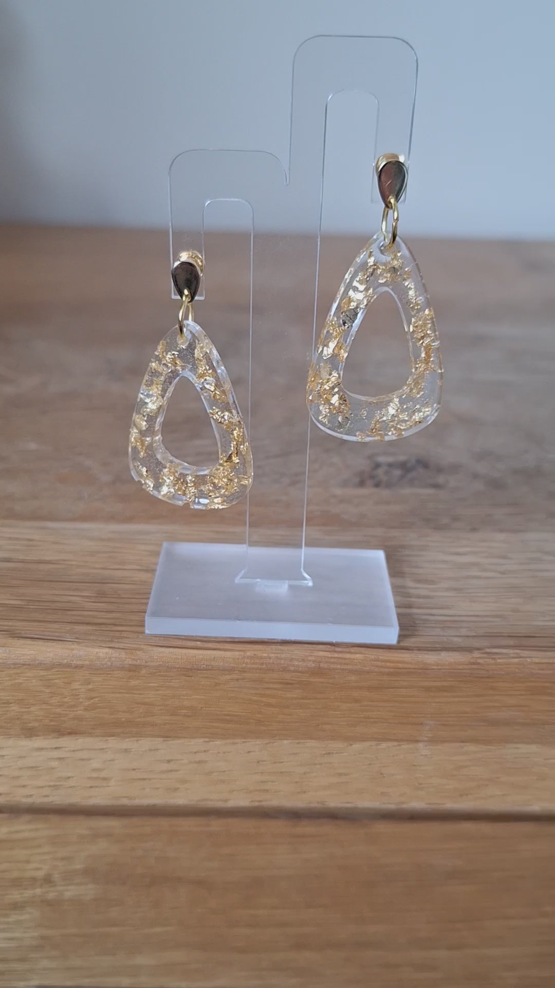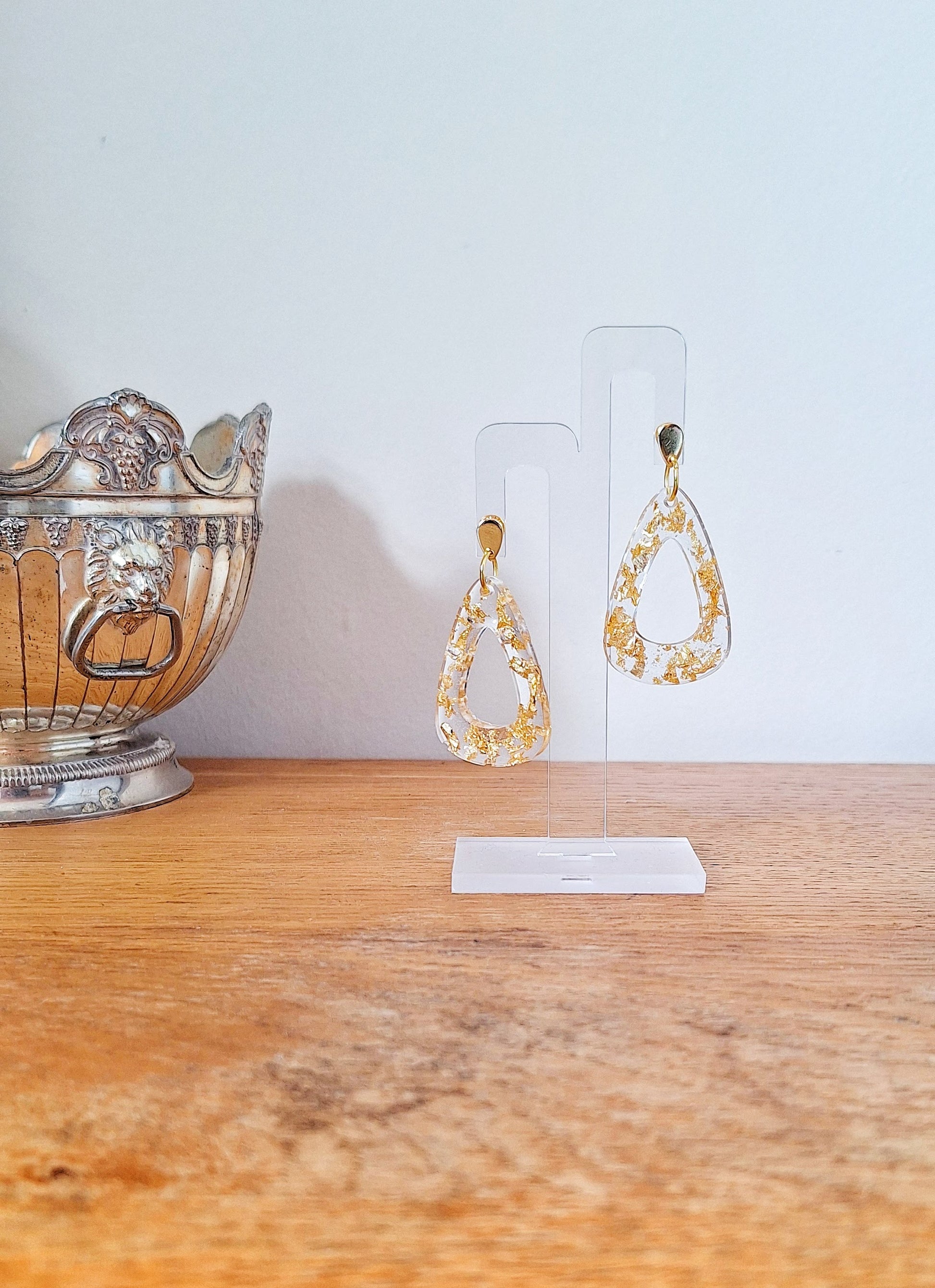 Indulge in the elegance of the Oriana Gold Leaf Earrings. Handcrafted with resin and real gold leaf, each piece boasts a unique 50mm drop. Suspended from gold-plated teardrop studs, these earrings add a playful and luxurious touch to any outfit. Elevate your style with a touch of golden charm.