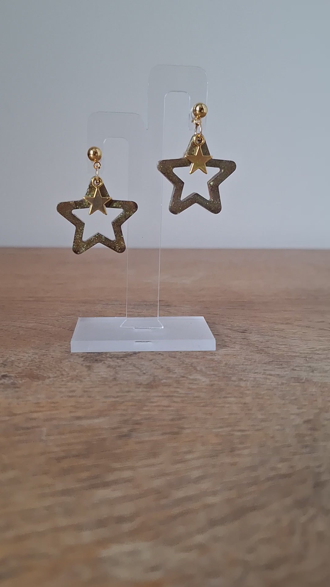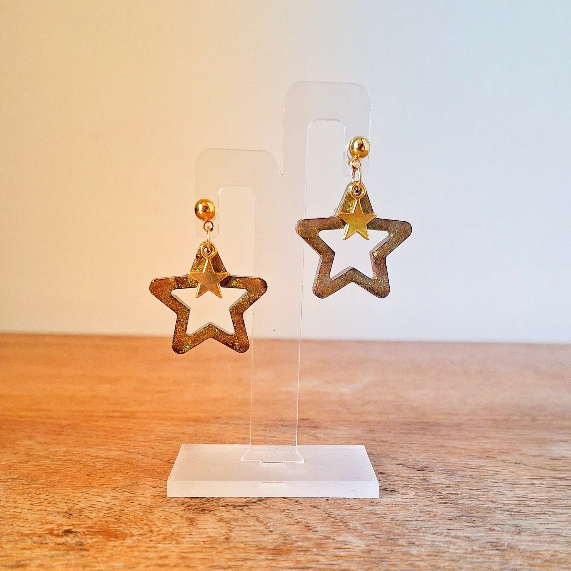 Add a touch of magic to your outfit with these limited edition Orion Star Earrings. The iridescent resin catches the light, while the gold star charms dangle playfully from gold plated ball studs. A perfect combination of whimsy and elegance. (Only a few left - get them while you can!)