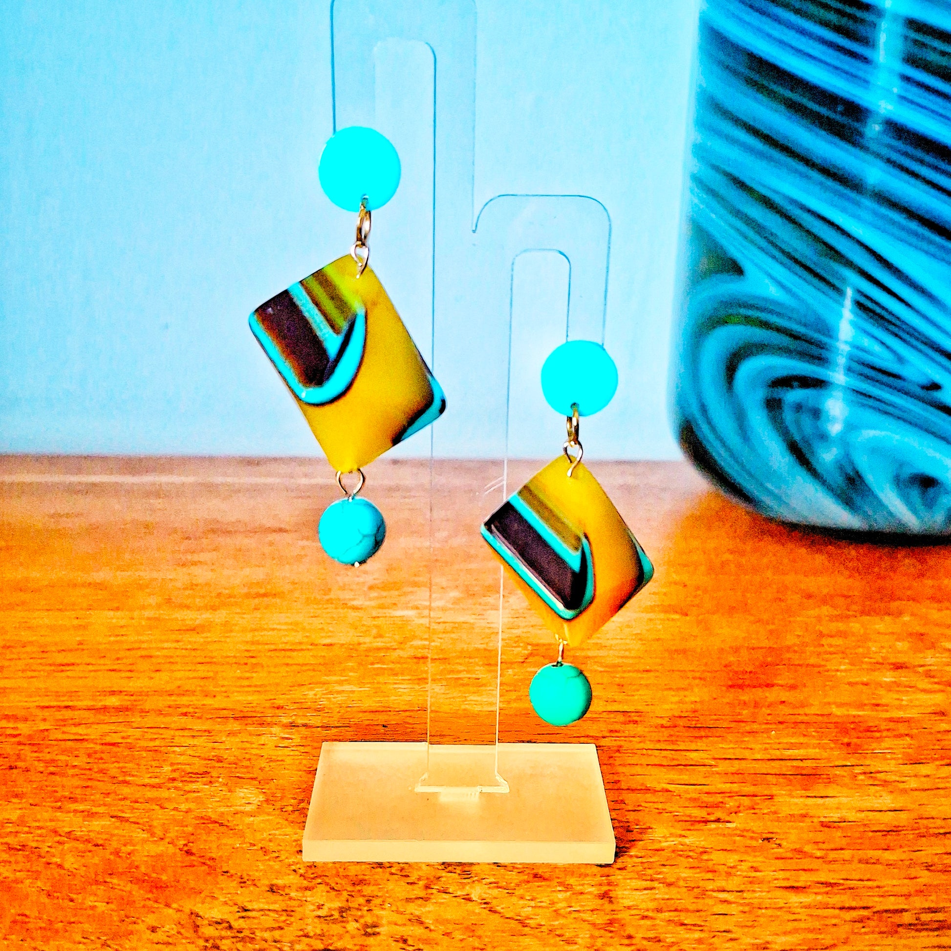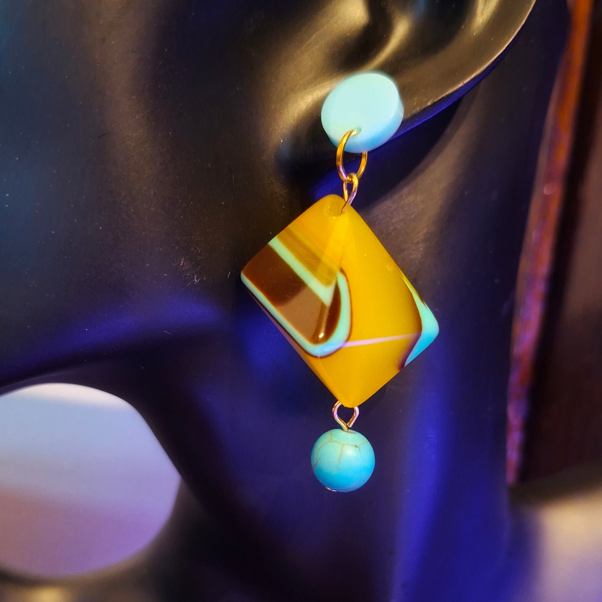 retro earrings, 70s inspired jewellery, repurposed vintage beads, handmade resin stud earrings, turquoise statement earrings, one-of-a-kind earrings, colourful dangle earrings, boho retro jewellery, sustainable fashion accessories, handmade Irish jewellery, RainbowRegalia earrings