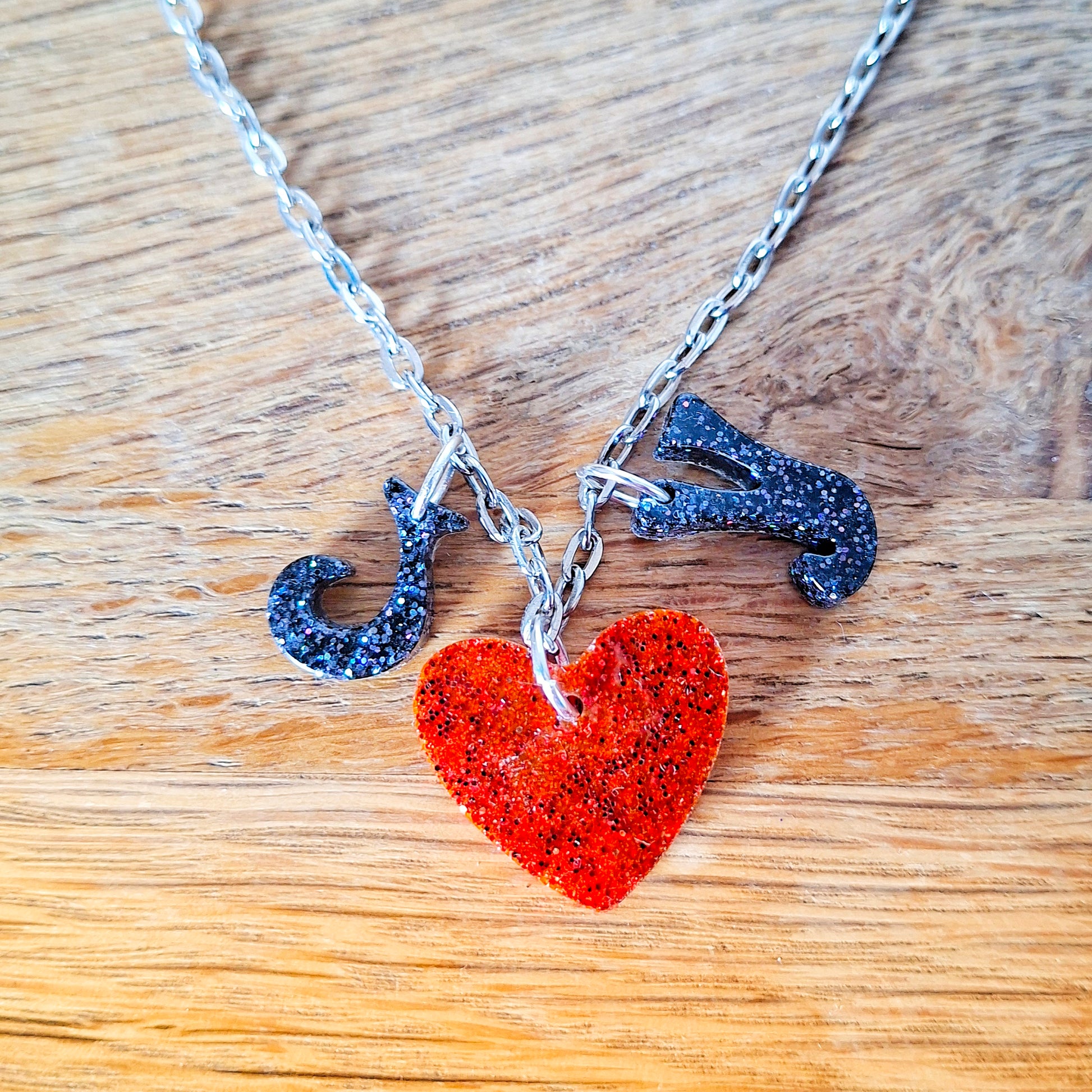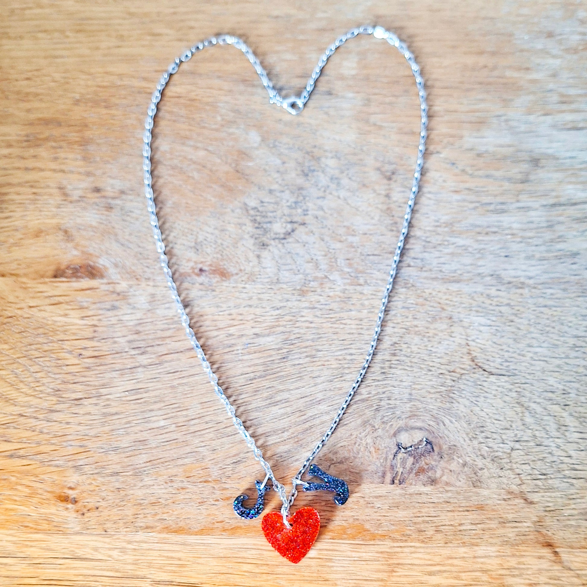 This necklace features a playful trio spelling out JOY, with a glittering heart sitting right where it belongs — front and centre. Handmade using glitter resin, it catches the light beautifully without shouting about it (although it is allowed to shout a little, if the mood takes you).