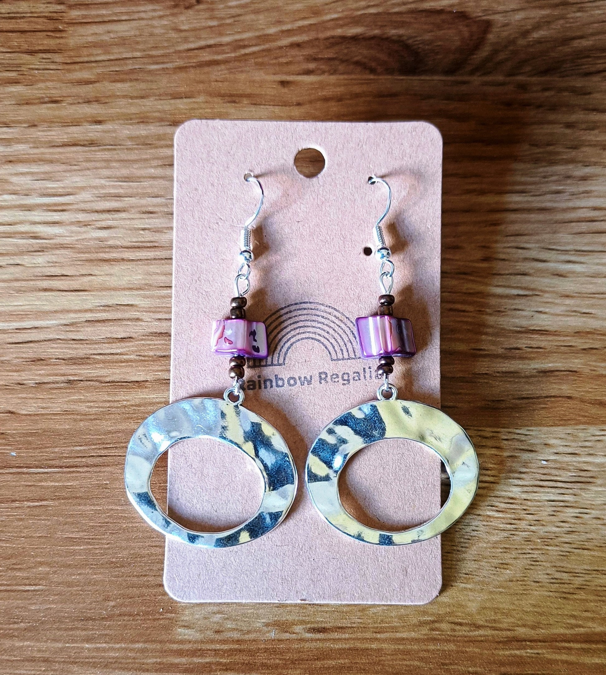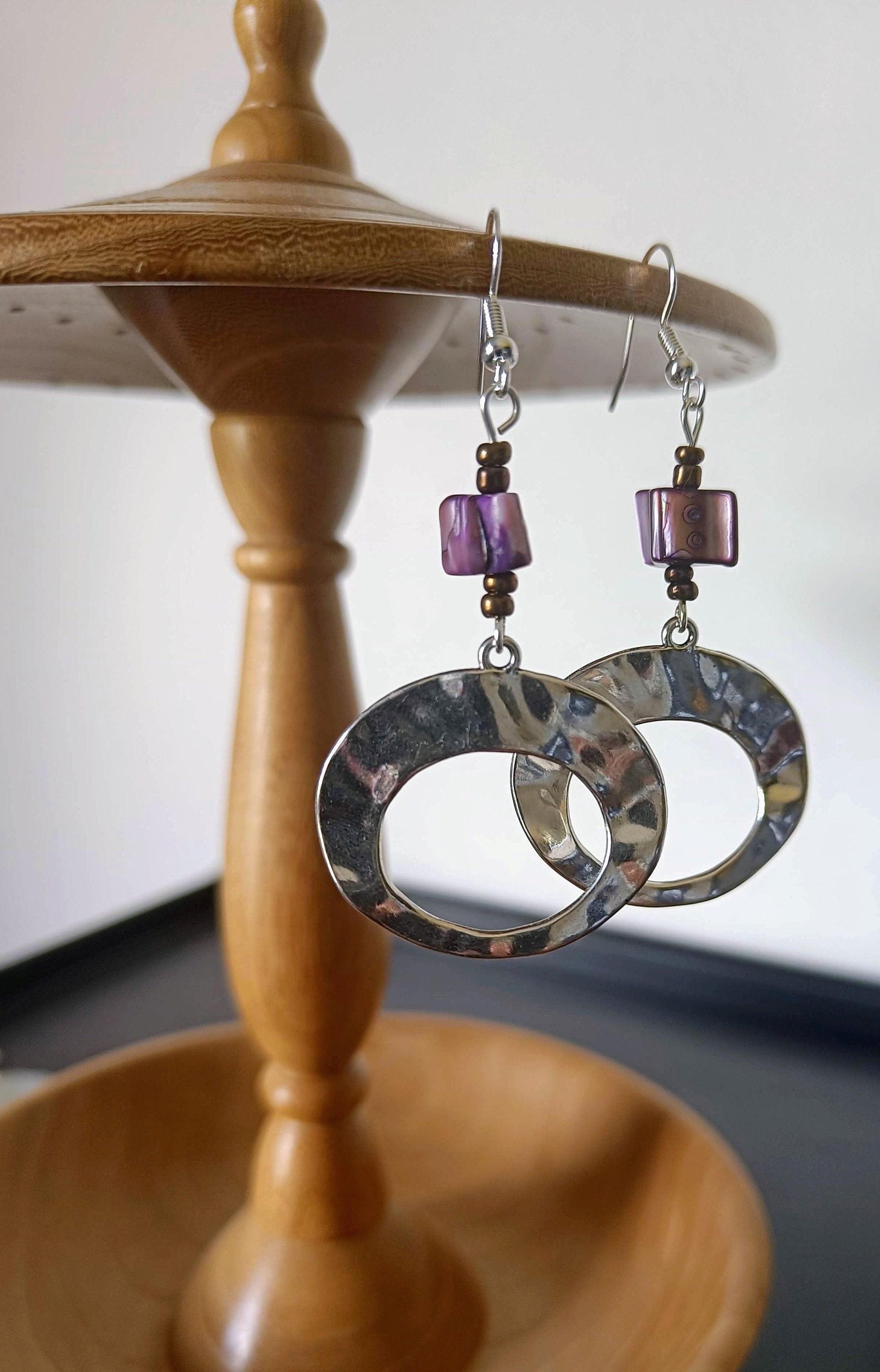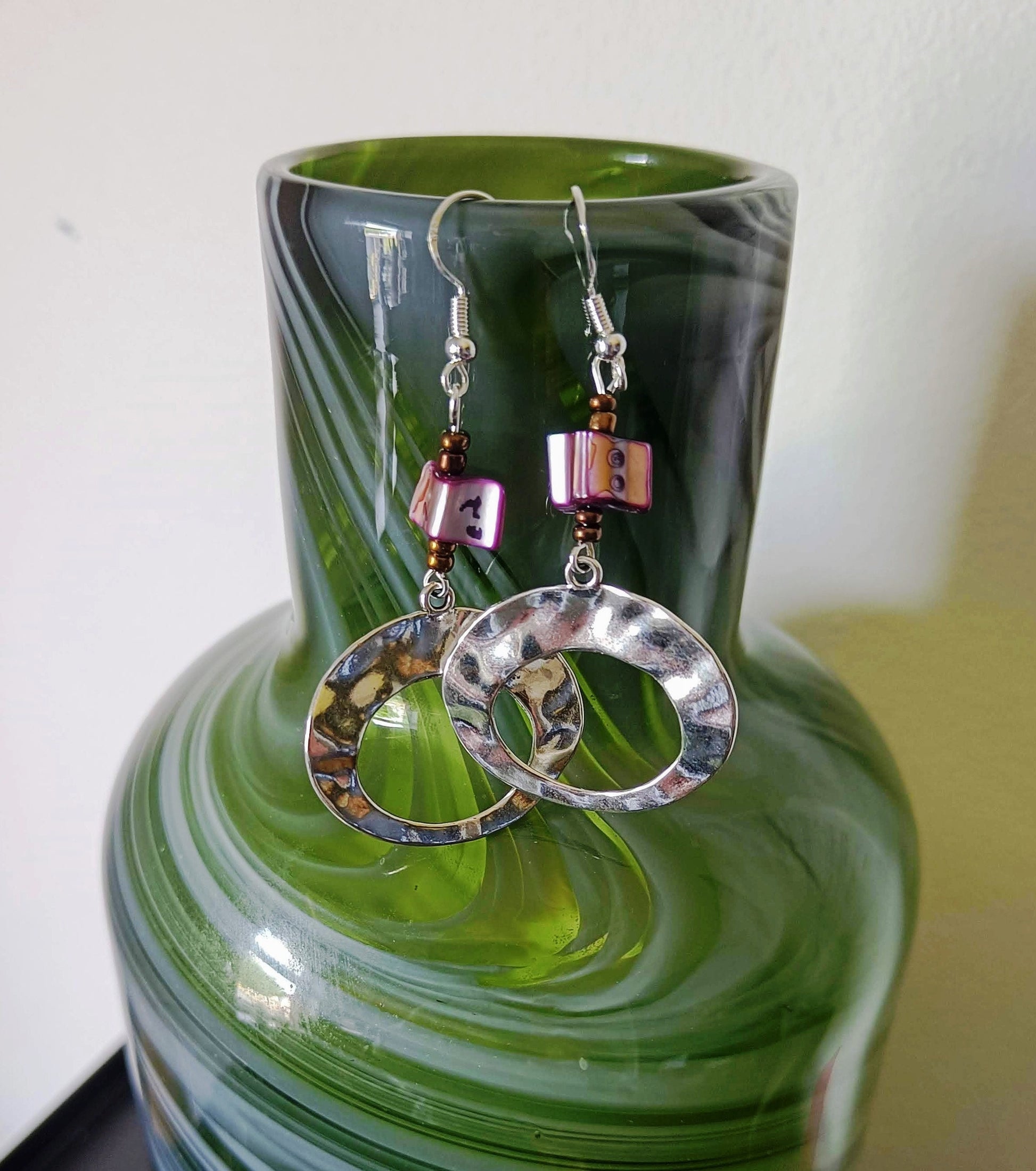 These earrings are made using repurposed purple and bronze glass beads and feature a large hoop (made with antique silver - a lead-free and nickel-free metal Zinc alloy).