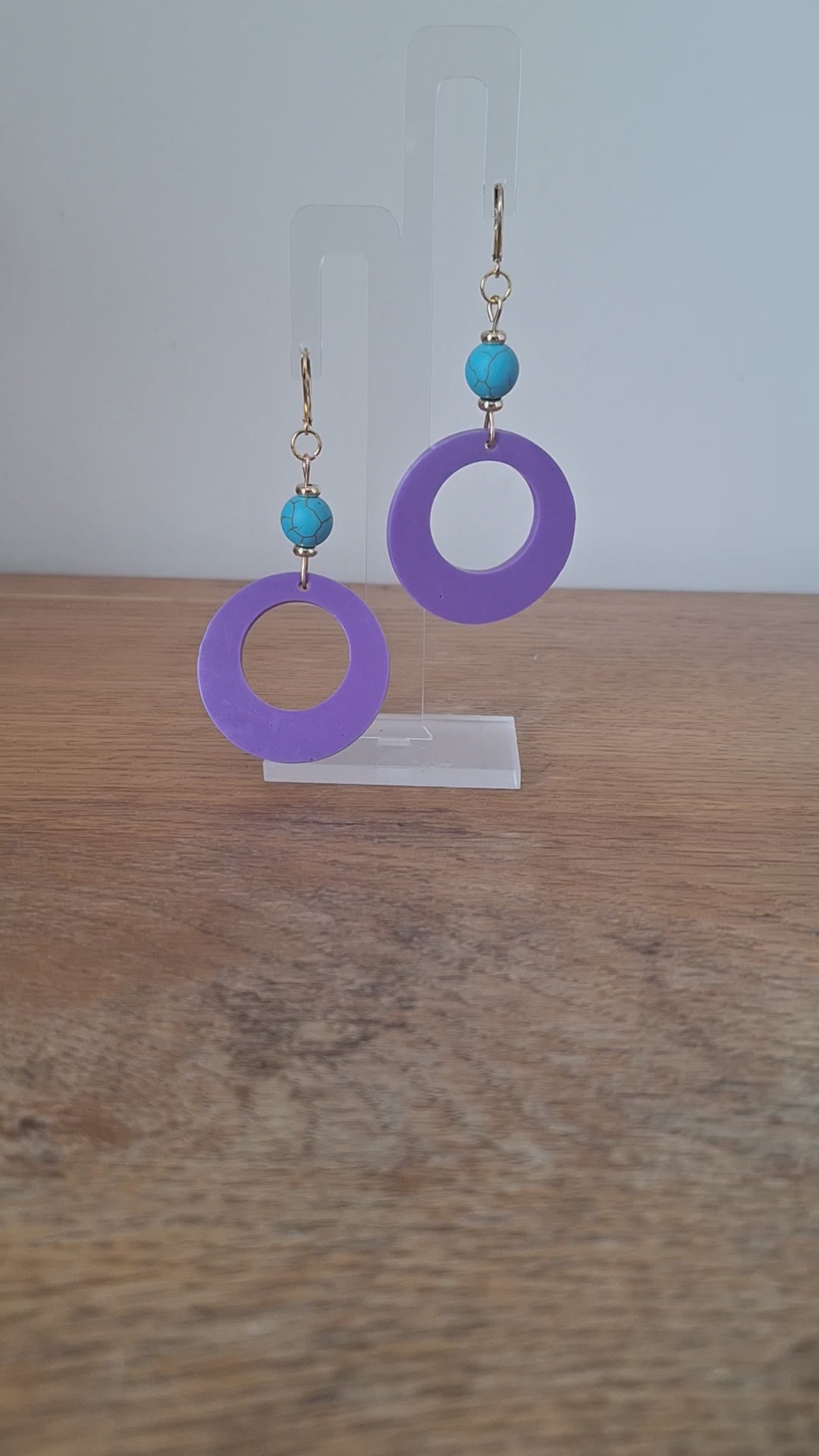 Add a pop of color with our Rachel Turquoise Earrings! These quirky 75mm long earrings feature handmade purple resin discs and repurposed turquoise stone beads, suspended from secure lever back gold-plated ear wires. Perfect for adding a playful touch to any outfit. (Note: due to handmade nature, each pair may vary slightly).