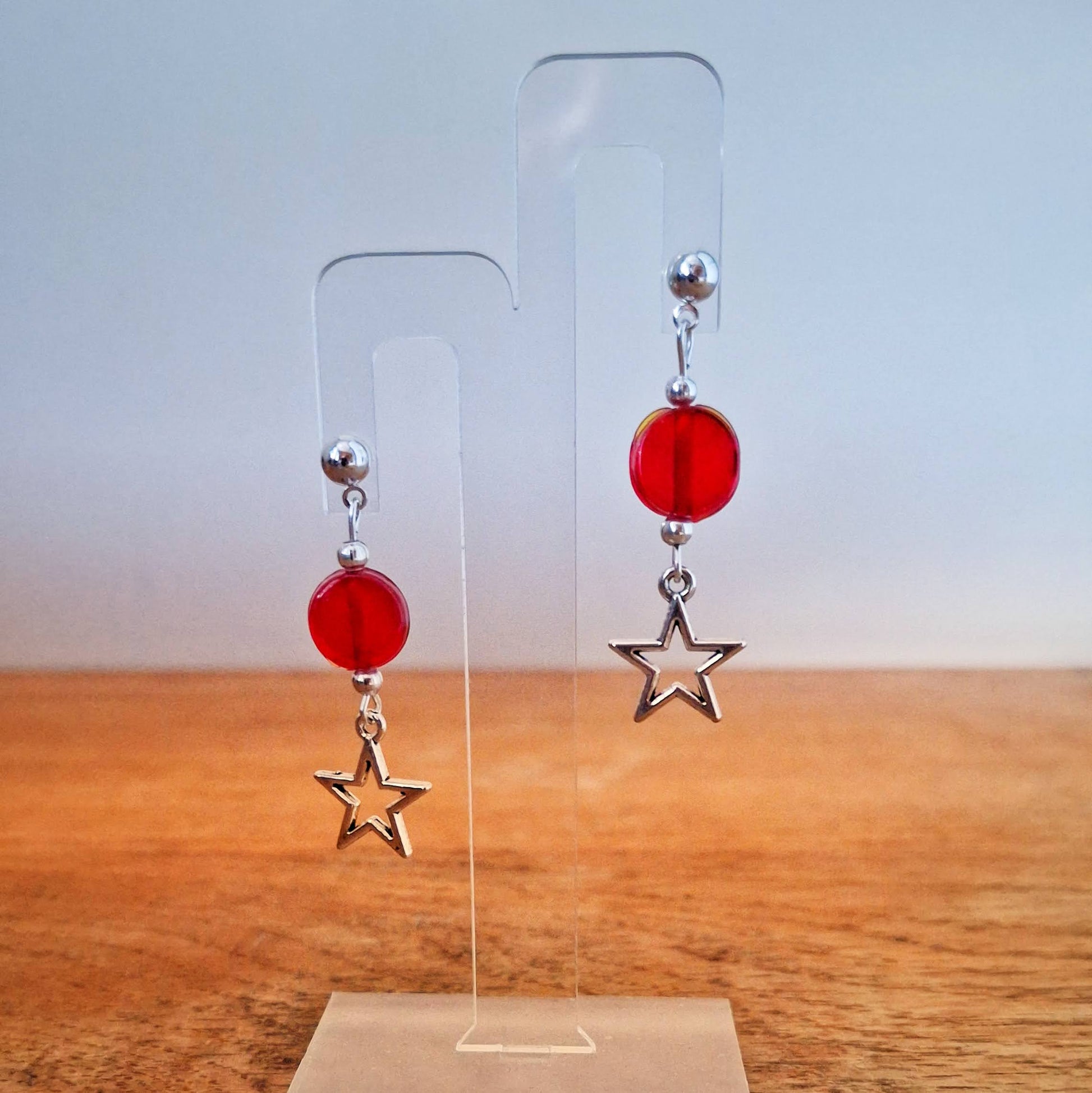 Shine bright with our Ruby Star Earrings! These limited edition earrings are handmade using repurposed vintage red glass beads and silver-plated stars. Perfectly suspended from silver-plated ball studs. Be the star of the show with these unique and eco-friendly earrings.
