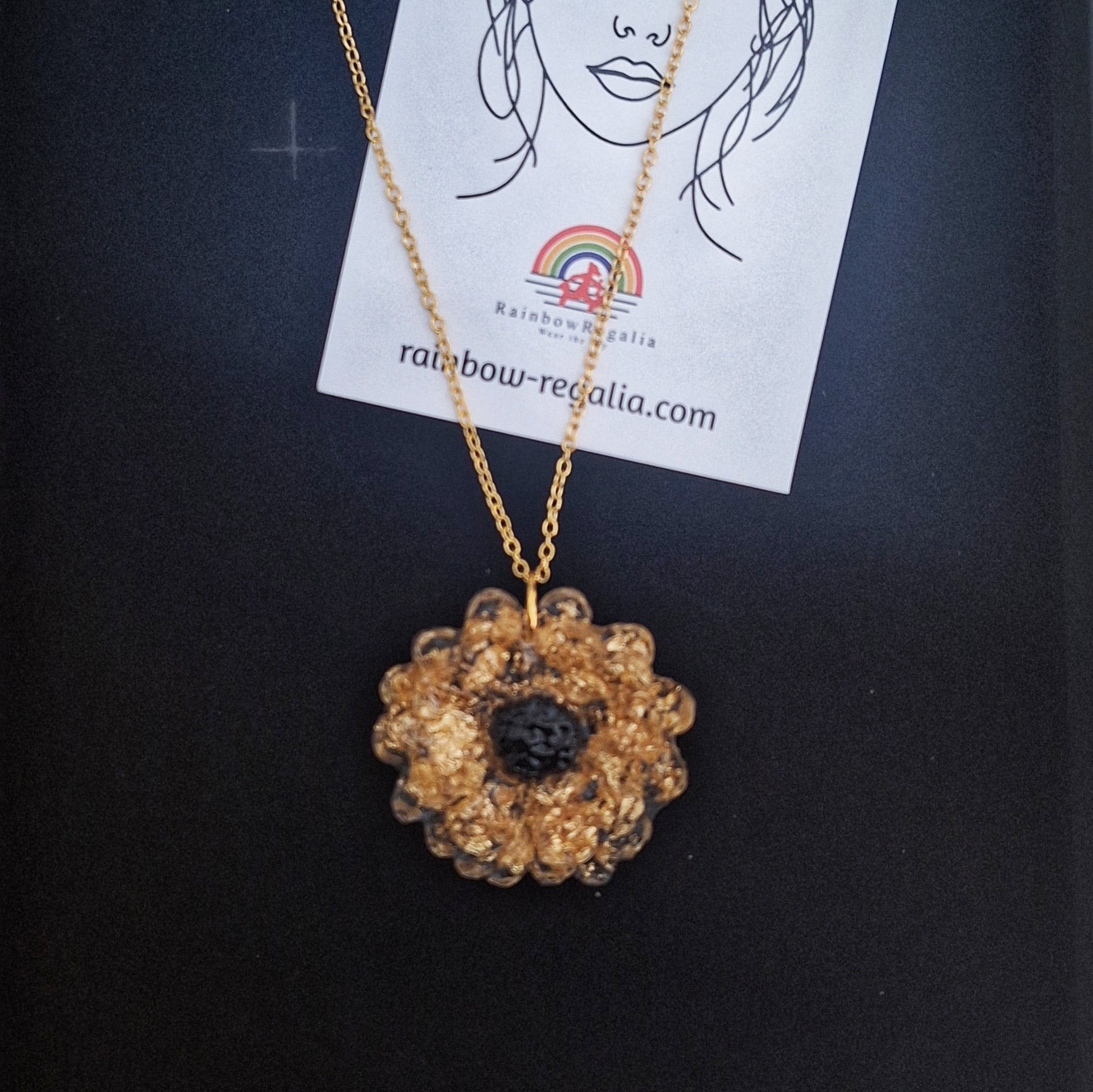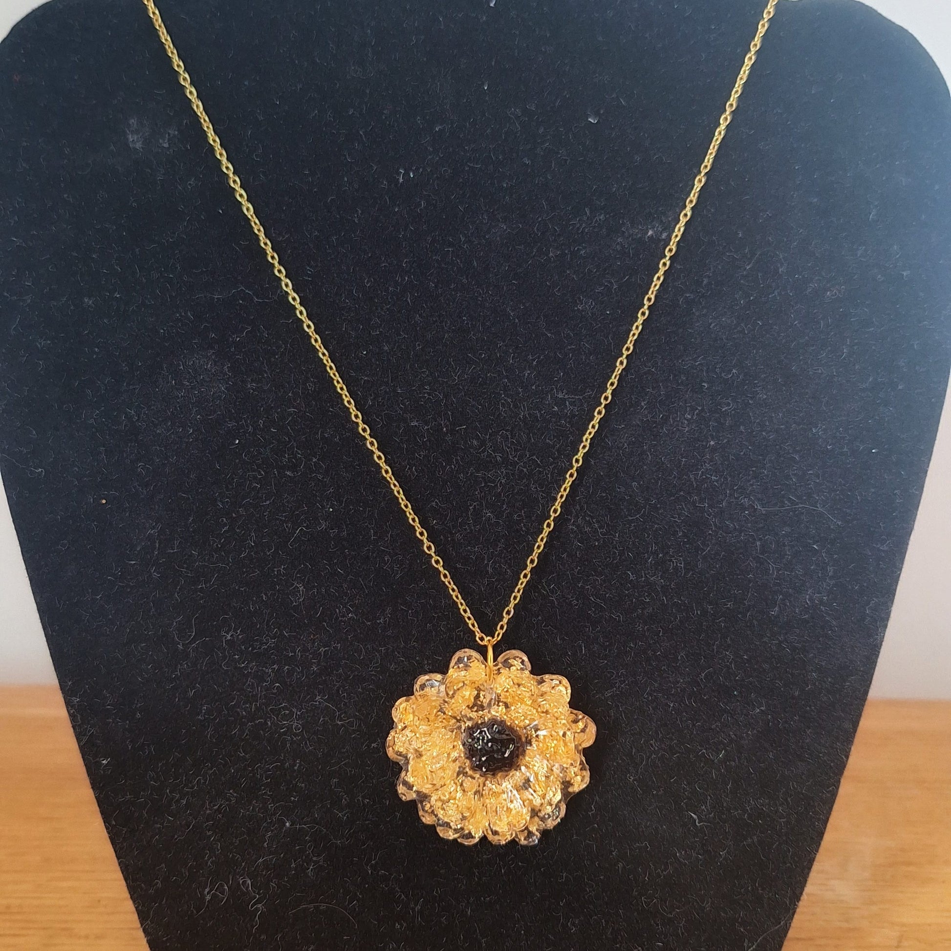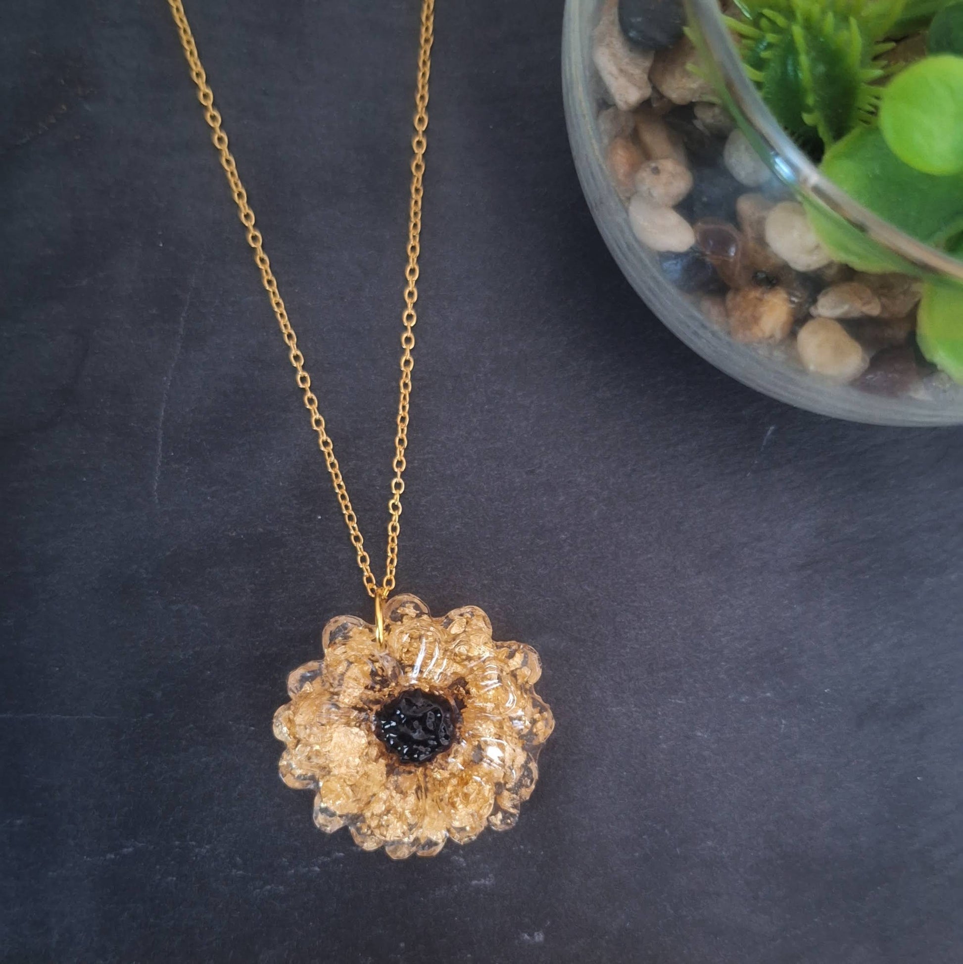 Sadie Sunflower Necklace, sunflower pendant necklace, gold leaf resin necklace, sunflower jewellery handmade, gold plated chain necklace, limited edition sunflower necklace, summer inspired jewellery, floral resin necklace, sunshine vibes necklace, handmade nature inspired jewellery