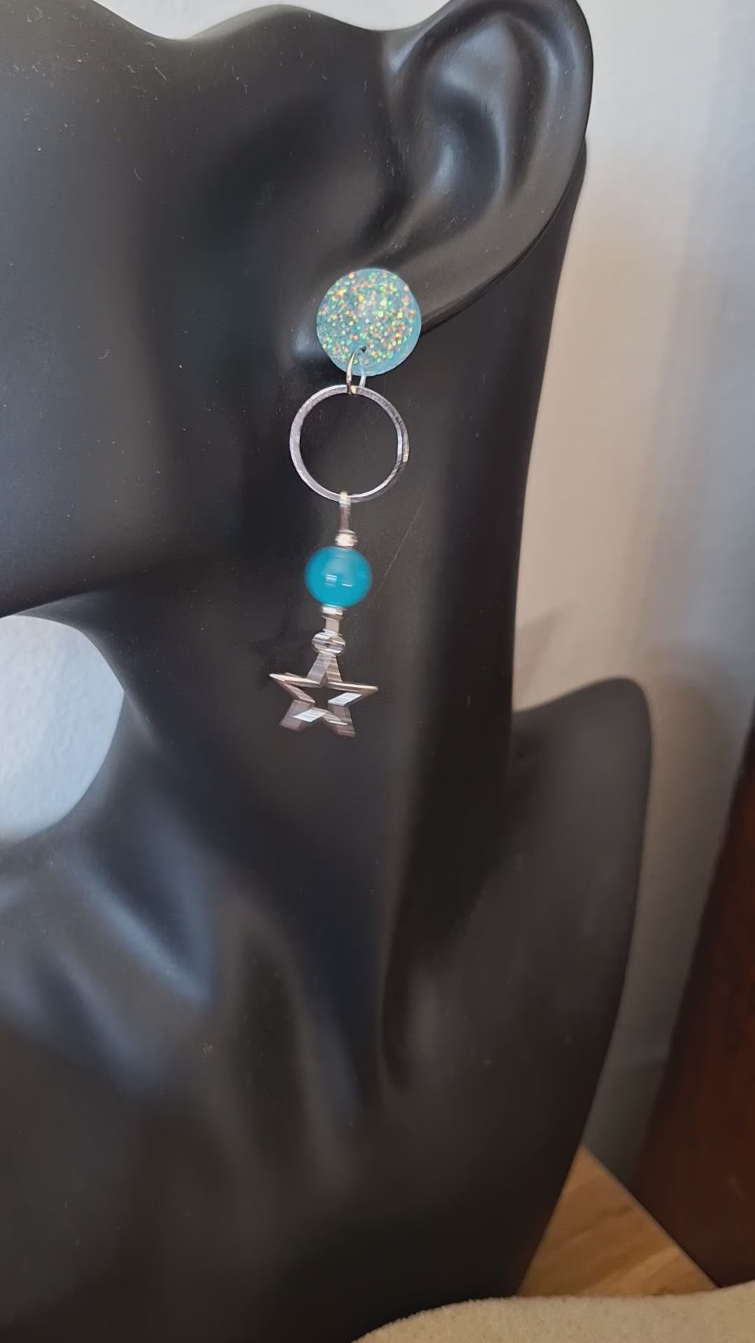 Add a touch of celestial charm with the Seraphina Blue Star Earrings. These 62mm long earrings are crafted from repurposed glass beads and adorned with silver-plated star charms. The handmade resin and stainless steel studs add a unique and sustainable touch. Shine bright like a star with these quirky earrings!