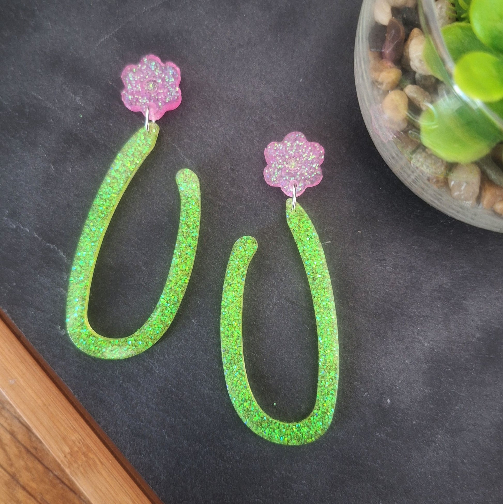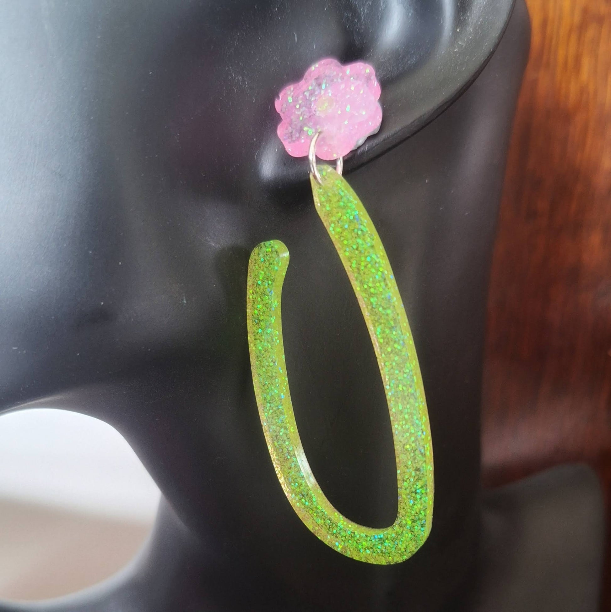 fluorescent earrings, green and pink glitter earrings, stainless steel stud earrings, 75mm dangle earrings, handmade statement earrings, bold statement earrings, attention-grabbing earrings, unique artisan earrings, disco inspired earrings, one-of-a-kind earrings