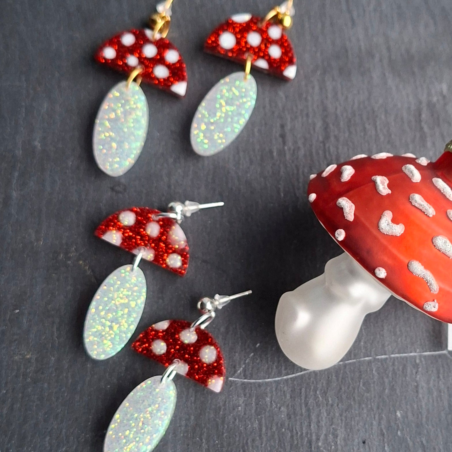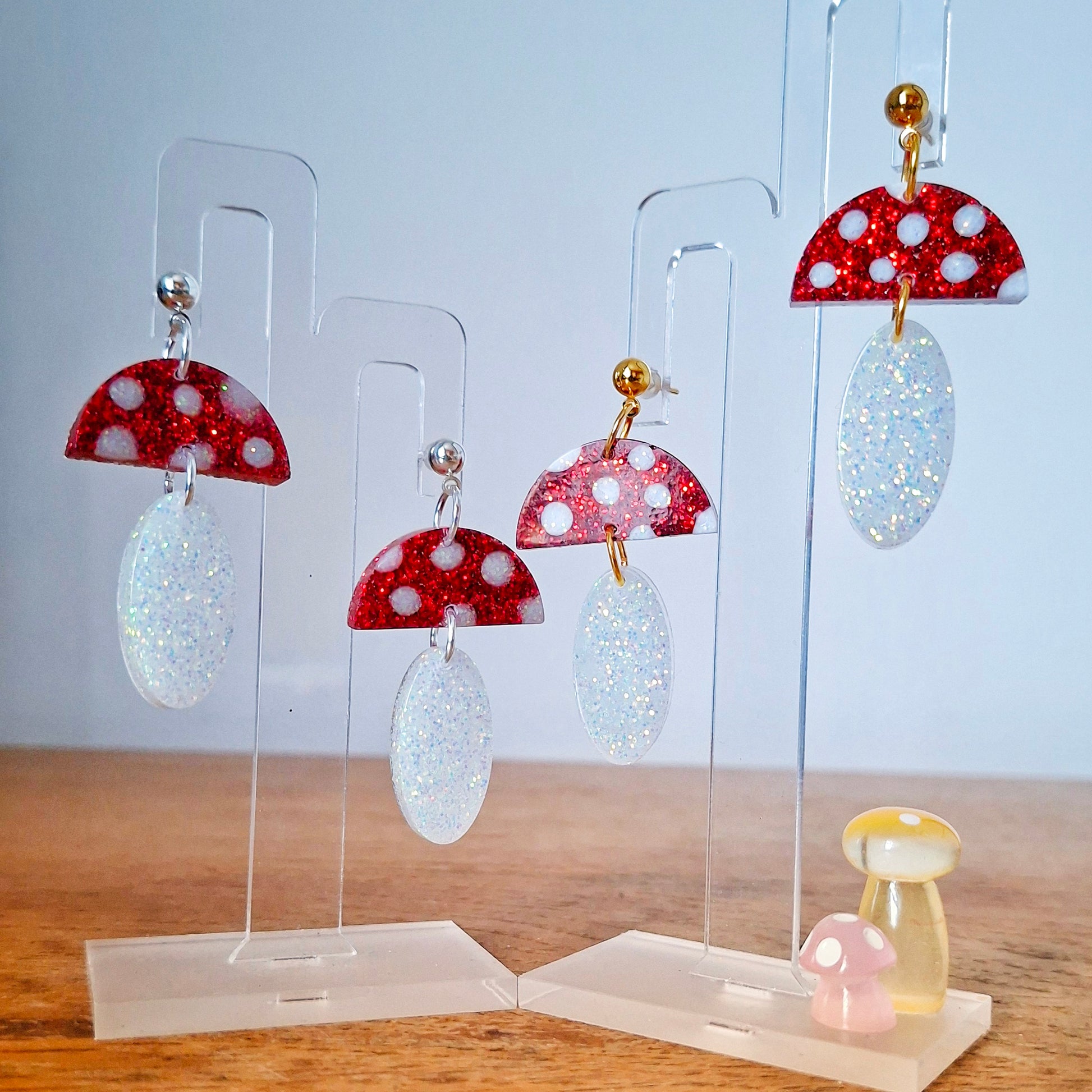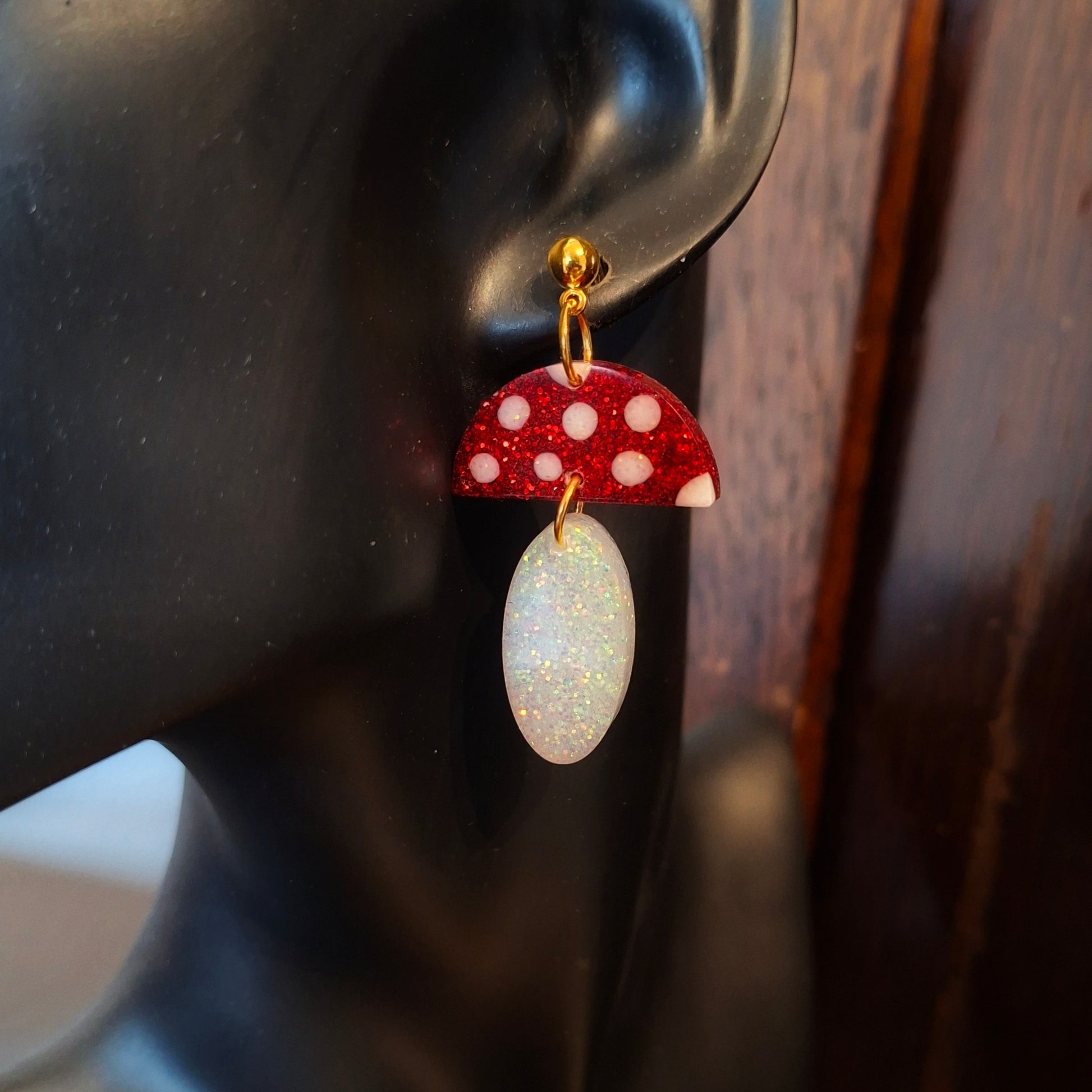 handmade resin earrings, toadstool earrings, glitter resin jewellery, woodland earrings, Irish jewellery, Christmas earrings, gold plated earrings, silver plated earrings, statement earrings, whimsical earrings, fairycore jewellery.