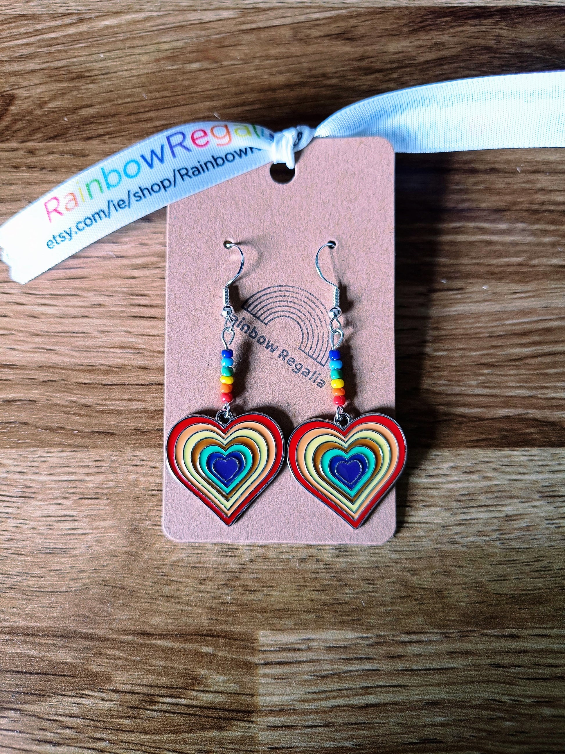 Embrace the spectrum of love and color with our enchanting earrings. These unique creations are made from repurposed glass seed beads and feature a captivating enamelled rainbow-colored heart. Hung from sterling silver ear wires, they radiate joy and charm, adding a touch of whimsy to your style.