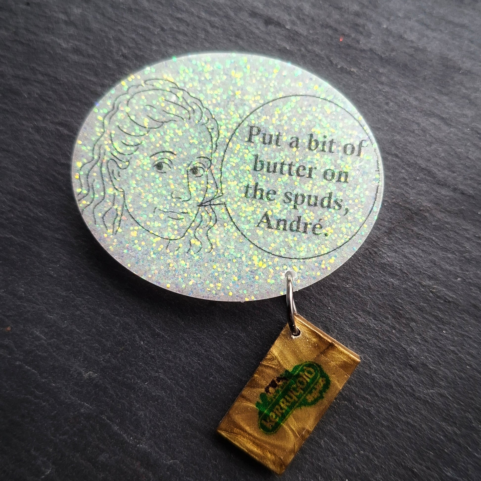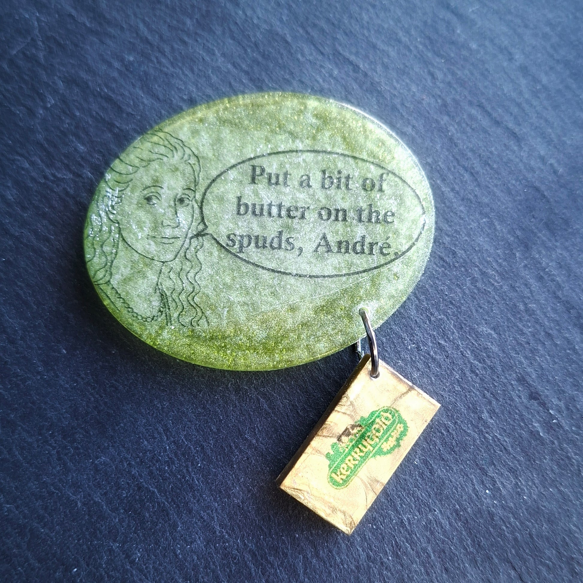 Part of the RainbowRegalia Pure Kitsch collection, this glittery magnet is crafted from resin and features a hand-drawn Irish mammy illustration alongside a tiny Kerrygold-style butter charm — because no Irish phrase is complete without it. Each piece is handmade in Greystones, Co. Wicklow, giving it a unique charm all of its own.