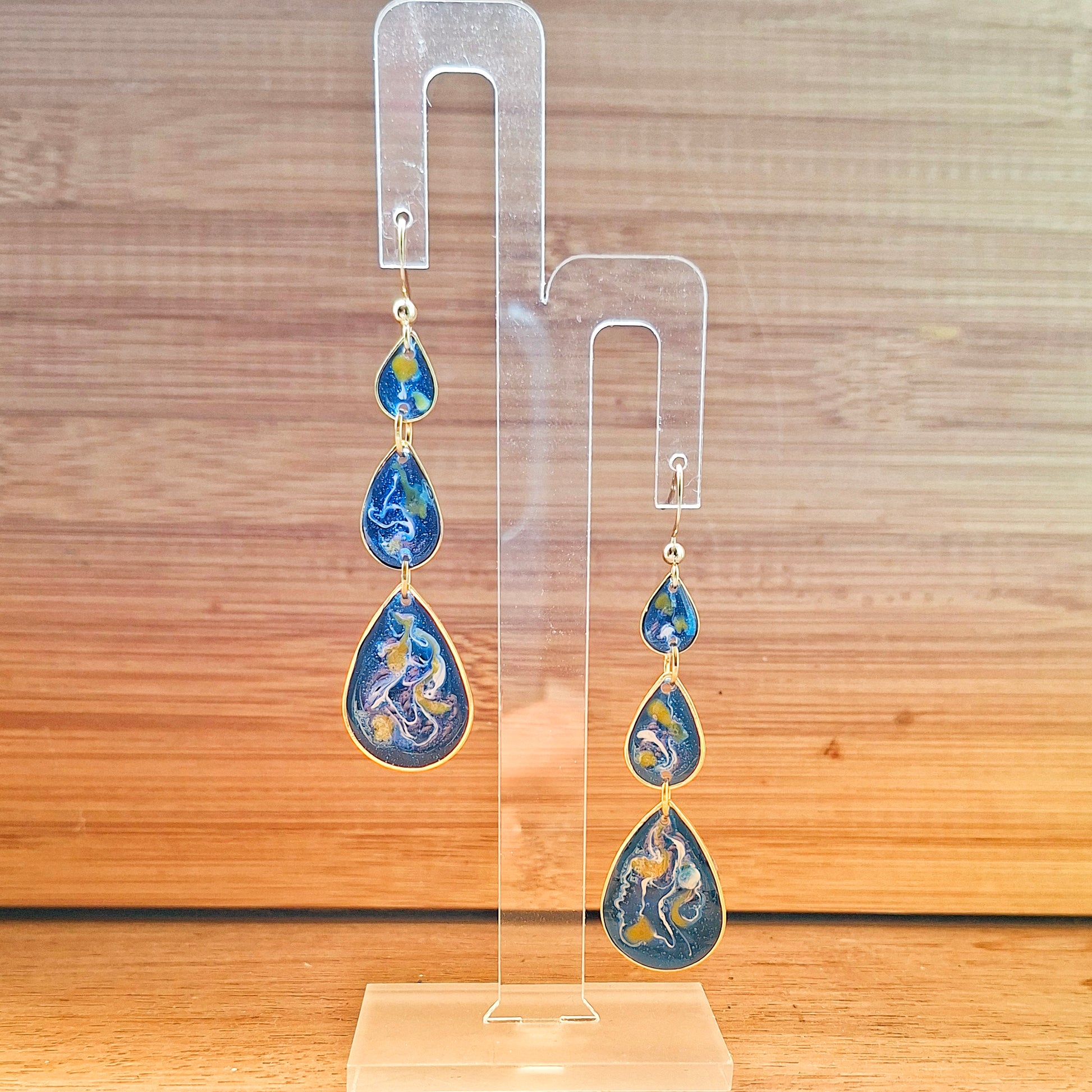 Inspired by Van Gogh’s swirling skies, these Starry Night earrings capture that same sense of movement and wonder. Handcrafted with gold-plated teardrop bezels filled with marbled resin in midnight blue, gold and soft white, each pair feels like a little galaxy of its own.