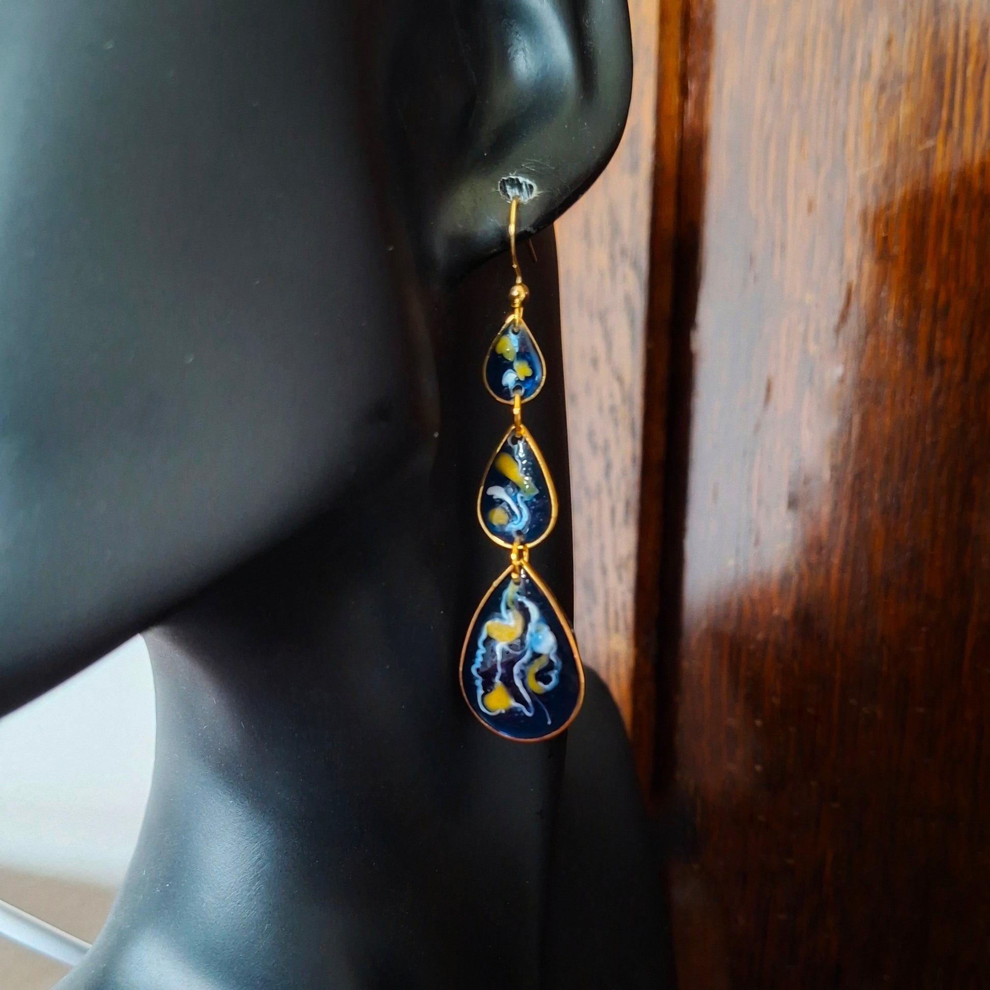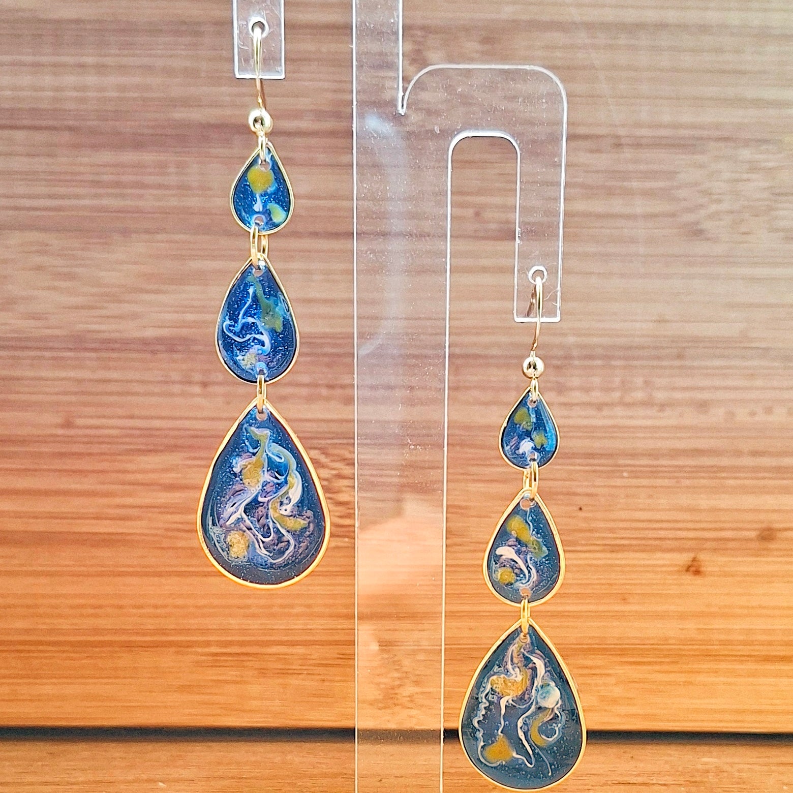 handmade blue resin earrings, gold plated teardrop earrings, celestial jewellery, Starry Night earrings, Van Gogh inspired earrings, galaxy statement earrings, Irish handmade jewellery