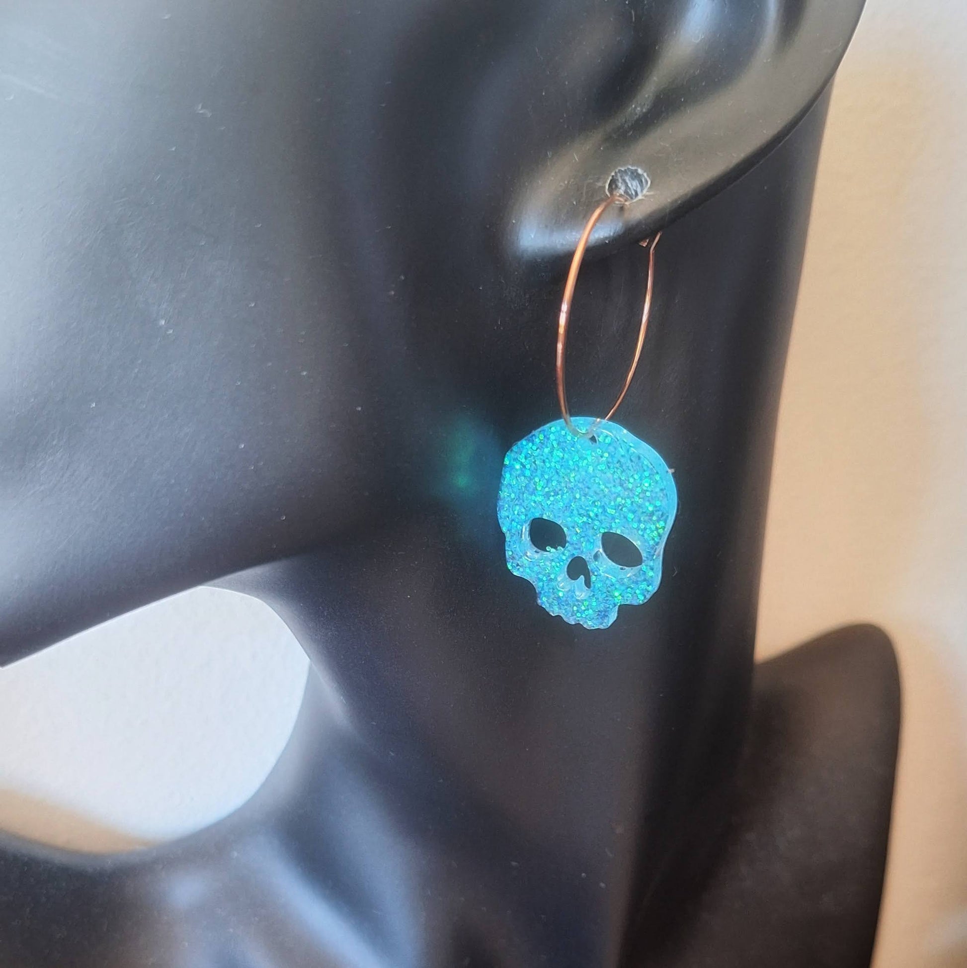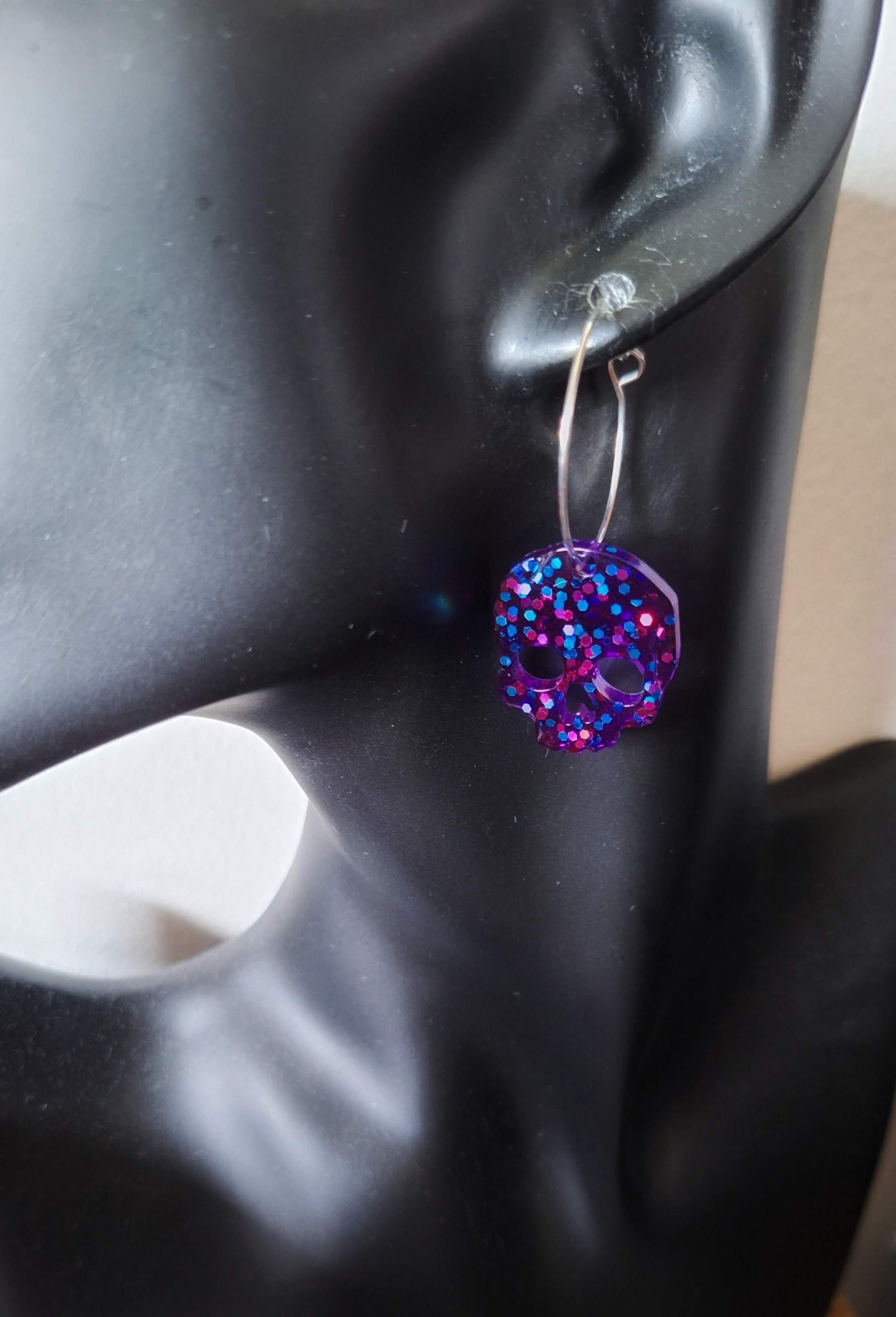 Put a skull on it! These handmade resin skull hoop earrings come in a choice of 12mm or 25mm hoops, in either silver-plate or gold-plate. Unleash your inner rebel with these statement hoops.