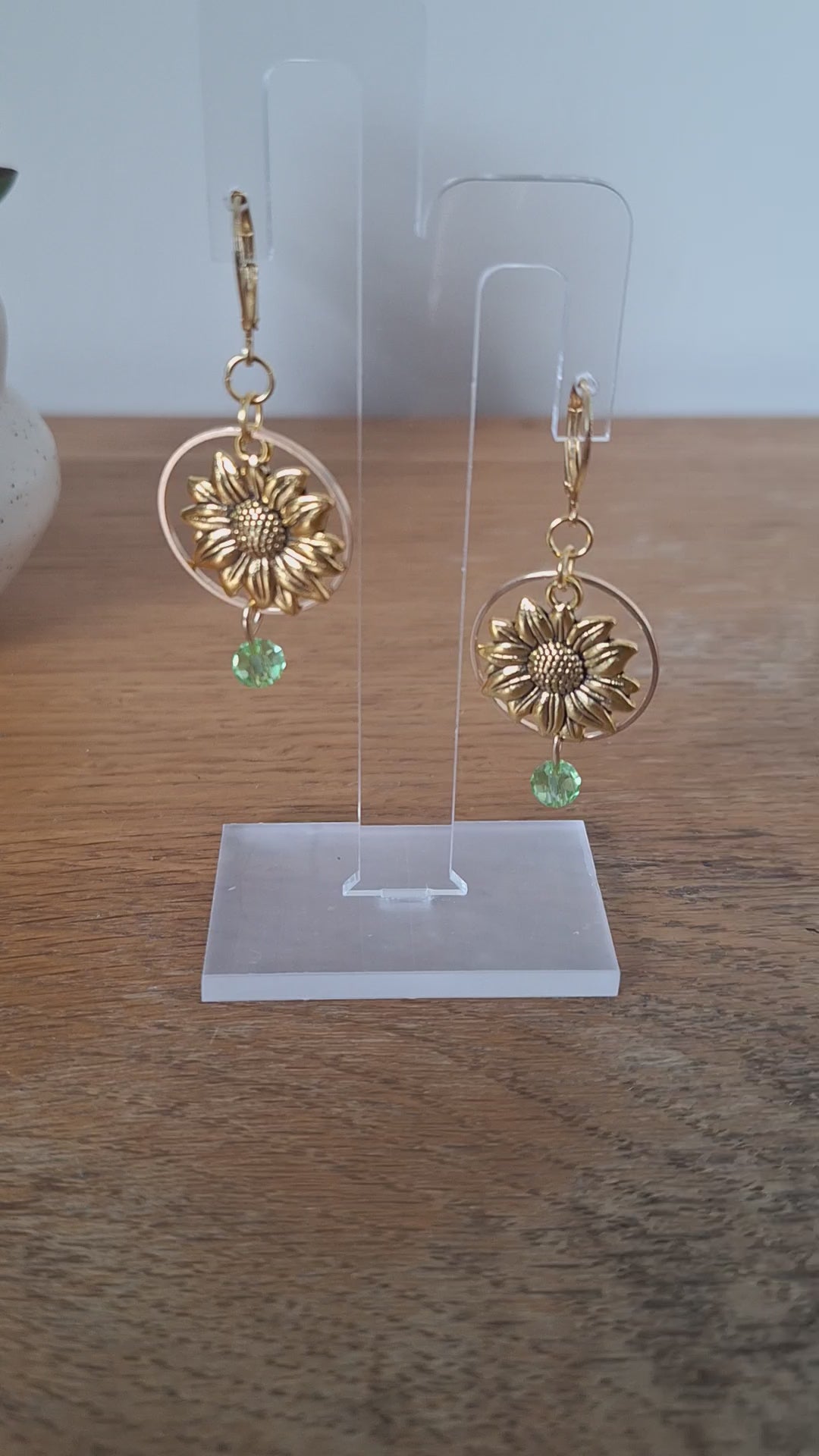 Bask in the sun's golden rays with our Summer Sunflower Earrings. These playful and quirky earrings feature repurposed green glass beads and a charming sunflower design, suspended from secure gold-plated ear wires. Be stylish and sustainable with these 52mm long earrings.