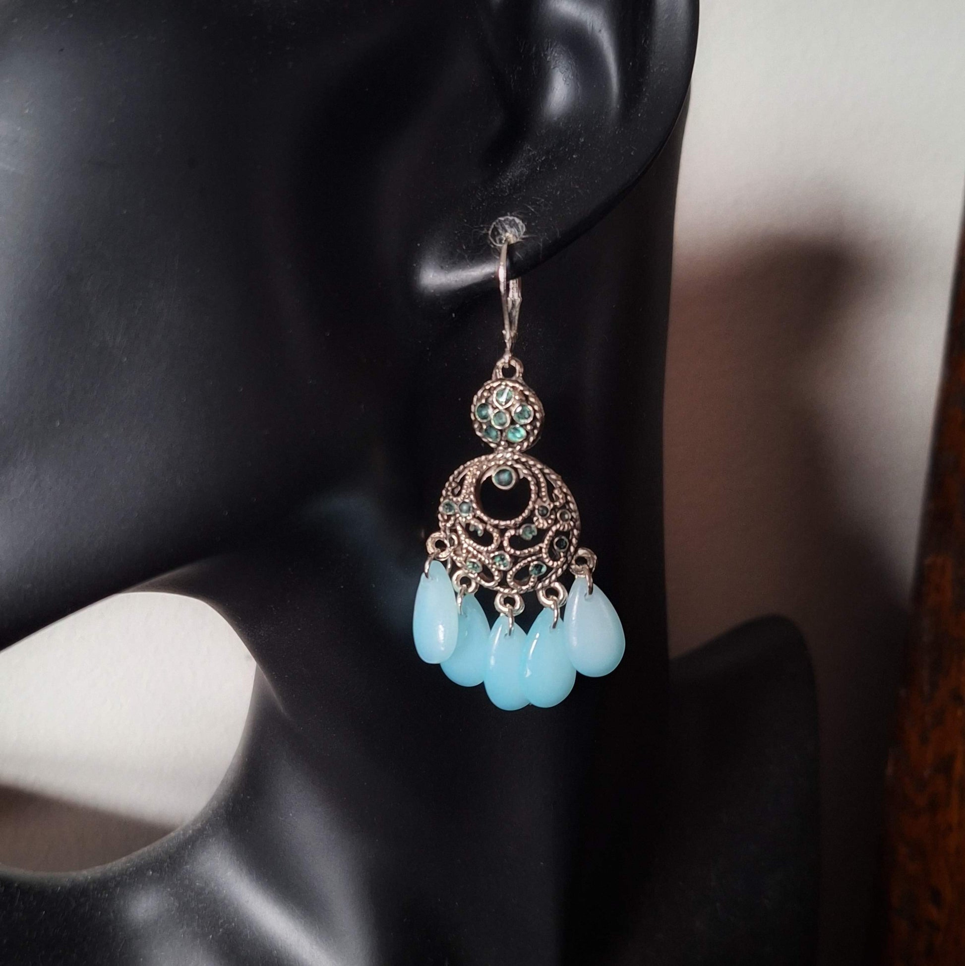 Say hello to the Sunita Chandelier Earrings – because sometimes your ears deserve a little drama (the good kind). Lovingly handcrafted from repurposed silver bits that have lived a little, they’re dressed up with pale blue teardrop glass beads and a swish of resin for that just-right shimmer.