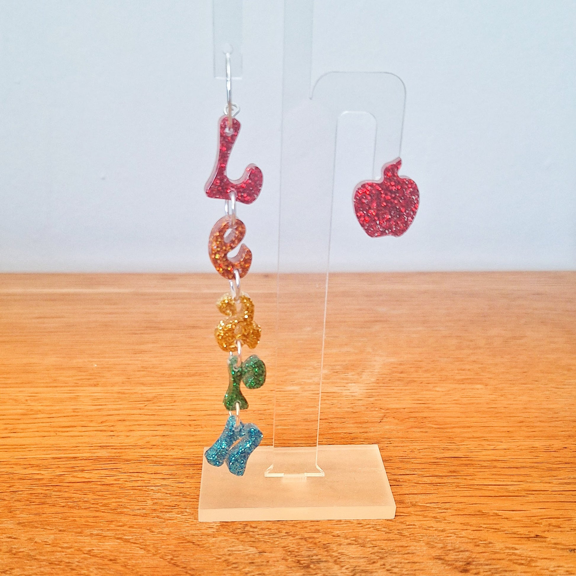 teacher gift earrings, head of the class earrings, glitter resin earrings, apple stud earrings, mismatched earrings, handmade teacher jewellery, unique hoop earrings, learn earrings, read earrings, teacher appreciation gift